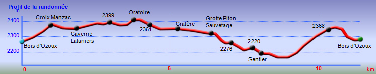 Se rendre à Bourg Murat et emprunter la Route du Volcan - Rouler jusqu'à l'aire de repos de Bois Ozoux et stationner - Débuter la randonnée par le GRR2 jusqu'au monument Josémont Lauret - Obliquer à gauche vers la croix des Feux de Manzac puis revenir au GR pour gagner la Caverne des Lataniers - Rejoindre et escalader le piton 2399 - Poursuivre jusqu'à l'Oratoire Sainte-Thérèse avant de visiter le piton 2361 - Continuer vers la coulée hors enclos avant d'escalader le Piton Sauvetage - Viser le sentier du Piton de l'Eau en visitant ou non les pitons 2276 et 2220 - Rejoindre le point de départ atteignant et contournant le piton 2368.