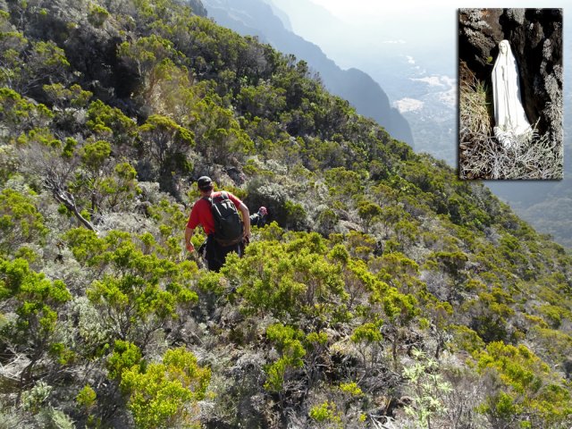 Pour l’anecdote, suite à mon reportage sur le groupe Facebook "hors des sentiers battus et idées de sorties ", un membre m’à contacté pour m’indiquer que c'est lui qui à placé la vierge dans le rempart, lors de sa descente, en suivant les traces de son papa, qui empruntait ce passage marron, pour aller visiter ses animaux dans la savane du rond.