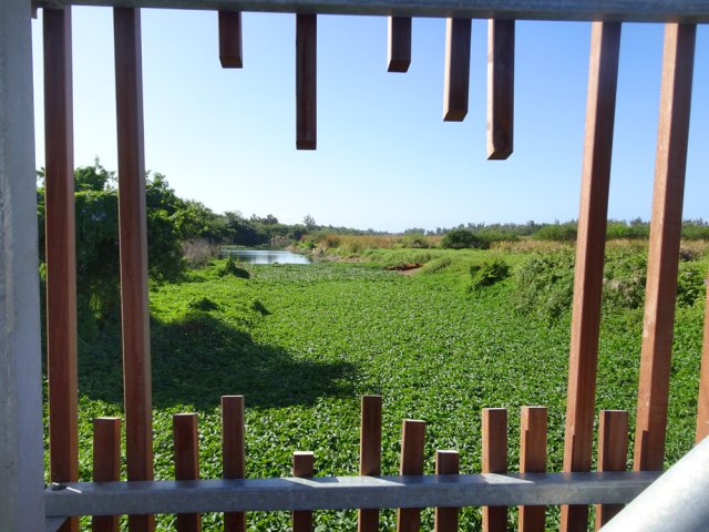 La randonnée débute au nouveau parking aménagé près de la bretelle menant à l'usine du Gol en venant du nord. Un peu de lecture avant de partir permet de se familiariser avec la vue des trois étangs et de repérer d'autres circuits (Photo 1). La première partie de cette boucle n'est pas la plus agréable par la piste sableuse et caillouteuse qui longe la très bruyante route nationale (Photo 2). Il est possible, au début, de s'approcher des berges très connues de pêcheurs qui, hélas, laissent sur place leurs déchets (Photo 3). Poursuivre sur cette piste bordée plus loin de prairies. Une concentration de tisserins a élu domicile dans cette zone qui fournit assez de graines pour nourrir les centaines d'individus bruyants et toujours affairés. Prendre un moment, surtout avec des enfants, pour étudier leur vie grégaire, leur habitat et leur technique très élaborée de couture (Photo 4). Tourner à gauche vers une ferme puis repérer, juste au prochain virage vers la droite, le sentier pénétrant dans les sous-bois. Ce large sentier ombragé, se rapproche des gravières (Photo 5). Prendre à droite au premier croisement et suivre le nouveau sentier bordé de bancs sommaires et d'emplacements pour la pêche. Repartir à droite au nouveau croisement puis poursuivre entre poivriers, papyrus et filaos (Photo 6). On longe quelques ouvrages pour l'assèchement de la zone et l'on devine même l'étang du Gol sur la gauche. Le sentier devient de plus en plus large le long de ces canaux (Photo 7). La végétation très touffue a été taillée pour en faire des tunnels facilitant le passage (Photo 8). La fréquence des passages de sportifs devrait permettre de conserver ces tunnels (Photo 9). On parvient rapidement à une tour d'observation constituée d'un escalier en colimaçon protégé par une belle armature en bois exotique (Photo 10). Quelques marches mènent à un pallier d'observation de l'étang et de la faune habitant les berges et de la typhaieZone couverte de typha, ces roseaux (ou massettes) reconnaissables aux longues quenouilles de la fleur et aux interminables feuilles. occupant une grande partie des marécages de la région. On peut aussi se rapprocher de la berge au pied de la tour pour tenter de voir de plus près les nombreuses poules d'eau (Photo 11). Poursuivre en direction de la passerelle en passant un nouveau tunnel sous les porchers (Photo 12). Après un virage à gauche, on s'approche de la Ravine Maniron désormais enjambée par un pont métallique également habillé de bois (Photo 13). On bénéficie là aussi d'ouvertures pour l'observation du paysage et de la faune (Photo 14). Poursuivre dans la plaine qui suit. Elle est envahie d'herbe mais une belle trace permet de marcher sans difficulté (Photo 15). On se dirige vers le bois de poivriers et tamarins occupant les queues de l'étang tout en contournant les bassins de la pisciculture qui ne se voit pas (Photo 16). Traverser ce bois ombragé. On parvient à la piste venant de l'Etang Salé. Préférer le sentier qui serpente entre la piste et l'étang (Photo 17). Le sol est parfois un peu sableux mais les pieds ne s'enfoncent pas (Photo 18). A la fin du sentier, continuer le tour par la piste qu'on retrouve à travers les filaos (Photo 19). La piste passe à quelques mètres des berges et il est souvent possible de s'en approcher, ne serait-ce que pour observer les poules d'eau se reposant au milieu de l'étang (Photo 20). Continuer ainsi jusqu'à la fin de l'étang (Photo 21). Plus loin, l'espace entre l'étang ou l'océan sont identiques. Il est donc possible de s'approcher de la plage de galets ou siègent quelques cairns (Photo 22) et de vieilles racines de filaos (Photo 23). Contourner les piles ruinées du pont de chemin de fer et se diriger vers le gué de la Ravine du Gol. Ce passage, qui s'effectue sur des galets, comporte peu de difficultés par beau temps (Photo 24). Par forte houle, prendre garde car les vagues viennent se briser sur les galets, rendant la traversée dangereuse. Plus haut, traverser le parking puis poursuivre vers les passerelles qu'on aperçoit tout près. Franchir ces ouvrages sans difficulté (Photo 25). Se diriger ensuite vers le coin ouest du terrain de sport (Photo 26). Continuer sur un sentier facile à repérer en face du coin du stade. Le sentier traverse des sous-bois, des friches et des jardins (Photo 27) avant de se poursuivre sur un chemin longeant des établissements de la zone artisanale. En arrivant à la Rue Vely, prendre à gauche et rejoindre le gué sur la Ravine du Gol qui se passe facilement la plupart du temps (Photo 28). Remonter le sentier en rive gauche et partir à droite pour rejoindre le parking.