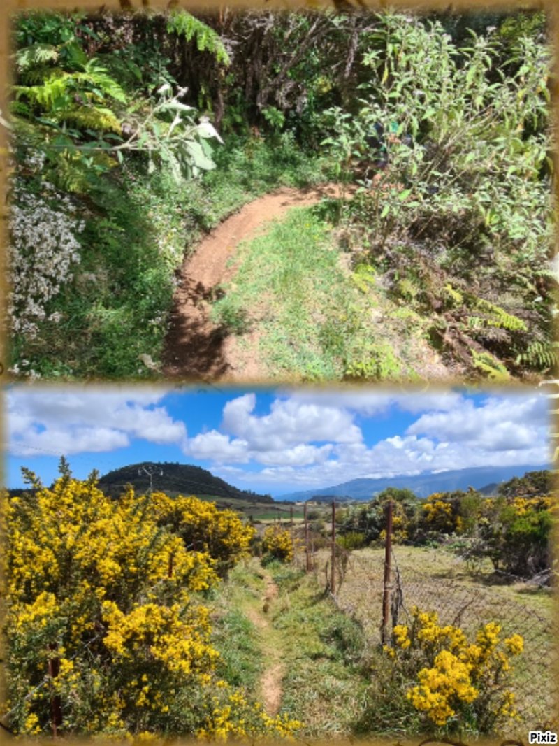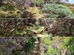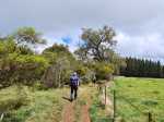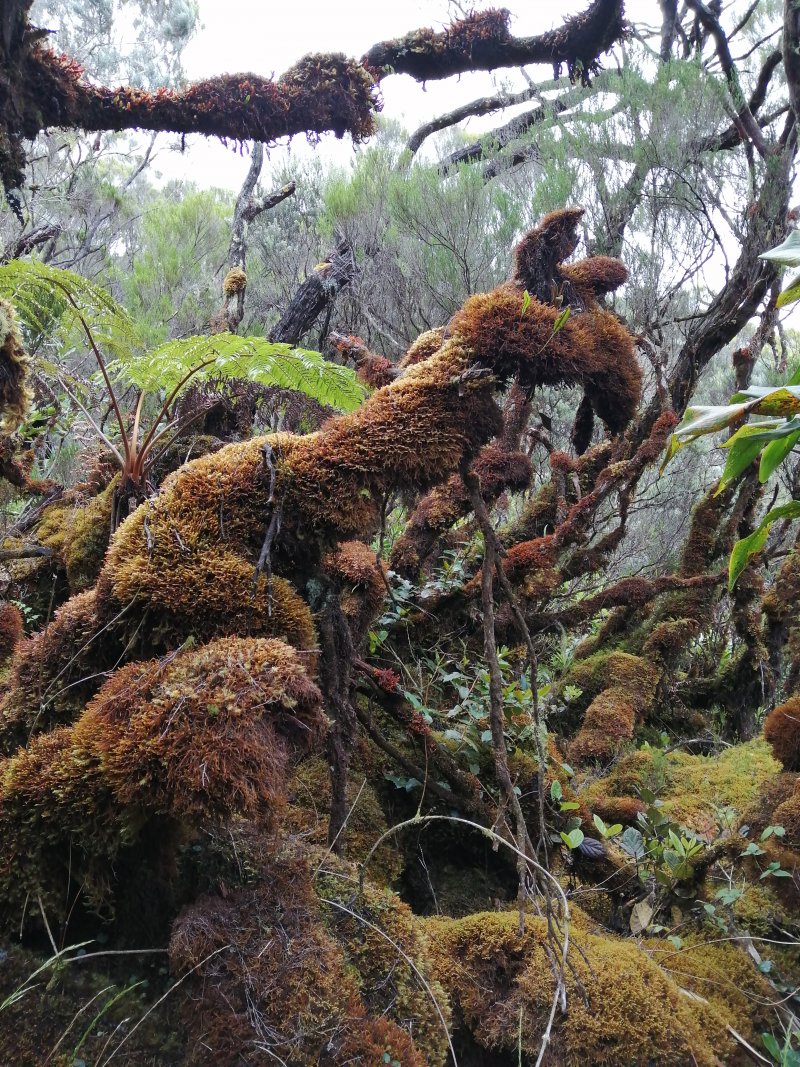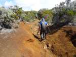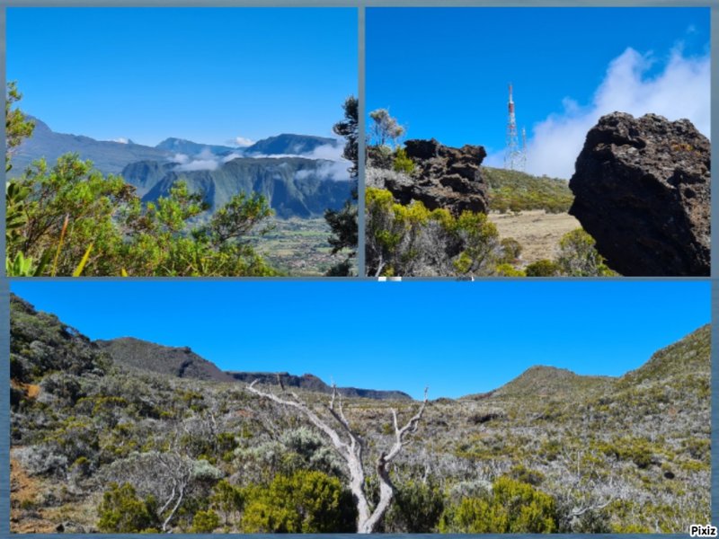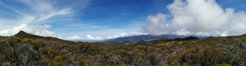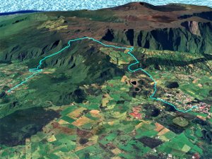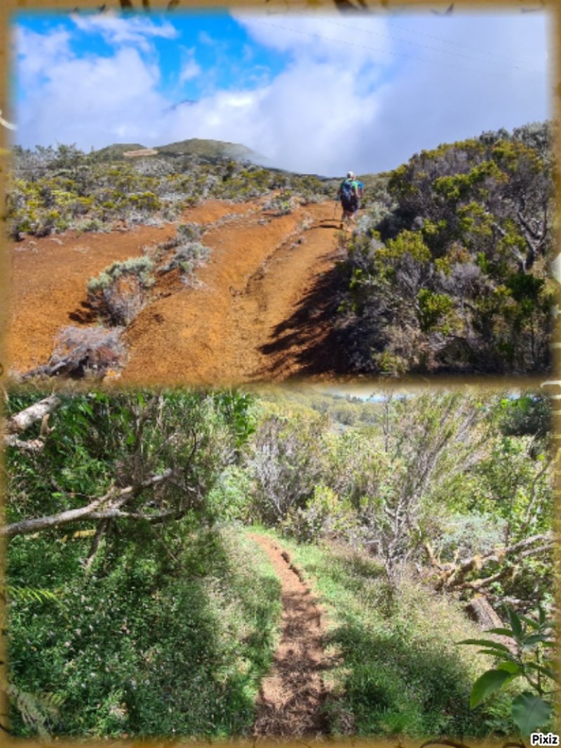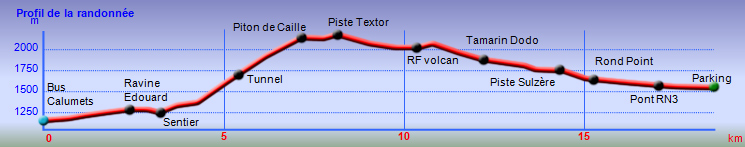 La randonnée débute ici à l'arrêt de bus du Bras des Calumets. Quelques mètres plus loin, en face du sentier remontant vers la croix du Piton des Songes, commence la Rue Emile Evan. Cette rue calme, rectiligne, sans circulation, permet d'apercevoir le Piton Textor, point culminant de cette sortie (Photo 1). Après une portion plane, quelques lacets en montée raisonnable et une descente en pente douce vers Bras Piton, la route effectue un grand virage avant d'arriver à l'aire de pique-nique du Piton Doré. Le sentier débute entre les kiosques et les cryptomerias. La pente est d'abord faible sous les conifères sur un sol constitué essentiellement de racines (Photo 2). La pente s'accentue pour contourner le cratère du Piton Doré recouvert de fanjans et bordé de cryptomerias (Photo 3). Une fois le cratère dépassé, le sentier effectue quelques virages et comporte beaucoup de raccourcis créés par les marcheurs. Rester sur la trace principale même si les racines sont encore présentes.(Photo 4). Plus haut, le sentier pénètre dans le Parc National en même temps que dans la zone de tir des militaires. Un panneau rouge est d'ailleurs là pour dissuader de quitter le sentier qui grimpe droit entre la lisière des cryptomerias et celle des bois de couleurs jaunis par les mousses (Photo 5). Plus loin, on est totalement immergé dans cette forêt semi-primaire comportant des passages techniques, de hautes marches et de rares portions planes (Photo 6). Quelques parties de cette forêt sont magnifiques avec les mousses et épiphytes recouvrant la totalité des troncs (Photo 7). Dans la montée, quelques rubalises attirent le regard. Elles ont été posées afin de signaler un trou profond au ras le sentier. Il s'agit de l'entrée effondrée d'un tunnel de lave de quelques centaines de mètres de long dont l'accès est très difficile (Photo 8). Après le gouffre, le sentier comporte de plus en plus de tronçons constitués de marches plus régulières que les naturelles rencontrées plus bas (Photo 9). On domine la Ravine Edouard sur la droite. On peut ainsi bénéficier des premiers panoramas sur la Plaine des Palmistes et le Piton des Neiges (Photo 10). Puis la pente faiblit jusqu'à devenir plate par moments. Le sentier, beaucoup plus propre serpente dans un superbe sous-bois de branles verts et d'ambavilles (Photo 11). Il traverse également quelques bosquets de petits tamarins envahis de vieux pieds de fleurs jaunes (Photo 12). La végétation disparaît graduellement et les branles verts, plus rabougris, prennent le relais. Quelques vaches parcourent les lieux. Si on ne les aperçoit pas toujours, les bouses dans le chemin les trahissent. Le sentier frôle le Piton de Caille avant de pénétrer dans une plaine herbeuse naturelle (Photo 13). Cette partie, qui peut être humide en période de fortes pluies, se traverse en quelques minutes en direction d'un petit col au pied du Piton Textor (Photo 14). La montée sur la terre rouge et les cailloux est rapide en rajoutant quelques mètres pour se rapprocher des 1000 m de D+ (Photo 15). Le paysage change encore et l'on retrouve les sentiers d'altitude avec les branles et les terres sableuses rouges ou orangées (Photo 16). Plusieurs itinéraires sont possibles du Textor jusqu'au Nez de Bœuf. Le trajet proposé contourne le Piton de Sable par le nord et file plein ouest pour éviter la route (Photo 17). A 2066 m, obliquer à gauche et rejoindre le parking du Nez de Bœuf par un très agréable parcours parfois ombragé (Photo 18). La pente est faible et la marche est une balade dans la verdure en profitant de nombreux panoramas vers la Rivière des Remparts (Photo 19). Traverser la route, rejoindre le parking puis emprunter le sentier remontant vers le sommet du Nez de Bœuf. A mi-parcours, obliquer à droite dans le bosquet de petits tamarins puis redescendre vers la route. Traverser à nouveau et pénétrer dans les prairies, guidé par les rangées de barbelé (Photo 20). Le GRR2, fortement creusé à cet endroit, est petit à petit remplacé par un autre longeant les clôtures. Bifurquer à droite au premier croisement et contourner les Trous Blancs par le nord. Si on ne les connaît pas, le tour par le sud ne rajoutera qu'une vingtaine de minutes. La descente vers les vastes zones d'élevage est rapide jusqu'aux premières clôtures (Photo 21). Après quelques virages, le sentier devient plus droit jusqu'au Tamarin Dodo qui mérite une respectueuse halte (Photo 22). Poursuivre jusqu'à la petite route sinueuse contournant le Piton Guichard. Traverser l'aire de repos et continuer sur le GRR2 bordé de cryptomerias sur un sentier large et caillouteux. Plus bas, au Grand Bras de Pontho, obliquer vers le sud, longer les prairies envahies de brandes et bordées de cryptomerias rougissants (Photo 23). Plus loin, un panneau signale la piste Sulzère. Partir à droite et longer de nouveaux pâturages envahis d'ajoncs par endroits. La pente est parfois forte sur un sentier étroit entre les clôtures (Photo 24). Prendre à droite à la fin du sentier et emprunter un très court tronçon du Chemin de la Grande Savane qui contourne le Piton Dugain (Photo 25). Au rond-point, repérer les poteaux du GRR2 et entamer la dernière partie sur une piste terreuse bordée par moment de tamarins des hauts (Photo 26). Cette piste longe au plus près le Grand Bras de Pontho, souvent caché par la végétation (Photo 27). La piste se termine à la Route des Herbes Blanches. Partir à gauche et longer la ravine jusqu'au pont de la RN3. Juste avant le pont, trouver l'étroit passage pour se rendre sous l'ouvrage et traverser pour emprunter le sentier en rive droite. Très fréquenté par les chevaux, il est malgré cela assez étroit et bordé de grands ajoncs d'Europe (Photo 28). On passe sans trop le remarquer au pied du Piton Desforges puis on termine au radier du Chemin Doret. Partir à gauche, rejoindre la Maison du Volcan ou le parking près de 