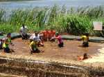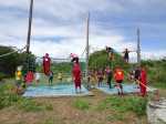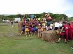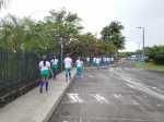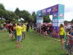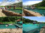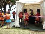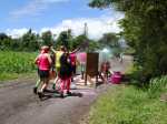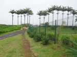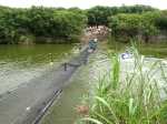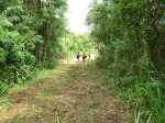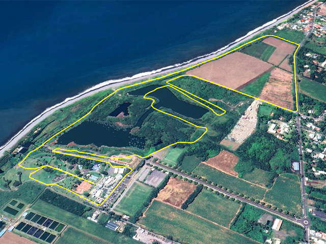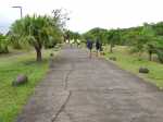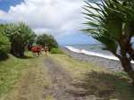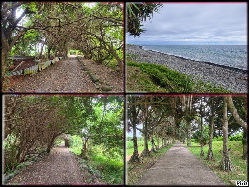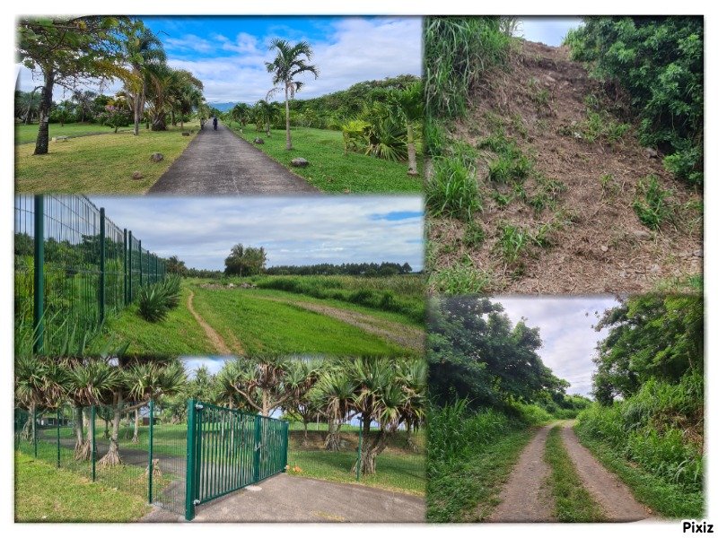 La randonnée débute au parking du Parc du Colosse de Saint-André. Franchir la porte et rejoindre l'esplanade de pelouse au bas du parc. Le circuit commence symboliquement ici (Photo 1). Emprunter ensuite l'allée bétonnée qui longe la partie nord-est où est installé le stand des bottes de paille (Photo 2). Poursuivre sur cette allée (Photo 3) et sortir du parc pour longer les clôtures de l'entrée (Photo 4). A la fin des bâtiments, reprendre à gauche et entamer la descente de l'allée là où les concurrents passent sous la canon à mousse (Photo 5). L'allée ombragée sous les vacoas mène en descente vers une sortie dans le grillage pour rejoindre les berges du Petit Etang (Photo 6). Poursuivre plein sud le long du grillage en passant près du claustro-rampe où les coureurs sont obligés de passer dans une tranchée recouverte d'une bâche noire (Photo 7). Une légère pente amène aux parkings entourés de palmiers royaux (Photo 8). Suivre ensuite la large piste labourée pour l'occasion par les pneus des camions citernes ou ceux transportant le matériel pour fabriquer les stands (Photo 9). Lors de la Tropica Dingue, un mur glissant (Vertical Walk) est installé sur la droite de la piste (Photo 10). Si l'épreuve est à la portée de tous par un grand soleil, les abandons sont nombreux après une pluie humidifiant la peinture. Obliquer sur la gauche et longer ce qui fut le Big Mix Commando, une série de murs obligeant à se contorsionner, ramper ou franchir des murs de planches (Photo 11). La piste effectue ensuite un grand virage pour se rapprocher de l'eau (Photo 12). Si les concurrents traversent l'étang sur un filet en partie immergé, le randonneur devra faire demi-tour par la piste ou éviter de venir jusque là (Photo 13). A pied, compter une dizaine de minutes pour rejoindre l'autre rive, là où les coureurs effectuent une nouvelle traversée. Après moult hésitations entre le passage de droite ou celui de gauche, ils choisissent en fonction du nombre de chutes des téméraires qui marchent ou courent avant la plongée suite à une glissade (Photo 14). La piste se poursuit en contournant le petit lac où se déroule l'épreuve du filet à grimper (Photo 15). Marcher ainsi jusqu'à la fin de l'étang (Photo 16) et grimper le haut talus menant à la Glissade, un stand aquatique représenté par un large toboggan (Photo 17). Repartir dans le sens opposé en suivant une piste parallèle à la précédente. Cette piste, large et plate, rejoint rapidement l'emplacement du Stadium, une série de trois épreuves acrobatiques au-dessus d'une piscine d'eau fraiche (Photo 18). On poursuit par le franchissement d'un nouveau talus plus raide que le précédent pour se retrouver le long d'un champ de canne à sucre bordé de cocotiers. Ces 500 m permettent de se reposer avant d'emprunter la route, non sans être passé par les nuages de poudres colorées jetées sur les participants le jour de la course folle (Photo 19). Les nouveaux 500 m sont toujours aussi faciles mais un peu plus bruyants puisqu'il faut longer la D47 (Photo 20). Prendre la première piste à gauche menant vers la mer. Le Mur Inversé installé là pour mettre fin au repos des coureurs met à mal les bras et demande une certaine technique de redressement du corps (Photo 21). Plus loin, le bruit des vagues se fait entendre mais les bras, pas encore remis du Mur Inversé devront affronter l'épreuve du Lever de Poids consistant à déposer sur une table de lourdes pierres avant de les remettre au sol (Photo 22). Même si le ressac est agréable à l'oreille, il faut affronter plus loin les baffles du DJ de la Boite de Nuit qui fait hurler de la musique en imposant à tous de danser pour montrer leur bonne humeur (Photo 23). Le chemin longeant le littoral est un vrai plaisir malgré la chaleur (Photo 24). C'est le moment de s'asseoir sur le bord de la plage de galets pour profiter du bruit reposant des vagues (Photo 25). Un peu plus loin est installé, le jour de l'épreuve, l'Echelle Humaine. Un plan incliné généreusement savonné imposant aux concurrents de se pousser ou de se tirer afin de franchir les 4 mètres à 45° (Photo 26). L'odeur du savon reste très peu sur les vêtements car on parvient plus loin à un panneau interdisant la baignade. Tout près est installée une piscine de boue où les animateurs tentent d'empêcher les participants de sortir de l'obstacle (Photo 27). La piste bétonnée se poursuit jusqu'aux portes du parc à l'ombre des vacoas. Le dernier obstacle, de la hauteur de deux containers, est impossible à manquer. Après avoir grimpé sur le plateau, les coureurs couverts de boue n'ont plus qu'à glisser ou plonger dans les piscines mises à leur disposition (Photo 20). Effectuée sans les obstacles, la sortie s'avère agréable et très facile car le plus souvent à plat. Elle peut donner l'occasion d'observer des oiseaux d'eau avant de profiter des installations du parc.