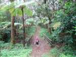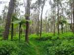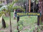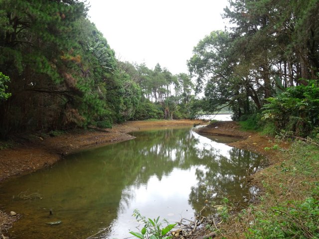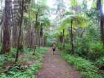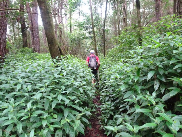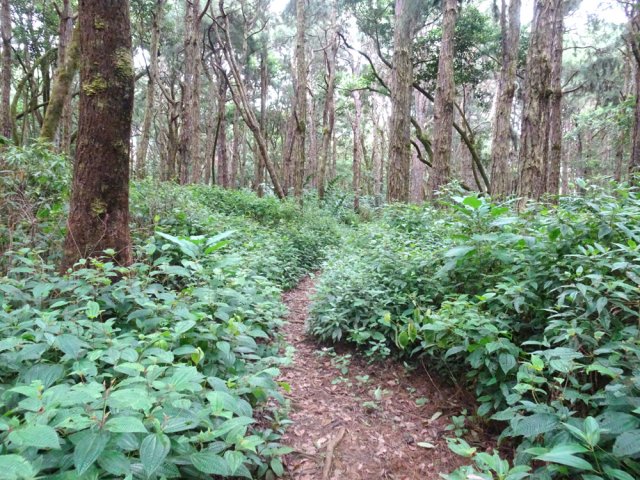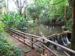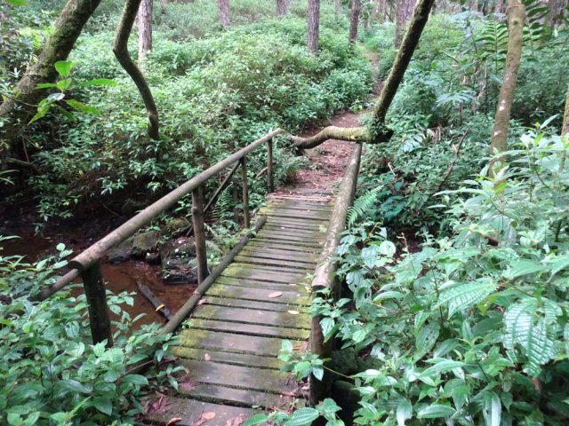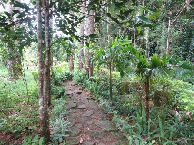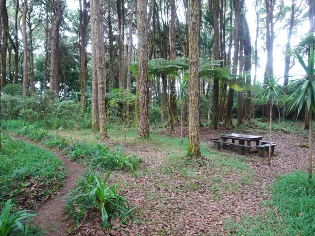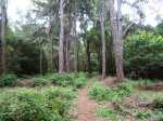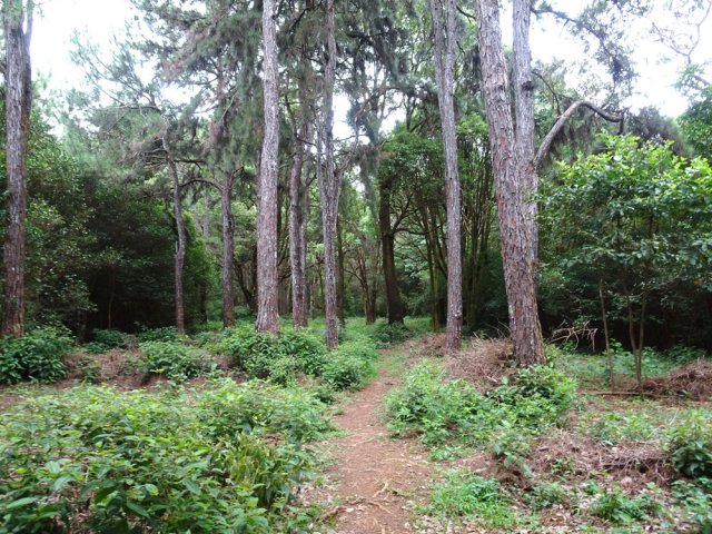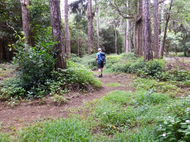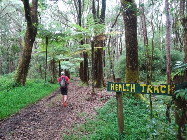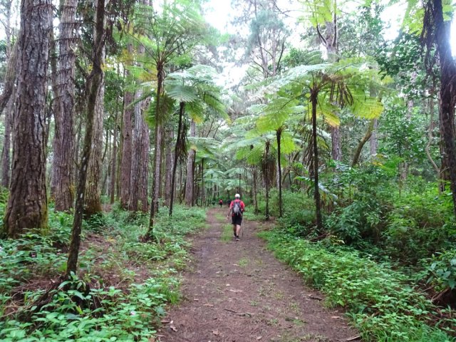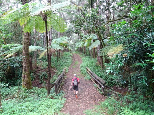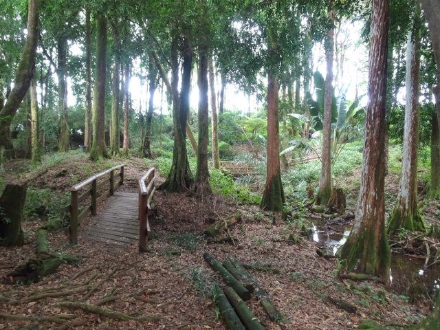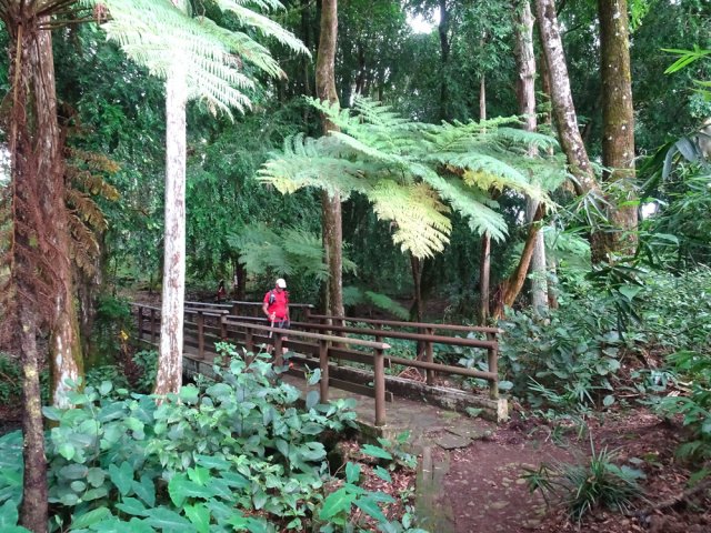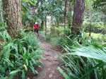 La randonnée débute au parking du centre. Avant de se lancer sur la boucle, traverser la route et gagner l'entrée par une allée bordée de barrières (Photo 1). Attention, il n'est ouvert au public que de 8 à 15 heures. En cas de fermeture, la boucle est tout de même possible à l'est de la route. On pénètre par une allée empierrée bordée de plates-bandes fleuries (Photo 2). Quelques palmiers tentent de survivre sous le couvert de grands pins créant de l'ombre pour les fougères (Photo 3). Plus loin, ce sont ces mêmes pins qui tentent de résister à l'invasion de centaines de lianes de philodendrons (Photo 4). Puis le parcours serpente à plat en s'approchant de quelques aires de pique-nique (Photo 5). Des passerelles permettent de franchir les ruisseaux parcourant la zone (Photo 6). Plus loin, un pont franchit la petite rivière coulant dans la partie la plus à l'ouest du centre (Photo 7). Les pique-niqueurs franchissent ce pont pour gagner les aires aménagées en rive gauche. Franchir à nouveau le pont et remonter la rivière en empruntant les allées pavées (Photo 8). De nouveaux emplacements ombragés peuvent accueillir des familles entières à l'ombre des grands arbres poussant sur la rive (Photo 9). Garder pour la fin, en fonction de l'heure, la visite de la serre, du Forest Museum ou du Centre et traverser à nouveau la route pour entamer la boucle. Des panneaux indiquent le départ des deux circuits proposés (Photo 10). Emprunter la piste du Health Track qui débute sous de grandes fougères arborescentes (Photo 11). Tout d'abord large et plate (Photo 12), la piste descend un peu pour franchir un ruisseau (Photo 13) puis se rétrécit par endroits, envahie de tabac bœuf ou autres invasives comme les longoses (Photo 14). Après 800 m de marche, on arrive à un croisement. Le sentier filant droit devant devient de plus en plus difficile à suivre à cause des invasives. Partir sur la gauche dans une sorte de clairière régulièrement défrichée (Photo 15). Le tabac bœuf est remplacé par les impatientes, qui, presque toute l'année, offrent de beaux tapis de fleurs de chaque côté du sentier (Photo 16). Quelques arbres remarquables demeurent entre les milliers de pins (Photo 17). En marchant silencieusement, il est possible d'y observer des singes mais également des oiseaux. Après 500 m vers le nord, repérer la suite de la boucle partant sur la gauche. Poursuivre cependant vers le lac pour marcher un peu sur la rive où des traces montrent que des randonneurs aiment en parcourir les abords (Photo 18). Des pêcheurs s'adonnent même à leur sport favori en partant de la route et de la digue. La marche est agréable entre l'eau du lac et la lisière de la forêt de pins donnant parfois l'impression de randonner dans les Landes. Reprendre le sentier et poursuivre à droite sur la boucle officielle. Le passage est de plus en plus étroit mais on ne cherche jamais le sentier des yeux. Il contourne un peu plus loin un bras de la réserve (Photo 19). On retrouve les tabacs bœuf à travers les pins (Photo 20). Le terrain est moins plat et descend parfois de quelques mètres pour franchir un ruisseau sur des passerelles en bois (Photo 21). Ces petits ruisseaux sont bordés d'autres essences que les pins. Il est agréable de voir leurs tiges biscornues qui tranchent avec les troncs rectilignes des conifères (Photo 22). Les longoses, habituellement les plus fortes en invasion, ne parviennent pas à prendre la place du tabac bœuf (Photo 23). Le bruit de la circulation se fait entendre mais le sentier bifurque sur la gauche pour éviter le goudron. La progression se poursuit dans le même genre de paysage (Photo 24). Une heure après le départ, on s'approche du parking sous les pins où l'on retrouve quelques fougères arborescentes (Photo 25). Il reste le circuit de l'ébène, très difficile à suivre et les installations du Centre s'il n'est pas fermé.