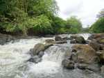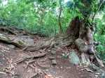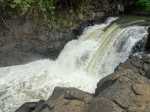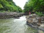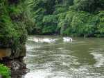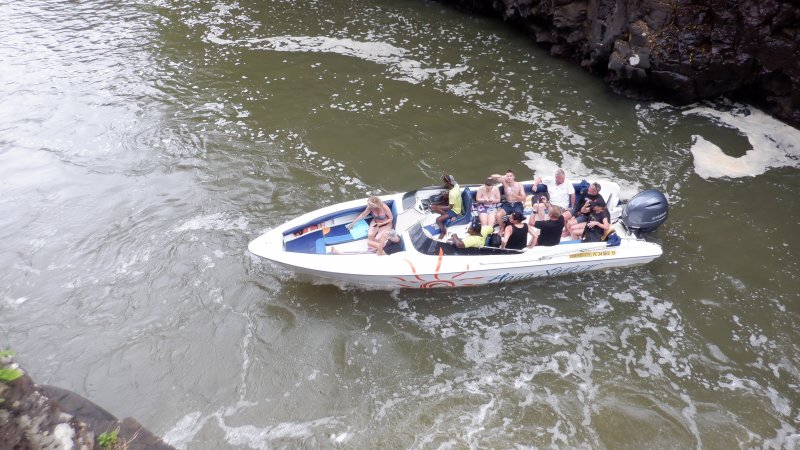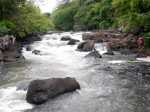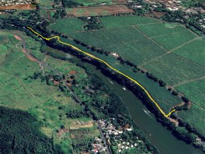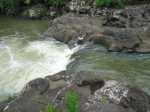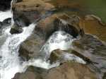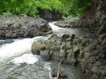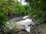 La randonnée débute ici au plus près du village de Grand River South East afin de remonter la route pavée longeant la rivière. Hélas, défoncée par les engins agricoles elle a beaucoup perdu de sa superbe du siècle dernier. Il est également possible de partir du rond-point de la B28-B112 pour une marche plus courte. Stationner dans le virage, 300 m avant l'embarcadère. Rejoindre l'espace entre les champs de canne et le bois couvrant les berges (Photo 1). La route pavée, sans doute le seul moyen de passage avant la construction de la B112, a très mal vieilli mais se remonte symboliquement pour un court pèlerinage de moins d'un km (Photo 2). On rencontre à la fin de la "route" le sentier venant du rond-point (Photo 3). Repérer celui qui descend en direction de la rivière dans une végétation assez touffue (Photo 4). La descente est glissante sur la terre et les feuilles mais le sentier est très court (Photo 5). Le bruit de la cascade à moins de 10 m du sentier est assourdissant (Photo 6). Se rapprocher de la rivière pour repérer de minuscules bassins ou des marmites en formation, sans doute depuis des millénaires (Photo 7). Au plus près de la chute, une vasque plus grosse que les autres donnerait des envies de baignade aux touristes amassés dans les barques s'ils pouvaient l'apercevoir. Les habitants de la région la connaissent et la pratiquent à longueur de semaine (Photo 8). Ils voient les barques passer mais ne peuvent guère discuter tant le bruit de l'eau est fort (Photo 9). Les rochers plats qui bordent la rivière permettent de se promener à l'envie pour avoir d'autres angles de vue (Photo 10 & 11). On peut même assister aux "embouteillages " de bateaux tentant d'arriver les premiers dans le cul de sac (Photo 12). Si la baignoire est libre il est envisageable de se baigner de manière très ludique. Sinon, remonter la rivière en débutant par un sentier bien visible dans la végétation (Photo 13). Très vite, la trace cesse et l'exploration se poursuit en choisissant le meilleur passage. On peut ainsi aller à la rencontre de rapides parfois dangereux (Photo 14) ou de grands bassins d'eau plus calme (Photo 15). Parfois, la falaise est trop verticale pour poursuivre sur la berge (Photo 16) mais des contournements sont possibles au prix de quelques hautes marches et acrobaties sans danger (Photo 17). En remontant vers le pont de la B28, le torrent conviendrait très bien à des kayakistes (Photo 19). Profiter de cette courte aventure pour se rapprocher du bord (Photo 20) et observer les sculptures naturelles offertes par la nature (Photo 21). Avec du temps devant soi, il est possible de remonter une longue partie de cette rivière originale (Photo 22). Quand le soir tombe, faire demi-tour lorsque la rivière devient plus calme (Photo 23). A la fin de la journée, lorsque le soleil baisse à l'horizon, des cris se font entendre dans le sous-bois. Le ballet des roussettes partant pour la nuit rechercher des fruits débute alors (Photo 24). L'énorme manguier que l'on rencontre dans le sentier de remontée est le premier visité (Photo 25). On trouve au sol des mangues mordues et sans doute échappées des pattes griffues de ces grands chiroptères. Reprendre la piste pavée en descente puis regagner le véhicule.