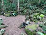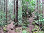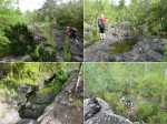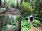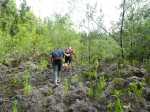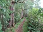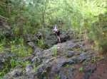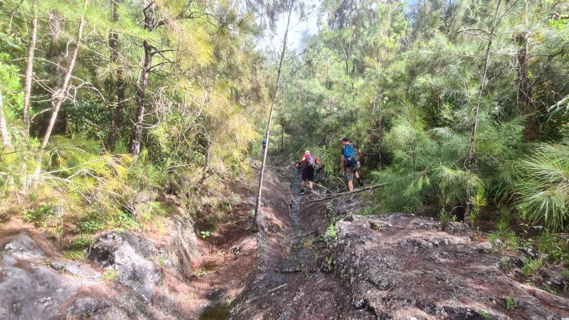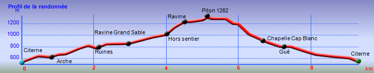 La randonnée débute au réservoir de Grand Galet, départ classique vers la Plaine des Sables par un sentier tout en montée destiné aux marcheurs sportifs. Le sentier n'a guère changé depuis la parution de la remontée jusqu'à la Plaine des Sables. Il est large et plat jusqu'à l'oratoire sur la droite puis jusqu'au gué traversant la Grande Ravine. Il alterne parties terreuses ou rocheuses (Photo 1). Les cultures, florissantes il y a encore 20 ans, sont de plus en plus abandonnées. Il subsiste quelques pieds d'ananas et des bananiers avant de pénétrer sous le couvert des arbres (Photo 2). Le sentier monte de plus en plus fortement et passe devant celui qui donne accès à l'arche naturelle. Il se poursuit en frôlant le point de vue sur la cascade que l'on distingue de moins en moins et se termine en descente avant de franchir le gué de la Ravine des Sept Bras (Photo 3). Traverser la pelouse bien entretenue puis entamer la montée vers la Plaine es Sables. Aussitôt, dans le talus, débute un autre sentier sur la gauche. Il se dirige entre murets et végétation vers les anciens emplacements de l'Îlet de Cap Blanc (Photo 4). Très vite on traverse des zones planes avec des murets de tous côtés (Voir § ci-dessous). Puis le sentier, large et facile à suivre, se poursuit vers le nord. La pente est faible et la marche aisée, sans chercher l'itinéraire (Photo 5). Après des sous-bois sous les filaos, dans les goyaviers ou les jouvences, le passage s'élargit et se creuse (Photo 6). Plus loin, ce sont les branles et les fougères qui annoncent la Ravine de Grand Sable (Photo 7). Après un virage vers la gauche, le sentier se termine à la ravine au fond basaltique lisse et glissant. Quelques bribes de sentiers touffus permettent de contourner des bassins en rive gauche (Photo 8). Par temps de pluie, il est possible et agréable, voire ludique, d'effectuer la remontée par les basaltes. La pente est parfois forte mais les possibilités de trajets sont nombreuses dans ce lit bordé de filaos (Photo 9). Les hautes marches sont fréquentes mais sans difficultés (Photo 10). Il faut parfois escalader un peu sans danger, éviter des flaques ou de profondes cavités (Photo 11). Quelques cairns indiquent des passages de marcheurs, sans doute rares, invitant à quitter le lit pour arpenter le plateau dominant la rive gauche. La suite est de plus en plus envahie de bois de chapelet et de jeunes filaos car les cyclones qui nettoient tout sont assez rares (Photo 12). Si l'on monte trop haut, on se retrouve devant le mur infranchissable d'une cascade à sec. Le mieux est donc de rejoindre le petit plateau sur la droite où des traces de sentiers sont facilement repérables (Photo 13). L'aventure débute sur ce plateau envahi de plantes basses, principalement de branles verts. Longer le bord du ravin que forme le canyon de la Ravine de Grand Sable (Photo 14). On devine par endroits le fond de la ravine et la cascade à sec qui confirment qu'il est préférable de suivre la rive en hauteur (Photo 15). Si la marche est facile sur un semblant de sentier, les affaires se corsent en parvenant à la lisière du bois. Entamer une trentaine de mètres, en véritable hors sentier, en restant au plus près de la ravine. On se retrouve assez vite sur un passage de toute petite ravine à sec qui ressemble par endroit à un très ancien sentier. Il est très envahi de goyaviers, pimpins, pailles sabres et de magnifiques bois corail (Photo 16). L'effort est intense pour enjamber sabres, troncs et sortir des dépressions. En revanche, peu d'hésitations sur la direction à prendre. On est toujours au plus proche de la vallée que l'on devine à travers la végétation (Photo 17). Il faut tout de même compter une heure d'efforts parfois intenses pour parvenir à l'altitude de 1200 m (Photo 18). La pente cesse. On rencontre une zone rocheuse mi-ravine, mi-effondrement assez difficile à pratiquer en raison des roches moussues et des trous fréquents (Photo 19). Délaisser le chaos et partir légèrement à gauche pour rejoindre sur le terrain ce qui est désigné comme une ravine sur la carte. Si ravine il y a, elle ne doit pas couler fréquemment car rien au sol ne la trahit. Seule une végétation tout aussi touffue qu'à la montée en recouvre le fond (Photo 20). Il faut sans cesse tâtonner ou s'aider du GPS pour s'imaginer être sur cette pseudo ravine. Sans l'appareil, il serait très facile de s'égarer. Attention donc de bien vérifier les batteries avant de se lancer car, sans soleil, on a vite fait de tourner en rond sans s'en apercevoir. On retrouve le sentier de Grand Pays avec soulagement. Partir à droite et grimper un peu quelques lacets jusqu'au rein bordé de filaos. Un sentier discret débute à gauche d'un lacet. Il se dirige vers le sommet d'un piton situé à 1262 m d'altitude (Photo 21). Peut-être était-il utilisé par les habitants isolés dans la région du Bras de Grand Pays ? Reprendre le sentier principal et poursuivre sans hésitation entre les milliers de grands filaos plantés là un demi-siècle en arrière (Photo 22). On retrouve également des traces de présence humaine tout au long du parcours (Photo 23). Les filaos sont omniprésents et la marche s'effectue souvent sur des tapis d'aiguilles (Photo 24). Le sentier, tantôt terreux, tantôt empierré, amène rapidement à la chapelle de Cap Blanc qui a remplacé celle de l'époque où le village comptait des dizaines d'habitants (Photo 25). Les articulations mises à mal dans les lits de ravines et les montées sportives commencent à détester les pierres encombrant le sentier (Photo 26). Des touffes de bambous bordées de murets annoncent l'arrivée proche de la Ravine des Sept Bras (Photo 27). Franchir à nouveau le gué sans forcément marcher sur les galets car les chaussures très sales sont alourdies par la terre noire de Grand Pays (Photo 28). La fin du parcours s'effectue par le sentier classique finissant à 