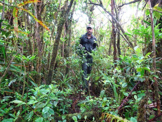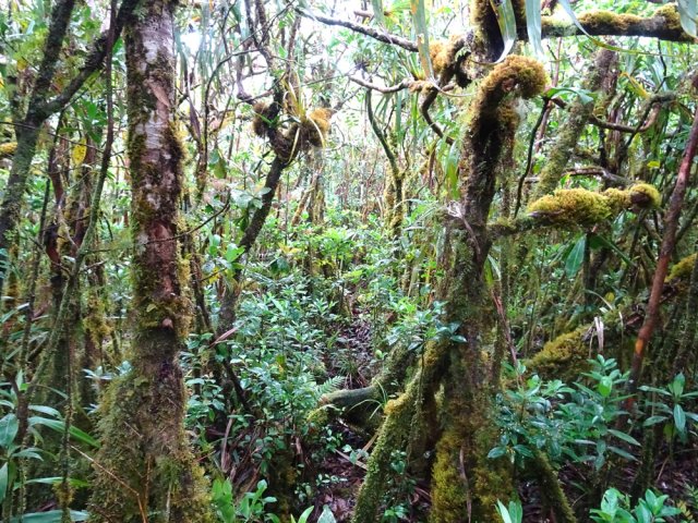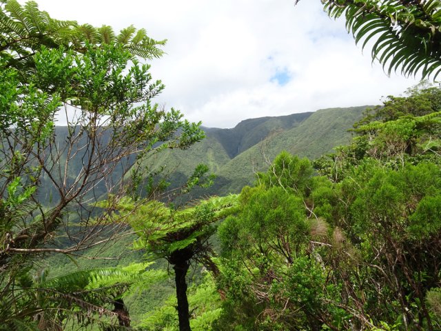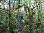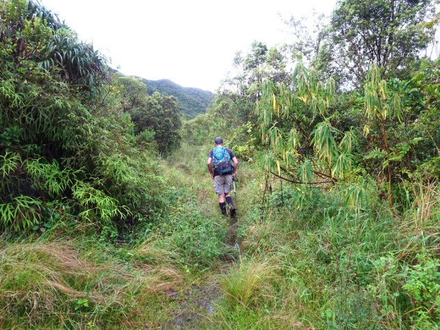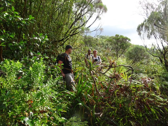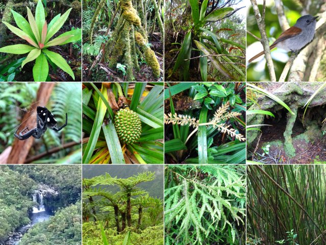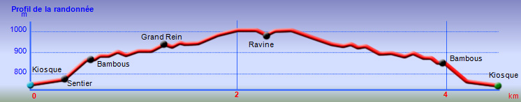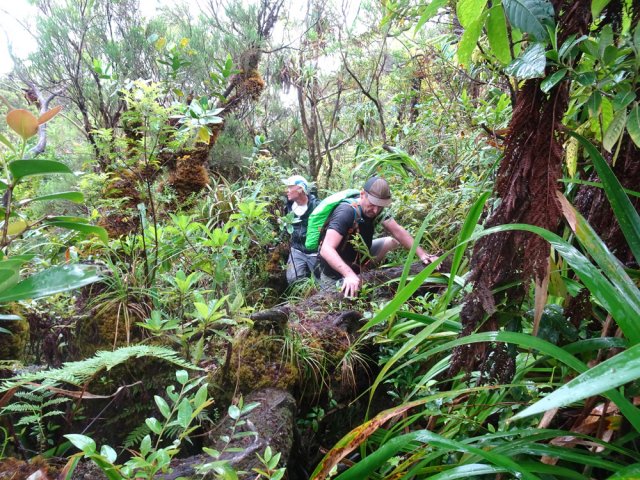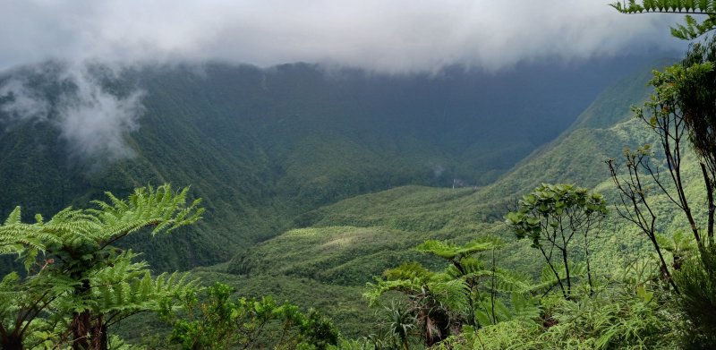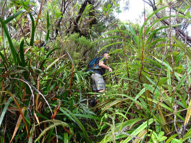 La randonnée débute au premier parking de l’Éden, proche d'un petit kiosque. Le sentier traversant la Forêt des Lianes en direction du Trou de Fer débute à une dizaine de mètres. Cette ancienne piste est envahie de plus en plus et seule une trace étroite demeure (Photo 1). Le reste de ce magnifique parcours est abandonné par l'ONF. Après 300 m, garder les yeux sur la gauche pour repérer le sentier discret qui peut se confondre avec deux rigoles à quelques mètres. Pénétrer dans le sous-bois par une courte montée glissante (Photo 2). Contrairement au point de départ, le sentier devient très évident à suivre même s'il est rarement large. Durant toute la montée, il restera visible, ne demandant que de rares questionnements pour rester sur la trace (Photo 3). Malgré le terrain glissant, la montée s'effectue rapidement sur une bonne pente (Photo 4). Le cheminement traverse une forêt variée déjà moussue sur un sentier toujours correct (Photo 5). Après 100 m de montée, les points de vue sur le Morne des Lianes sont souvent cachés par les branches (Photo 6). Les derniers mètres sont assez pentus mais les mains trouvent toujours un tronc pour se maintenir (Photo 7). Une ultime montée glissante amène à La Ligne des Bambous où les touffes sont déjà très nombreuses (Photo 8). Prendre à droite et poursuivre sur le sentier un peu caché par les bambous tombés au sol (Photo 9). Le dernier cyclone a un peu malmené les touffes. Les mains suffisent pour écarter les tiges penchées (Photo 10). 15 minutes plus tard, les bambous sont toujours là, bordés de plus en plus de fougères et de pailles sabre du côté de La Rivière des Roches (Photo 11). Toujours aucune difficulté pour suivre la trace, ce qui laisse présager une belle sortie à peine aventureuse (Photo 12). Les sous-bois moussus sont de plus en plus présents, principalement constitués de gros branles tortueux (Photo 13). A l'approche du Grand Rein, on semble s'être enfin débarrassé des bambous pour retrouver la classique avoune Association végétale des climats humides de La Réunion se développant au-dessus d'elle-même en couches successives, les nouvelles couches recouvrant les plus anciennes. de La Réunion. Comme toujours sur ce type de végétation, il faut faire attention où poser les pieds car on a vite fait de passer une jambe entière dans les trous formés dans l'avoune. Les épiphytes se multiplient et on rencontre de plus en plus d'orchidées, fougères et ananas marrons. L'enchevêtrement des branches impose parfois de se baisser sans jamais ramper vraiment (Photo 14). La pente est régulière, jamais forte (Photo 15). Bien regarder où mettre les pieds quand l'épaisseur de l'avoune est importante (Photo 16). Les panoramas sont toujours aussi rares même sur le haut de la crête du Grand Rein. On aperçoit parfois des cascades du Bras des Lianes sur la droite ou la vallée du Bras Pauline, très encombrée par la forêt sur la gauche (Photo 17). Les pimpins se multiplient, souvent couverts de mousse, avec quelques fruits hérissés (Photo 18). Le sentier atteint le Grand Rein. La large vallée de La Rivière des Roches et de ses affluents permet également d'y apercevoir bassins et cascades (Photo 19). Le sentier est toujours aussi facile à suivre. Des efforts sont nécessaires pour enjamber les troncs couchés au sol, créant des occasions de chutes (Photo 20). Quelques portions se font à plat au milieu de la végétation (Photo 22). Par beau temps, c'est un plaisir de traverser cette forêt pour y prendre de beaux clichés de nature (Photos 23 et 24). Le sentier se met soudain à descendre assez fortement, créant de nouvelles occasions de chutes. On parvient à une petite ravine très bien venue pour laver mains et chaussures (Photo 25). Il faut marcher dans la ravine pour trouver des suites de sentier qui transforment alors cette sortie en aventure. Faire demi-tour par le même sentier en profitant de nouveaux panoramas en direction de la vallée de La Rivière des Roches (Photo 26). Avec la fatigue de ces deux heures à n'effectuer que 2 km, les passages d'avoune sont rendus plus délicats pour éviter les trous entre les mousses et racines (Photo 27). Quitter le Grand Rein, pénétrer à nouveau sur le plateau occupé par les bambous et marcher jusqu'au sentier venant de l’Éden emprunté trois heures auparavant (Photo 28). Sur la petite carte, le trait vert le long de La Ligne des Bambous indique notre parcours TRÈS sportif pour rejoindre la route de l’Éden ; nous le déconseillons puisque même les braconniers n'y passent plus !