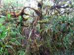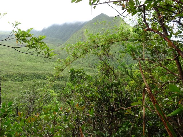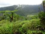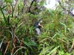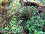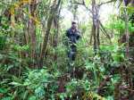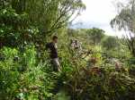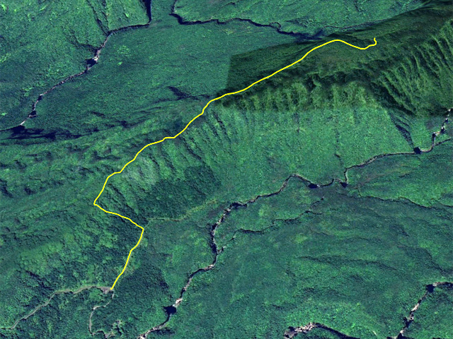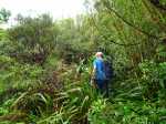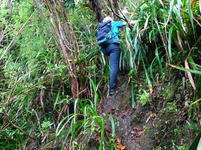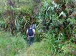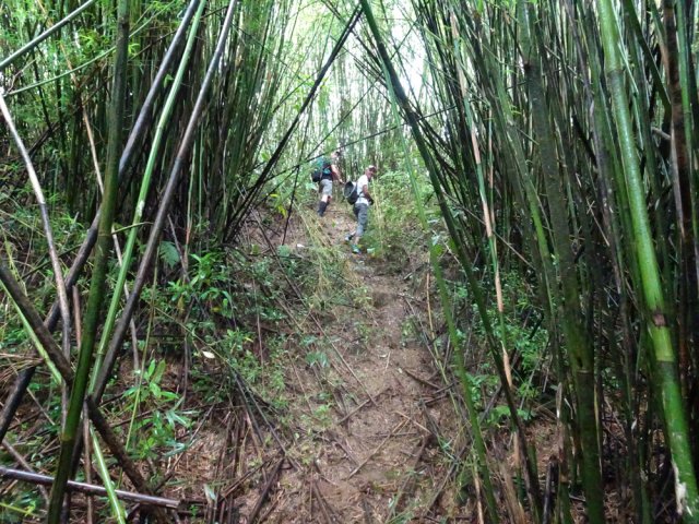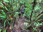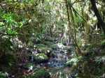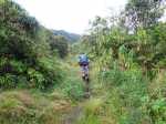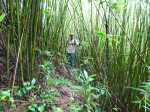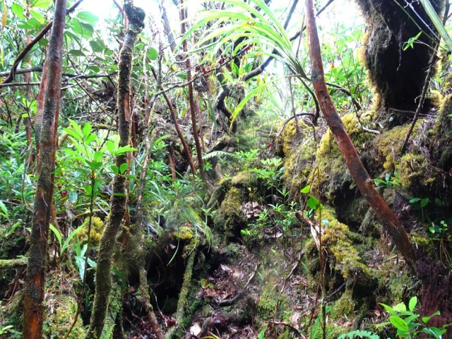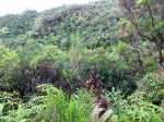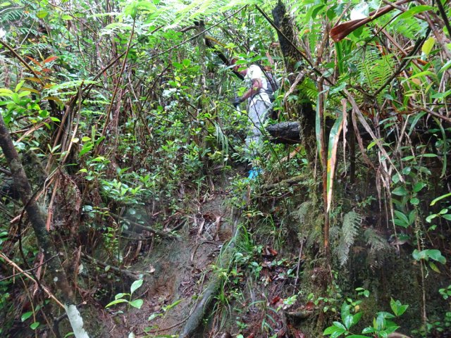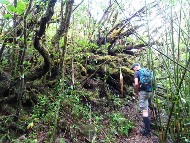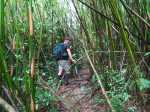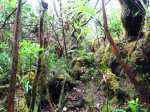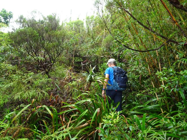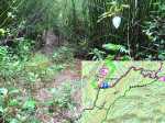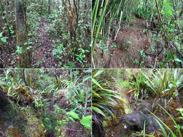 Toutes les forêts de l'île sont parcourues de dizaines de sentes, créées par les braconniers ou les forestiers. Il faut tenter de les repérer en cherchant des traces perpendiculaires aux sentiers. Cette sente, repérée entre deux minuscules ravines, permet de visiter une importante superficie de bambous dépassant celle, déjà impressionnante, de la région des Hauts du Brûlé le long du sentier Laverdure. Ils poussent si dru que même les goyaviers n'arrivent pas à les déloger, sans doute par manque de lumière. Le sentier qui traverse cette grande bambouseraie est encore facile à suivre malgré les bâtons cassants qui l'encombrent. Il reste heureusement les grands branles moussus qui colonisent les bords de remparts à partir de 800 m. Les beaux spécimens de bois de couleurs sont rares mais la forêt reste toujours très belle, proposant à chaque pas une nouvelle curiosité de la nature. Cette montée du Grand Rein prend fin ici à la première ravine rencontrée car le sentier devient plus difficile à suivre. Nous avons effectué une boucle afin de traverser en totalité la forêt de bambous jusqu'au départ du Sentier de La Caroline. Moins empruntée par les braconniers, la trace est très envahie de tiges tombées au sol et se perd parfois des yeux. L'itinéraire de la Photo 28 peut donner des idées aux aventuriers courageux ayant un bon sens de l'orientation.