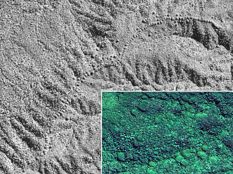 Les cryptomerias utilisés au siècle dernier sur l'île pour délimiter les parcelles domaniales ont grandi et se voient bien depuis le satellite. Ils ne se sont que rarement reproduits, gardant leur implantation rectiligne. A la même époque, des bambous ont été également plantés et cette image aérienne datant des années 50 montre très bien les dizaines de touffes de bambous alignées là par les forestiers de l'époque. 70 ans plus tard, ces plantes à la floraison rare et sans fruits, se reproduisent rapidement grâce à leurs rhizomes traçants et à l'humidité du sol. L'image couleur montre les touffes qui sont moins alignées qu'à l'époque. Dans les années 50, la zone de l’Éden était couverte de champs de thé largement oubliés et recouverts de toutes les invasives.