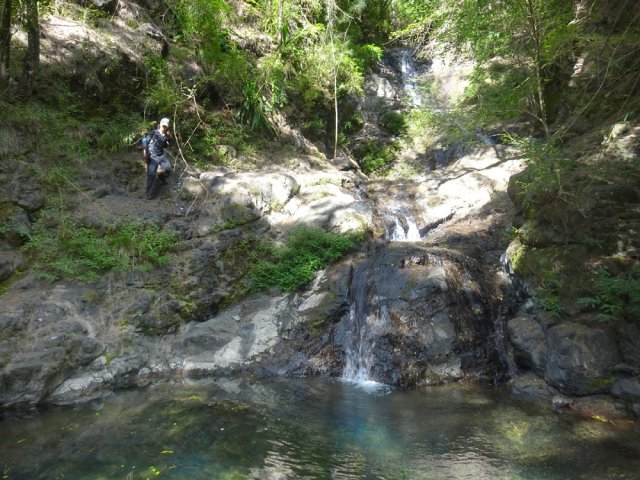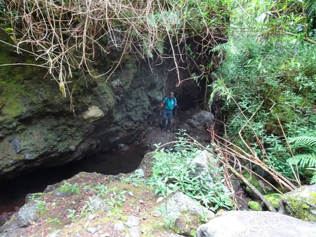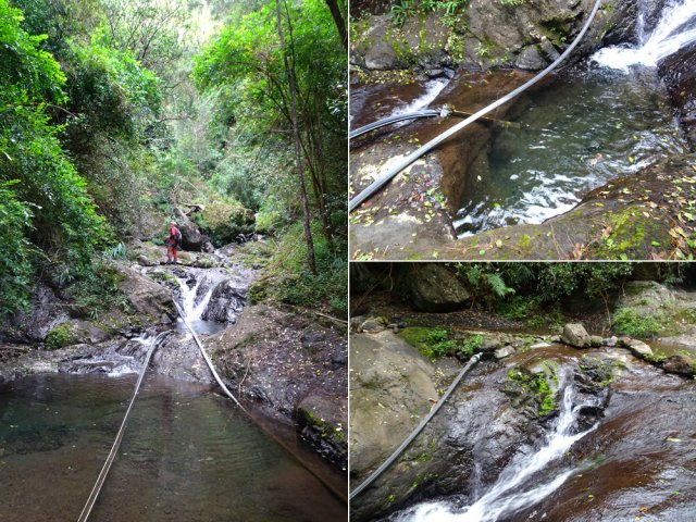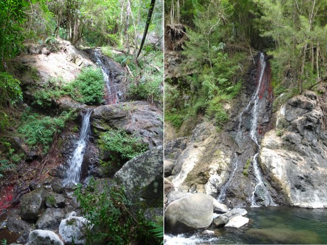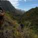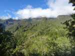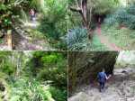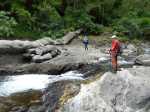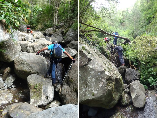Les randonneurs en ayant encore sous la semelle et ne craignant pas les fortes descentes glissantes se précipiteront sur le sentier des canyonistes pour rejoindre la Salle à Manger. Il faut avoir de bons freins pour éviter les glissades sur le sentier terreux. Heureusement, les branles verts et blancs et les pieds de goyaves permettent de s'accrocher au passage (Photo 24). Les dix derniers mètres sur le rocher glissant peuvent s'avérer dangereux s'il est humide. Une fois en rive droite, on se retrouve face à une haute falaise et un bassin alimenté par un fougueux toboggan (Photo 25). Un autre bassin, au milieu du plus haut gabbro de Salazie usé par les crues, donne des envies de baignade (Photo 26). On peut même envisager de descendre la rivière en rive droite (Photo 27). Il faudra alors rajouter du temps pour l'aller-retour. La remontée est certes courte, mais impose de se pencher vers l'avant en raison de la forte pente.