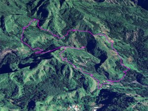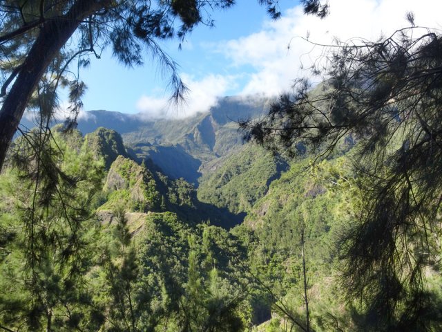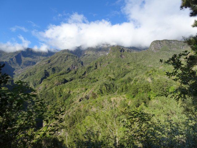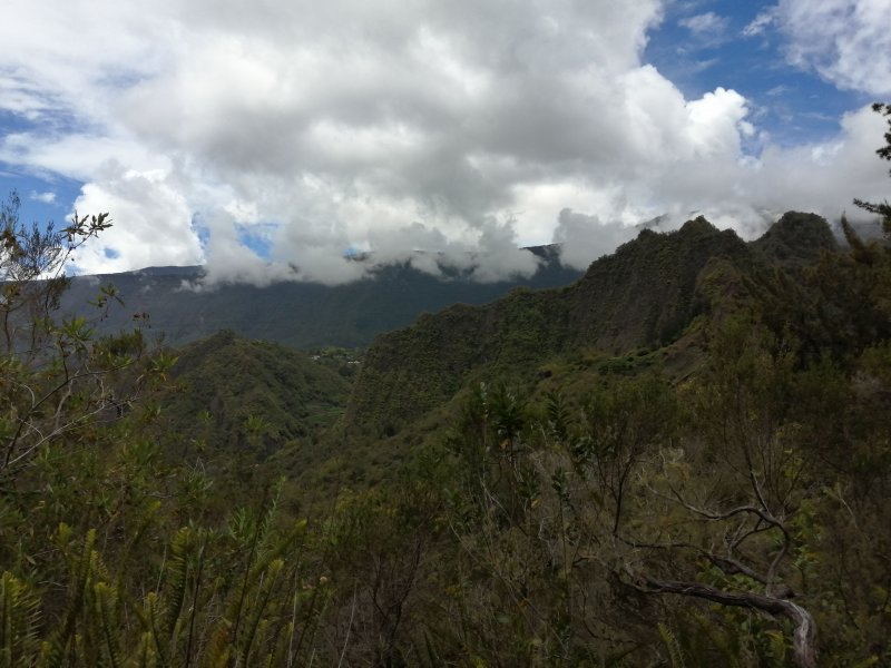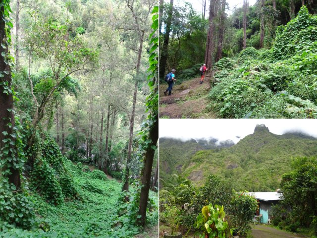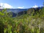 La randonnée débute au parking situé à la fin du Chemin de Bras Marron. Rejoindre le début du sentier descendant vers la rivière par de nombreux lacets pierreux. Traverser la rivière sur la passerelle métallique installée sur la grande plaque de gabbro de SalazieVoir les explications de Laurent Michon sur ces phénomènes géologiques en cliquant sur l'icône rouge de la carte ci-dessous. On peut voir la rivière à travers le sol grillagé de l'ouvrage (Photo 1). Après un oratoire et un escalier, on rejoint rapidement la piste en forte pente glissante menant à Mare d'Affouches. Elle est bordée de grands champs de chouchous et de vergers d'agrumes (Photo 2). Avant de parvenir aux premières habitations, repérer sur la gauche le poteau de l'ONF annonçant la direction de Trou Blanc alors que le sentier est depuis longtemps abandonné. Laisser la piste et emprunter ce sentier assez couvert d'invasives qui laissent sur les pantalons de belles grappes de colle-colle (Photo 3) ! Étonnamment, le passage semble tout de même fréquenté et jamais on ne cherche des yeux le sentier. Les fenêtres naturelles dans la végétation permettent d'observer de magnifiques paysages sur l'autre moitié de la boucle avec le Piton Tambour en toile de fond (Photo 4). On repère même par endroits la piste qu'on empruntera en fin de boucle (Photo 5). On repère très vite les tuyaux, dont un qui semble plus récent que les autres (Photo 6). On s'élève lentement sur une pente agréable en profitant encore de points de vue sur Trou Blanc, Hell Bourg et Bélouve repérable à son antenne (Photo 7). Un oratoire sur la droite semble régulièrement visité (Photo 23). Le sol est parfois glissant à cause de l'épaisseur d'aiguilles de filaos en bordure du ravin. La carte indique une habitation dans les parages. Ne pas manquer la courte jonction entre bambous et agrumes vers une grande case comportant une demi-douzaine de pièces avec, pour certaines, des matelas où il n'est pas recommandé de faire la sieste (Photo 8) ! Vu sa taille, elle devait abriter une famille nombreuse. Après une forte pente dans les bambous, le sentier se met à descendre fortement vers la Ravine Fouquet (Photo 9). La ravine étroite se passe aisément à gué. Le sentier historique se poursuit vers la gauche. Le délaisser. Partir sur la droite en longeant les bambous, tout comme le tuyau bleu servant de repère (Photo 10). Ce nouveau sentier, plus étroit que le précédent, passe en corniche pour de nouveaux panoramas. Des pieds de vétiver le bordent comme souvent dans les zones ayant été habitées ou cultivées. Du sentier, on devine la ravine coulant dans le fond. On aperçoit même une petite cascade qui se rejoint par une descente sur terrain instable. Un petit bassin alimenté par une modeste chute peut représenter une halte reposante (Photo 11). Plus loin, de nouvelles traces d'habitations se repèrent aux grosses touffes de bambous (Photo 12). La trace, malmenée par le passage des cyclones, impose quelques contorsions et petites acrobaties (Photo 13). Toujours aussi facile de se repérer malgré l'étroitesse du passage (Photo 14). Le sentier se rapproche petit à petit de la Ravine José Lebeau. Les tuyaux finissent dans de petits bassins où ils puisent l'eau qui sera dirigée vers Mare d'Affouches (Photo 15). Après le captage il n'y a plus de sentier. Un regard sur la carte permet de constater que le sentier de Grand Sable à Trous Blanc passe à moins de 100 m des captages. C'est donc par le fond de la ravine, plus facile que par la forêt qui la borde, qu'il faut effectuer la jonction. Traverser tout d'abord un court canyon par de courtes escalades (Photo 16). La pente est forte, les roches hautes, mais la ravine qui coule en-dessous, ne gêne pas la progression (Photo 17). On parvient rapidement et sans danger sous les grands filaos du sentier, avec la surprise de le trouver bien nettoyé (juillet 2024). La marche devient un réel plaisir à arpenter ce trajet longtemps abandonné et sans doute nettoyé pour le passage d'une course. De longues portions passent dans les cannes fourragères (Photo 18). D'autres dans les bois de couleurs, les longoses et  bambous sont tout aussi faciles (Photo 19). Puis le sentier longe la Ravine Goyave qui impose de garder toute son attention sur la trace car il emprunte parfois le fond de la ravine. Il remonte ensuite vers le nord avant de repartir vers le sud pour atteindre la Rivière du Mât. Quelques petites cascades tombent des affluents proches du gué (Photo 20). Le petit pont de bois facilitant la traversée du gué a disparu et il faut un peu se mouiller les pieds pour atteindre la rive droite (Photo 21). Pour rejoindre la piste de Trou Blanc, emprunter une échelle et grimper fortement sur des lacets couverts de lianes de chouchous (Photo 22). Arrivé aux quelques maisons de Trou Blanc, le parking se rejoint par une large piste sableuse qui finit au Chemin de Bras Marron. Prendre à gauche jusqu'au véhicule en profitant des derniers points de vue sur le Piton d'Anchain.