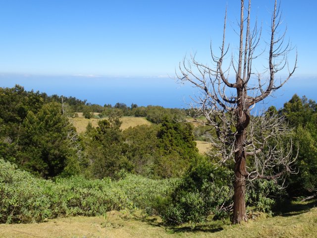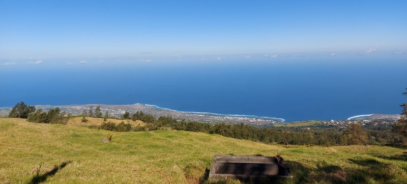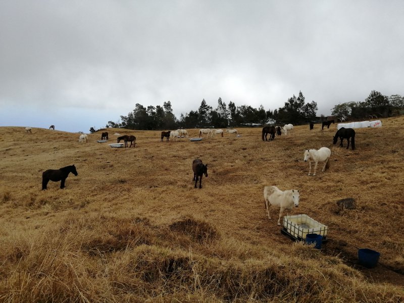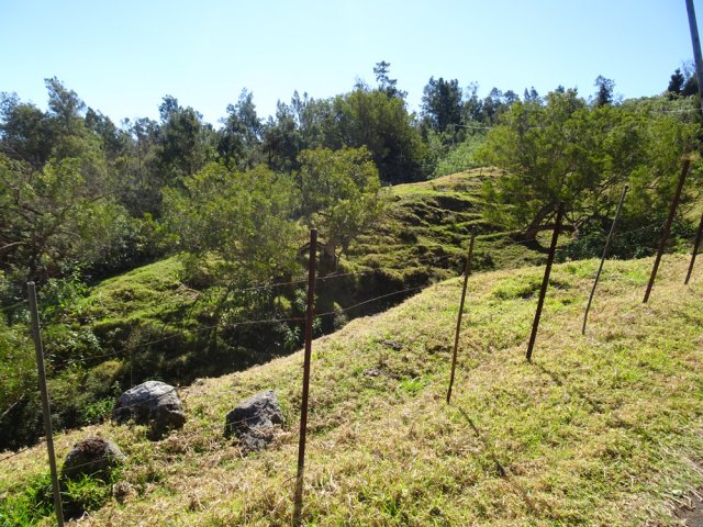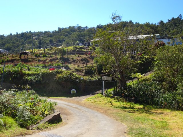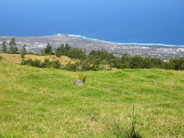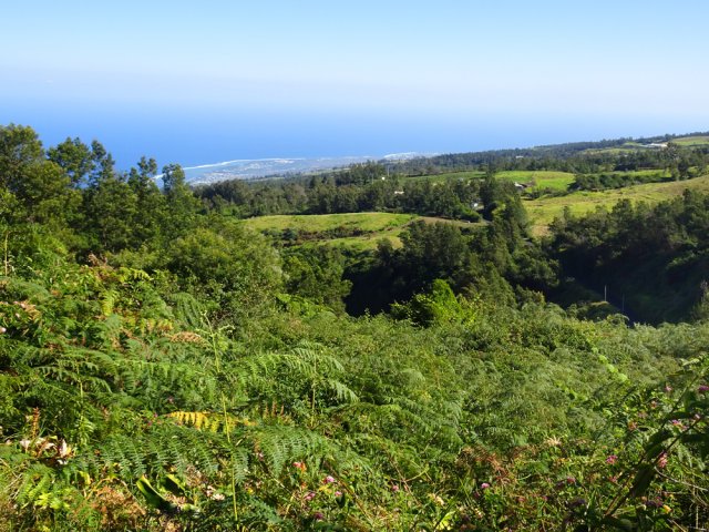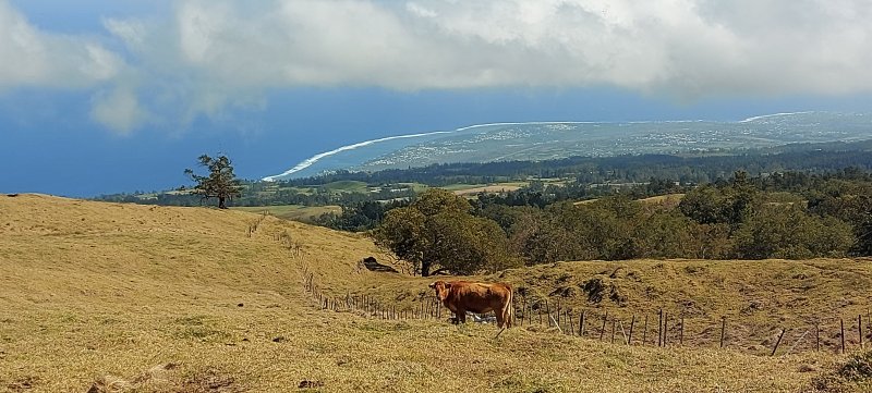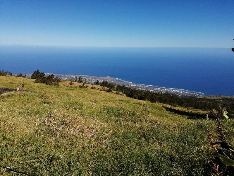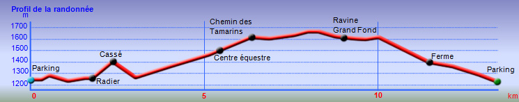 La randonnée débute ici au croisement du Chemin Emmanuel Payet et de la Route Vaudeville. Partir plein sud et franchir rapidement la Ravine de la Chaloupe. La route étroite est très calme, sans circulation ou alors très occasionnelle. On côtoie sitôt le départ de vastes prairies qu'on ne quittera guère tout au long de la boucle (Photo 1). Certaines sont rasées par les bestiaux, d'autres gardées pour la coupe. Les invasives sont également très présentes. On retrouvera les plus classiques durant le parcours mais ce sont surtout les renouées du chinois qui dominent au début. Elles ont tout envahi et les longues lianes aux feuilles rougissantes grimpent jusqu'au sommet des arbres et des poteaux télégraphiques (Photo 2). La pente est faible en général et descend même par moments pour franchir les nombreuses ravines (Photo 3). Après avoir traversé les radiers de la Ravine de la Petite Chaloupe et le Bras Sec, on parvient à la Ravine de la Fontaine, juste au début du Trou de Jarre. Les familles poursuivront le long des clôtures de fil de fer barbelé. Les amateurs de remontées sauvages de ravines originales trouveront le petit passage en rive gauche pour débuter la montée de cette vallée courte et profonde. Elle est nommée différemment en fonction des cartes IGN ou des panneaux de la région (Photo 4). La pente est assez forte, les roches de gros volume et la végétation assez touffue (Photo 5). Malgré cet aspect tourmenté, il y a toujours moyen de passer les obstacles avec des marches naturelles bien placées (Photo 6). Durant la montée plusieurs portions basaltiques facilitent grandement la progression, dont une assez longue et reposante (Photo 7). Après 40 minutes de montée, on se retrouve face au plus important cassé de la remontée. Il peut paraître impressionnant à première vue (Photo 8). Un passage est assez facile en rive gauche, à moins de suivre de manière plus acrobatique le lit de la ravine. On se retrouve très vite au pied de la muraille d'où tombe une cascade lors d'épisodes pluvieux violents. Le retour est plus aisé car on se laisse glisser le long des rochers au lieu de les escalader. Reprendre la route en arrivant au radier. La pente s'accentue mais reste raisonnable. Les prairies sont bordées de cryptomerias procurant de l'ombre au bétail qui s'approche parfois des clôtures (Photo 9). Plus on monte et plus les panoramas en direction de l'océan s'agrandissent (Photo 10). Un coup d'œil sur la campagne permet de voir qu'il n'y a pas seulement des pâturages. Les acacias noirs et les fougères grignotent lentement ces surfaces et les éleveurs n'ont pas toujours le temps de débroussailler comme on le remarque tout au long de la boucle (Photo 11). La pente s'accentue encore un peu sur une route totalement déserte (Photo 12). A 1400 m, le regard porte de l'Etang Salé jusqu'à l'Ermitage avec les vagues bien visibles à la Pointe au Sel (Photo 13). Les premiers tamarins font leur apparition dans des prés traversés par de profonds talwegs (Photo 16). Au premier croisement, prendre à gauche et suivre la direction indiquée par le panneau annonçant le Centre équestre du Jar (Photo 17). La pente devient plus forte encore dans le même paysage. Les vaches sont pour un temps remplacées par des chevaux dont on entend les hennissements. Puis on parvient au centre équestre dont le nom a gagné un "d" en quelques hectomètres. Situé à 1600 m d'altitude, le centre abrite les chevaux qui bénéficient d'une agréable fraîcheur toute l'année (Photo 18). A partir du centre équestre, les efforts prennent fin excepté quelques courtes pentes qui se passent sans effort. Comme on a atteint les 1600 m, les prairies diminuent en lisière des forêts occupant les pentes du Grand Bénare jusqu'au Brûlé de Saint-Leu. Hélas, ces forêts sont principalement recouvertes de cryptomerias, acacias noirs et grands bringeliers qui ont colonisé les pâturages d'altitude (Photo 19). Les troupeaux sont de plus en plus présents autour des fermes d'élevage (Photo 21). La route, toujours aussi étroite et sans circulation, continue dans les tamarins, les arums et longues haies de troènes bordant les fermes et habitations (Photo 23). De longues lianes de barbadines recouvrent les arbres sur près d'un km mais les fruits sont dévorés par les oiseaux avant de vraiment mûrir (Photo 24). Un peu avant d'arriver à la Ravine des Colimaçons qu'on devine toute proche, le Chemin des Tamarins oblique plein ouest et entame sa descente tout en virages (Photo 26). Les surfaces de prés occupés par des vaches sont plus importantes que sur le reste de la boucle. On passe entre plusieurs fermes et l'on traverse à nouveau des ravines totalement envahies de renouées du chinois (Photo 27). Lorsque l'on rencontre le Chemin Emmanuel Payet sur la droite, la boucle est bouclée.