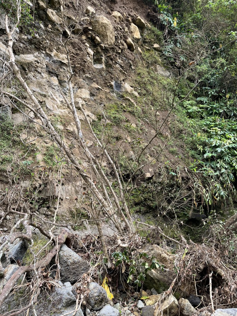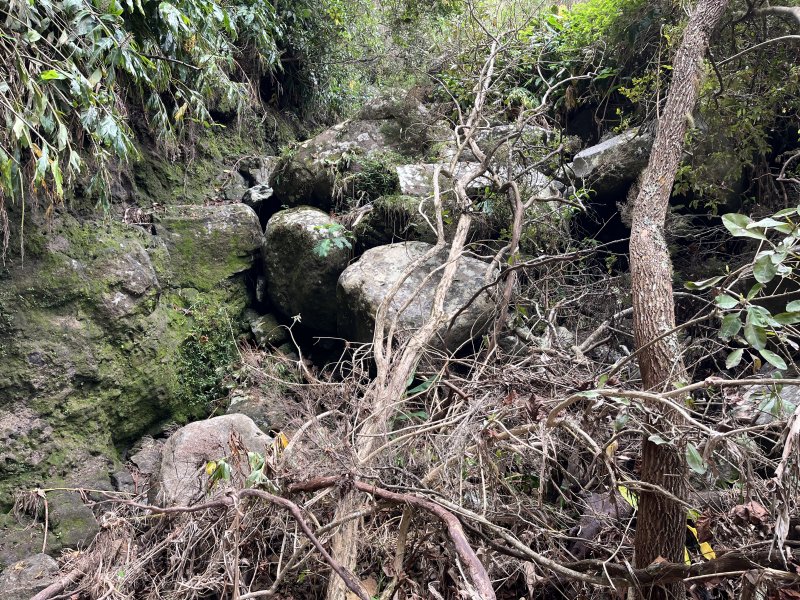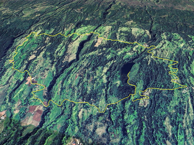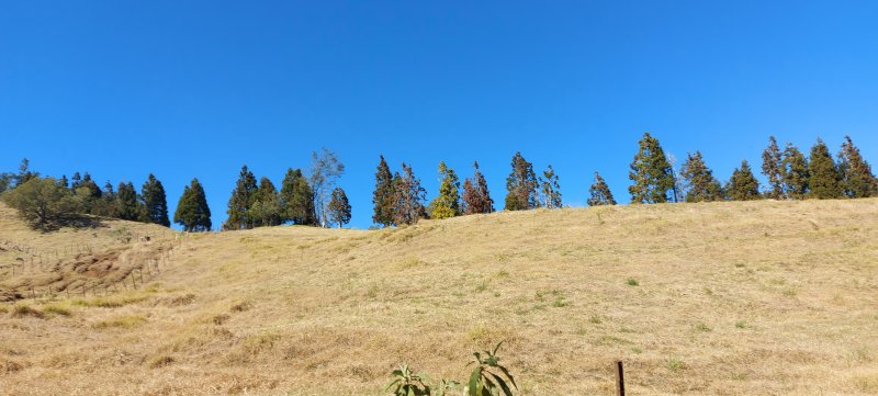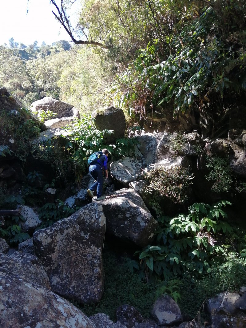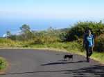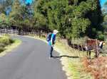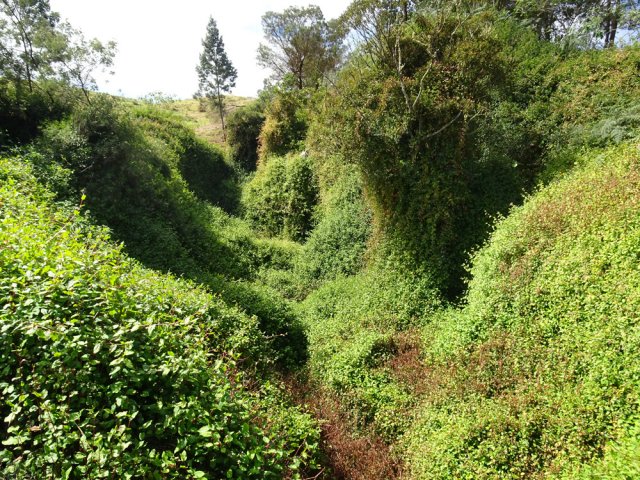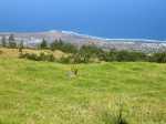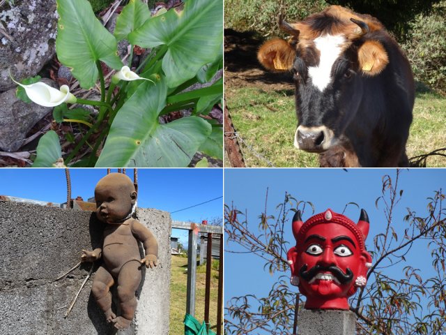 La randonnée débute ici au croisement du Chemin Emmanuel Payet et de la Route Vaudeville. Partir plein sud et franchir rapidement la Ravine de la Chaloupe. La route étroite est très calme, sans circulation ou alors très occasionnelle. On côtoie sitôt le départ de vastes prairies qu'on ne quittera guère tout au long de la boucle (Photo 1). Certaines sont rasées par les bestiaux, d'autres gardées pour la coupe. Les invasives sont également très présentes. On retrouvera les plus classiques durant le parcours mais ce sont surtout les renouées du chinois qui dominent au début. Elles ont tout envahi et les longues lianes aux feuilles rougissantes grimpent jusqu'au sommet des arbres et des poteaux télégraphiques (Photo 2). La pente est faible en général et descend même par moments pour franchir les nombreuses ravines (Photo 3). Après avoir traversé les radiers de la Ravine de la Petite Chaloupe et le Bras Sec, on parvient à la Ravine de la Fontaine, juste au début du Trou de Jarre. Les familles poursuivront le long des clôtures de fil de fer barbelé. Les amateurs de remontées sauvages de ravines originales trouveront le petit passage en rive gauche pour débuter la montée de cette vallée courte et profonde. Elle est nommée différemment en fonction des cartes IGN ou des panneaux de la région (Photo 4). La pente est assez forte, les roches de gros volume et la végétation assez touffue (Photo 5). Malgré cet aspect tourmenté, il y a toujours moyen de passer les obstacles avec des marches naturelles bien placées (Photo 6). Durant la montée plusieurs portions basaltiques facilitent grandement la progression, dont une assez longue et reposante (Photo 7). Après 40 minutes de montée, on se retrouve face au plus important cassé de la remontée. Il peut paraître impressionnant à première vue (Photo 8). Un passage est assez facile en rive gauche, à moins de suivre de manière plus acrobatique le lit de la ravine. On se retrouve très vite au pied de la muraille d'où tombe une cascade lors d'épisodes pluvieux violents. Le retour est plus aisé car on se laisse glisser le long des rochers au lieu de les escalader. Reprendre la route en arrivant au radier. La pente s'accentue mais reste raisonnable. Les prairies sont bordées de cryptomerias procurant de l'ombre au bétail qui s'approche parfois des clôtures (Photo 9). Plus on monte et plus les panoramas en direction de l'océan s'agrandissent (Photo 10). Un coup d'œil sur la campagne permet de voir qu'il n'y a pas seulement des pâturages. Les acacias noirs et les fougères grignotent lentement ces surfaces et les éleveurs n'ont pas toujours le temps de débroussailler comme on le remarque tout au long de la boucle (Photo 11). La pente s'accentue encore un peu sur une route totalement déserte (Photo 12). A 1400 m, le regard porte de l'Etang Salé jusqu'à l'Ermitage avec les vagues bien visibles à la Pointe au Sel (Photo 13). Les premiers tamarins font leur apparition dans des prés traversés par de profonds talwegs (Photo 16). Au premier croisement, prendre à gauche et suivre la direction indiquée par le panneau annonçant le Centre équestre du Jar (Photo 17). La pente devient plus forte encore dans le même paysage. Les vaches sont pour un temps remplacées par des chevaux dont on entend les hennissements. Puis on parvient au centre équestre dont le nom a gagné un "d" en quelques hectomètres. Situé à 1600 m d'altitude, le centre abrite les chevaux qui bénéficient d'une agréable fraîcheur toute l'année (Photo 18). A partir du centre équestre, les efforts prennent fin excepté quelques courtes pentes qui se passent sans effort. Comme on a atteint les 1600 m, les prairies diminuent en lisière des forêts occupant les pentes du Grand Bénare jusqu'au Brûlé de Saint-Leu. Hélas, ces forêts sont principalement recouvertes de cryptomerias, acacias noirs et grands bringeliers qui ont colonisé les pâturages d'altitude (Photo 19). Les troupeaux sont de plus en plus présents autour des fermes d'élevage (Photo 21). La route, toujours aussi étroite et sans circulation, continue dans les tamarins, les arums et longues haies de troènes bordant les fermes et habitations (Photo 23). De longues lianes de barbadines recouvrent les arbres sur près d'un km mais les fruits sont dévorés par les oiseaux avant de vraiment mûrir (Photo 24). Un peu avant d'arriver à la Ravine des Colimaçons qu'on devine toute proche, le Chemin des Tamarins oblique plein ouest et entame sa descente tout en virages (Photo 26). Les surfaces de prés occupés par des vaches sont plus importantes que sur le reste de la boucle. On passe entre plusieurs fermes et l'on traverse à nouveau des ravines totalement envahies de renouées du chinois (Photo 27). Lorsque l'on rencontre le Chemin Emmanuel Payet sur la droite, la boucle est bouclée.