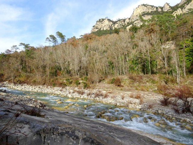 L'Esteron, à deux pas de Nice, est une rivière très connue des marcheurs et canyonistes. Avant de terminer sa course dans le Var à quelques kilomètres de la mer, elle traverse de belles gorges qu'il vaut mieux visiter l'été en raison de la température et du niveau de l'eau. En fonction du débit, on peut rencontrer de plus ou moins grands bassins d'eau calme bordés d'aulnes, saules ou peupliers du plus bel effet une fois l'automne arrivé. En hiver, il est préférable d'effectuer une boucle autour des gorges pour les apprécier depuis les magnifiques falaises qui bordent le torrent. Cette boucle, un classique de la région, débute au petit village de Gilette et se rapproche du Pont de la Cerise avant de revenir vers Fougassière et la Clave. Il est possible de descendre au plus près de l'Esteron à la fin des gorges pour prendre un bon casse croûte entre les gros rochers ou remonter prudemment vers l'amont. L'eau est particulièrement claire mais il est difficile d'y apercevoir la faune locale composée de truites, anguilles et barbeaux. La fin de la boucle remonte la falaise à partir des Gravènes par la Clue sur un sentier botanique abandonné et fermé par la municipalité en raison d’éboulis. A chacun de prendre ses responsabilités en évitant les jours de pluie propices aux glissements de terrain. Tout en marches, ce sentier est malgré cela fort agréable.