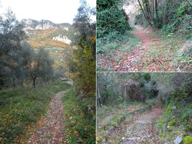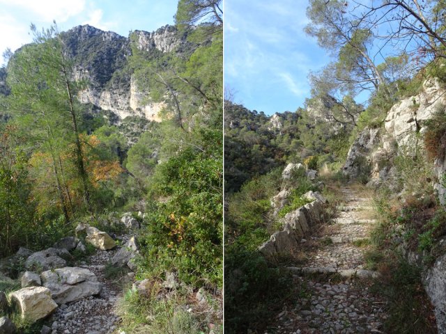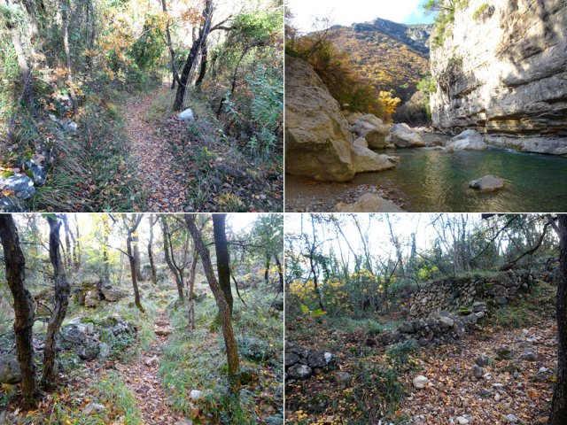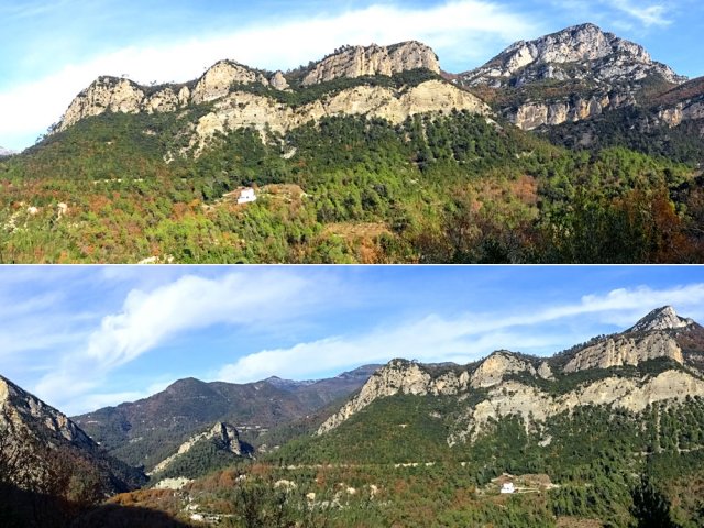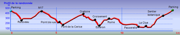 La randonnée débute au petit village de Gilette comportant de grands parkings à l'entrée ou à la sortie. La boucle débute ici en ville après avoir stationné près de la pharmacie. On peut se balader dans le village avant d'entamer la sortie pour en apprécier le calme et les paysages qui l'entourent (Photo 1). Il est possible de rejoindre les parkings de l'entrée mais aussi de descendre par un long raccourci à emprunter au tout début de la route de Roquesteron. Il rejoint rapidement l'école de Gilette. Poursuivre par une courte portion de la Route des Espauvettes et ne pas manquer le sentier partant sur la gauche. Il descend parfois assez fortement par des lacets jusqu'au premier croisement. Prendre à gauche et marcher en direction du Latti qu'on entend couler avant de le traverser un peu plus loin sur une passerelle proche des ruines d'une bergerie. Le sentier est large, propre, bordé de végétation avec de beaux points de vue sur les montagnes environnantes (Photo 2). Il longe ensuite le Latti qu'on domine. Le sentier en corniche passe parfois près du vide. Il est étroit mais facile à suivre (Photo 3). Après une passerelle difficile à discerner, le sentier traverse d’anciennes plantations d'oliviers ou frôle souvent de nouvelles ruines. On passe aussi près d'une habitation située à Fond d'Aiméou à la fin d'une petite route. On a sous les yeux la vallée profonde du Latti (Photo 4). Le sentier se met alors à monter de plus en plus, parfois en lacets, à travers une très belle chênaie (Photo 5). On rejoint assez vite une propriété de Colle Belle entourée de grillage avant de parvenir à une petite route montant fortement vers la M11. Ne pas manquer quelques raccourcis pour éviter cette route sans grande circulation. Il faudra cependant en emprunter 300 m et profiter ainsi des sommets environnants (Photo 6). Au premier virage, ne pas manquer le premier sentier menant à la piste vers le Pont de la Cerise qui est large et très agréable (Photo 7). De nombreux raccourcis faciles à négocier évitent les longs virages de la piste (Photo 8). On s'approche doucement de l'Esteron qu'on entend couler sur la gauche. Des zones rocheuses protégées de grillages en bordure de falaise offrent de beaux points de vue sur les gorges (Photo 9). Prendre ou non le dernier raccourci se finissant à une passerelle et rejoindre rapidement le Pont de la Cerise qui enjambe l'Esteron (Photo 10). Le torrent peut impressionner mais il est possible de s'en approcher (Photo 11) ou d'en remonter le cours assez tumultueux à cet endroit (Photo 12). Effectuer une pause dans cet endroit sauvage avant d'entreprendre la montée de l'autre côté. Le sentier est très large, empierré avec de belles vues sur les montagnes (Photo 13). Plus on s'élève et plus ces panoramas sont superbes sur les montagnes calcaires bordant la rivière (Photo 14). Les sentiers encore présents sur les cartes pour dominer les gorges ont quasiment disparu. Aussi, après le 9ème lacet, obliquer à gauche en direction de l'oratoire ND du Brec et Bouyon (Photo 15). Ce nouveau parcours, plus étroit, suit en corniche la falaise qui domine les gorges (Photo 16). Longer la falaise sur ce magnifique sentier dominé par le Maupet et ses 611 m ou par le Rocher des Carbonniers (Photo 17). On parvient très vite à l'oratoire en pierre en forme de colonne (Photo 18). Poursuivre par quelques lacets avant de profiter des plus beaux paysages de la journée en direction des gorges une centaine de mètres plus bas (Photo 19). On quitte plus loin les falaises et les à-pics pour pénétrer dans les sous-bois (Photo 20). Au prochain croisement, le sentier de droite file en direction de Bouyon. Trouver, en face, celui qui descend vers l'Esteron. Il comporte quelques portions pentues mais la progression est aisée tout le temps. On parvient aux rochers bordant le rivière le long de laquelle il est possible de cheminer en fonction du chrono. La remontée est plus difficile entre les arbres et restes de murets de soutènement des terrasses d'anciennes cultures (Photo 21). Reprendre à gauche le sentier principal et poursuivre dans la forêt en frôlant quelques ruines réparties sur le parcours (Photo 22). On ne quitte jamais les anciens travaux du siècle dernier qui ont modelé les flancs des montagnes pour en faire des champs ou des prairies (Photo 23). Le parcours se met à descendre, parfois fortement en longeant des clôtures électriques. On parvient à un élevage où il est déconseillé de nourrir ânes et chevaux. Plus loin, le sentier termine à une petite route près de la ruine d'un grand bâtiment. Partir à gauche puis emprunter immédiatement le sentier de gauche en rive droite du Bouyon (Photo 24). Le sentier suit le torrent au plus près avant de s'en éloigner un peu. A de nouvelles ruines, sans doute celles d'un moulin, traverser un petit ruisseau et retrouver de nouvelles portions de sentier très agréables en sous-bois avec de belles vues sur les montagnes (Photo 25). Il monte fortement au début puis s'assagit et redescend vers l'Esteron qui traverse le hameau de la Clave. Franchir la rivière sur une passerelle très souple (Photo 26). Poursuivre entre des habitations isolées et des vergers puis contourner complètement la dent pointue de la Clue (Photo 27). Après la dernière maison, le sentier botanique monte fortement en lacets encombrés de grosses pierres et parfois de restes d'éboulis. Hormis ces petits éboulis et les parties pentues, il reste toujours agréable malgré sa fermeture. Une très longue partie de la montée a été aménagée et bétonnée (Photo 28). La dernière partie rejoint facilement Gilette. Une fois sur la route, partir à gauche vers l'école puis par le raccourci ou à droite vers les autres parkings selon le lieu de stationnement.