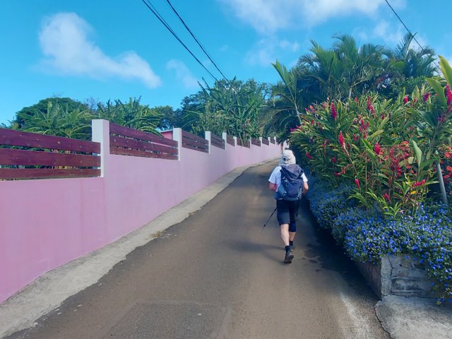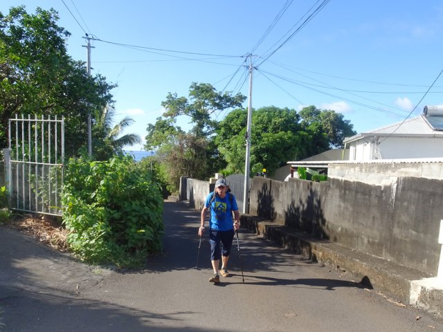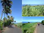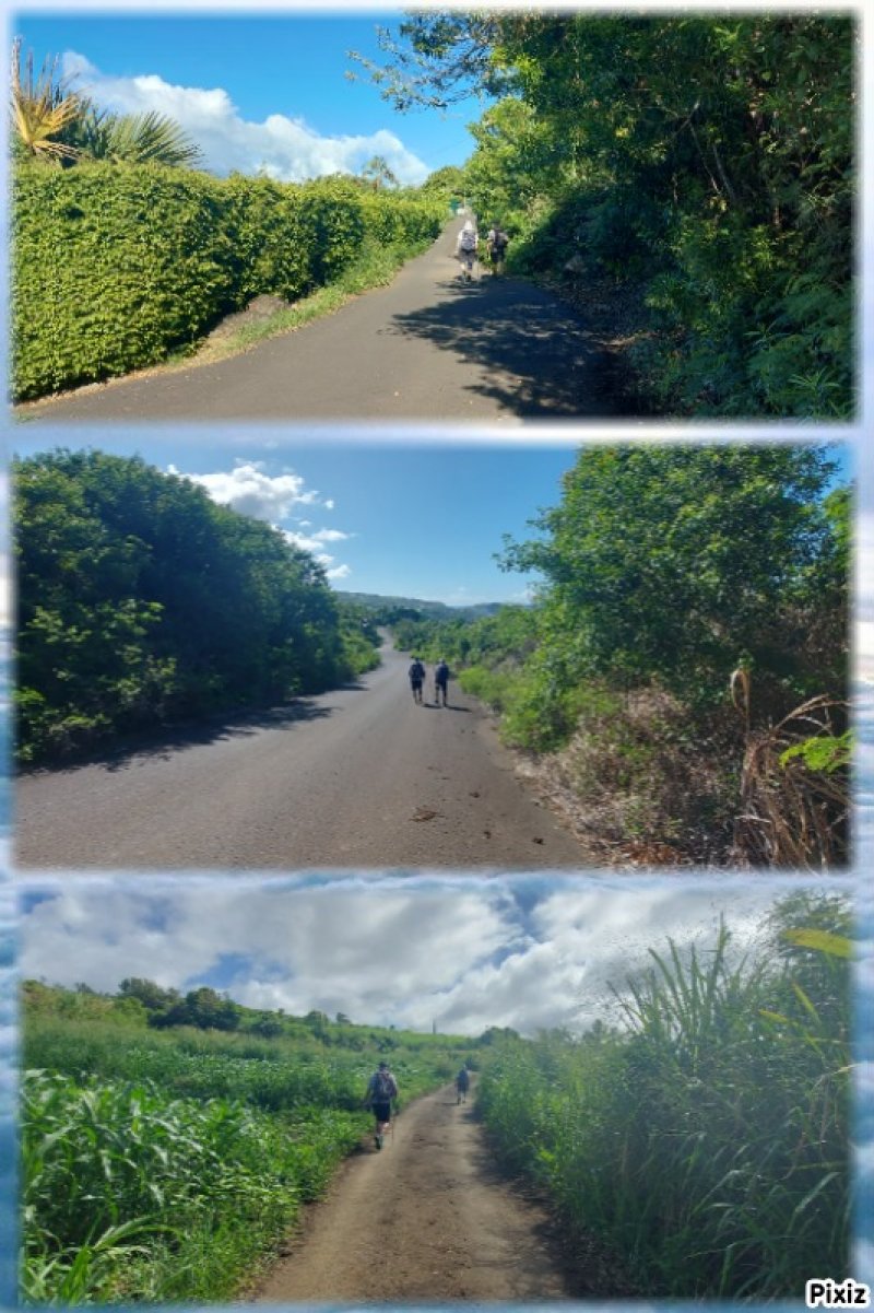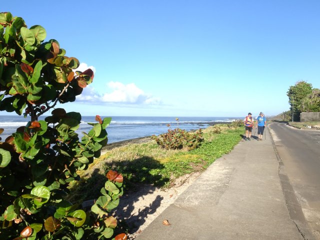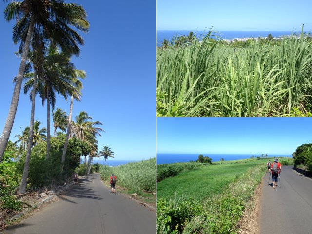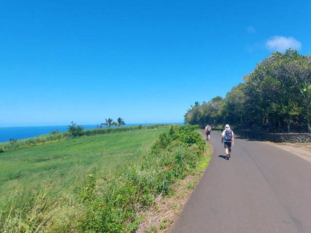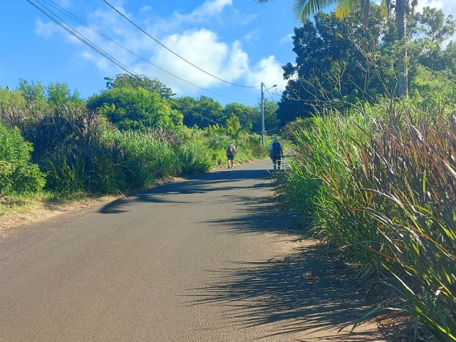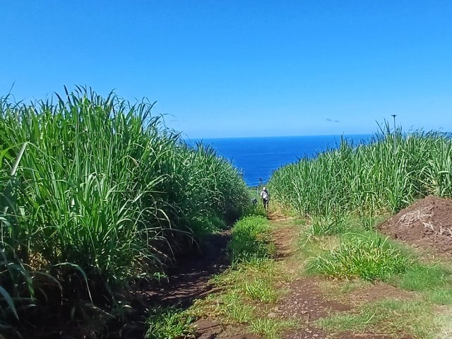 La randonnée débute aux Calbanons de la Cafrine où un parking peut accueillir quelques véhicules. Les bâtiments réhabilités sont le plus souvent fermés, sauf la maison musée (Photo 1). Si le départ a lieu aux aurores, garder la visite du lieu pour la fin de la boucle. Prendre à droite le Chemin Maxime Rivière et marcher jusqu'au grand rond-point et à l'échangeur de la RN2 (Photo 2). Poursuivre jusqu'au prochain rond-point et atteindre le littoral par la rue Bertin Lauret. La côte très rocheuse et les vagues qui s'y écrasent constituent un agréable spectacle, plus vivant que les cannes à sucre traversées plus tard (Photo 3). Des aires de repos ombragées ont été installées. La marche peut s'effectuer au plus près de la falaise (Photo 4). Au lieu d'emprunter le Chemin Irénée Courtois de la course, poursuivre sur le sentier littoral entre chocas et propriétés (Photo 5). Il se termine au parking de l'hôtel. Partir à gauche pour marcher cette fois sur la route principale. Après la boucherie et le marchand de légumes, partir sur la droite sur l'allée de la Source. Elle se finit à un lieu prisé des baigneurs. Lors de la baignade, on sent l'eau fraîche surgir avant de se mélanger à l'eau salée du bassin (Photo 6). Il est possible, un peu plus loin, de revenir vers les vagues par la Ruelle de l’École mais il faut sortir assez rapidement par une allée entre les habitations. Elle est privée d'après une habitante mais pas interdite (Photo 7). Après cet écart facultatif, poursuivre vers la plage. On parvient très vite au bassin de baignade, minuscule et ensablé au milieu des rochers (Photo 8). Ne pas manquer les extraordinaires banians du terrain Paddock avec leurs interminables racines dans lesquelles jouent les enfants durant les pique-niques (Photo 9). L'endroit tient son nom des écuries de l'usine au 19ème siècle. Longer la plage surchauffée sur un trottoir envahi par endroits de patates à Durand (Photo 10). Les randonneurs intéressés par la visite du puits poursuivront vers le Cap Guillaume en marchant sur la plage en hors sentier (Photo 11). Après une zone agréable sur galets et corail, passer une série de gros rochers et guetter sur la gauche le bâtiment bétonné recouvert de cactus pitayas (Photo 12). Une fois le "blockhaus" repéré, emprunter le sentier remontant vers les maisons. Sur la droite, un petit passage envahi permet de rejoindre le puits couvert par un ouvrage à l'architecture élaborée. Des escaliers, goulottes, caniveaux amenaient l'eau au puits central, à sec depuis longtemps (Photo 13). La visite terminée, remonter vers l'Impasse Sallembert par un sentier de pêcheur étroit entre les clôtures (Photo 14). Une portion urbaine débute par la traversée d'Anse les Bas, un quartier calme de Grands Bois (Photo 15). Suivre quelques rues jusqu'au temple tamoul puis emprunter sur la droite un chemin qui remonte la colline en direction de la RN2. Il s'élève par des pentes faibles entre les friches en offrant de plus en plus de panoramas sur le village (Photo 16). On domine plus loin l'ancienne usine réhabilitée et la balance (Photo 17). Le chemin finit à la Rue Émile Hugo qui passe plus loin sous la déviation (Photo 18). Le Chemin Bassin Chevrette traverse un petit quartier avant de filer plein nord par des pentes un peu plus appuyées entre champs et vergers (Photo 19). Quitter la route pour emprunter une piste dans les cannes filant en direction du Piton de Mont Vert qu'on aperçoit à l'horizon (Photo 20). Partir sur la gauche aux prochaines habitations puis rapidement à droite pour retrouver les cannes à sucre (Photo 21). Aux maisons suivantes, repartir à gauche sur une petite route en direction du Chemin Grand Père sur la dernière pente de la boucle (Photo 22). Poursuivre entre de nouvelles habitations fleuries (Photo 23). La montée se termine. Suivre ce Chemin Grand Père, large et fréquenté par les véhicules. On longe des plantations de cocotiers, des champs de canne et des prairies (Photo 24). Peu de place sur les accotements pour éviter les véhicules roulant parfois rapidement (Photo 25). Après 15 minutes de descente, on se rapproche de la Ravine des Cafres les Hauts qu'on voit très bien après avoir passé les grandes serres maraîchères sur la droite (Photo 26). A la fin de la route, traverser le rond-point de la route de Montvert et récupérer, 50 m plus loin la Rue Jules Verne qui évite d'affronter l'importante circulation (Photo 27). Il faut parfois retrouver la RD29 sur quelques dizaines de mètres pour reprendre des ruelles et surtout des raccourcis sous forme d'allées ou d'escaliers pour marcher à l'ombre et dans le calme (Photo 28). A la fin de l'Allée des Pois de Senteur, traverser la RD29 puis rejoindre les calbanons par les rues des Terrasses et du Coteau. Continuer jusqu'au temple avant de prendre quelques minutes à la visite des Calbanons de la Cafrine.