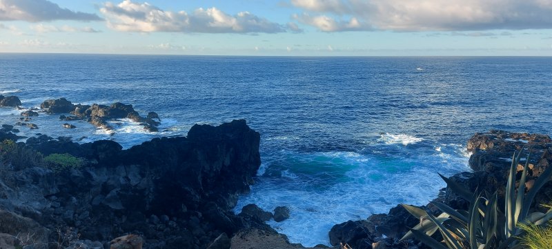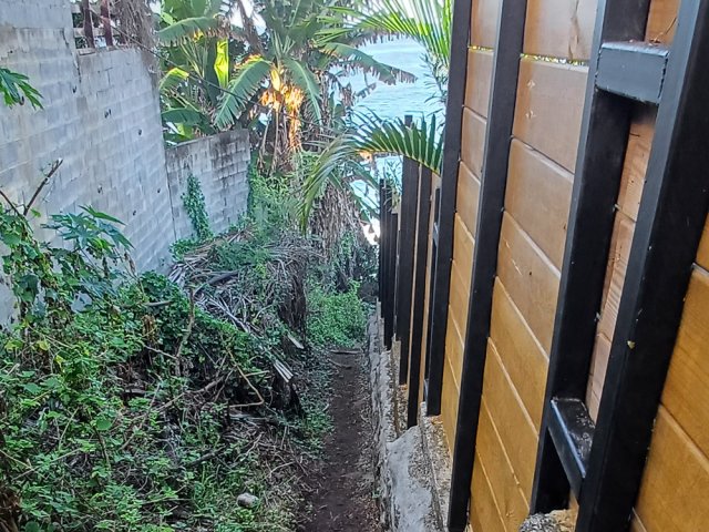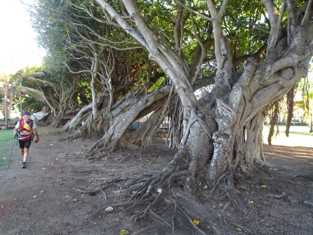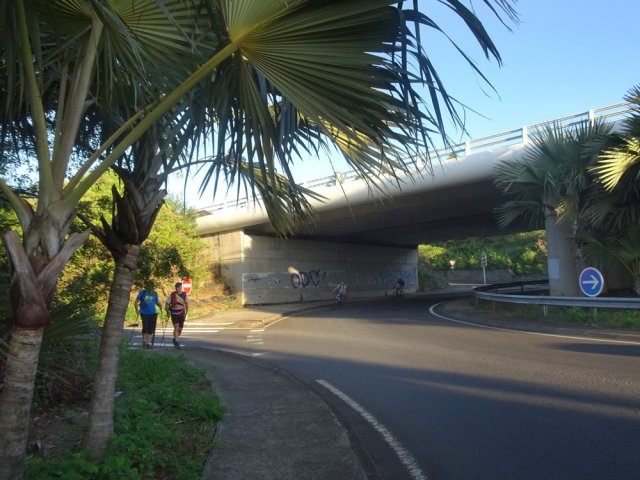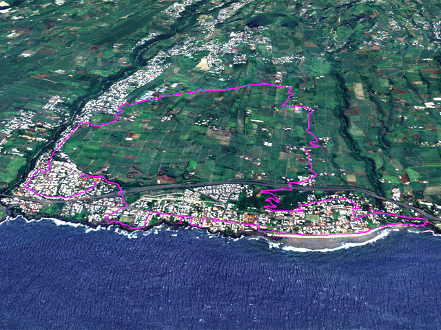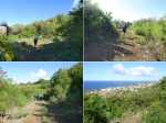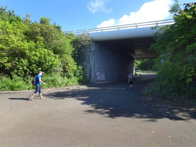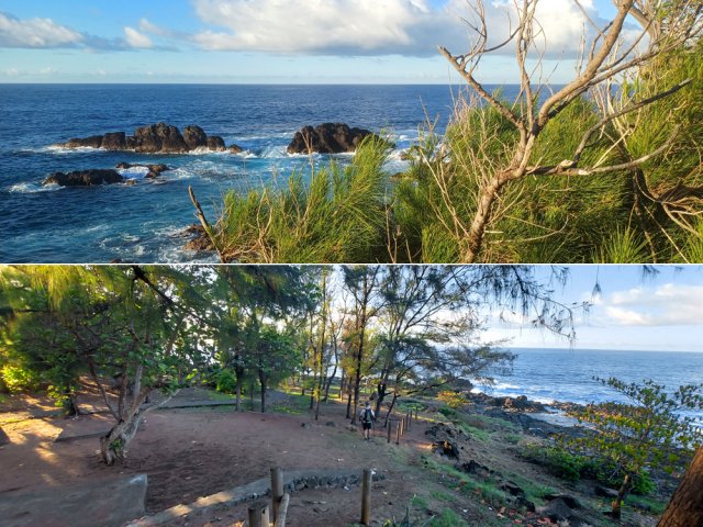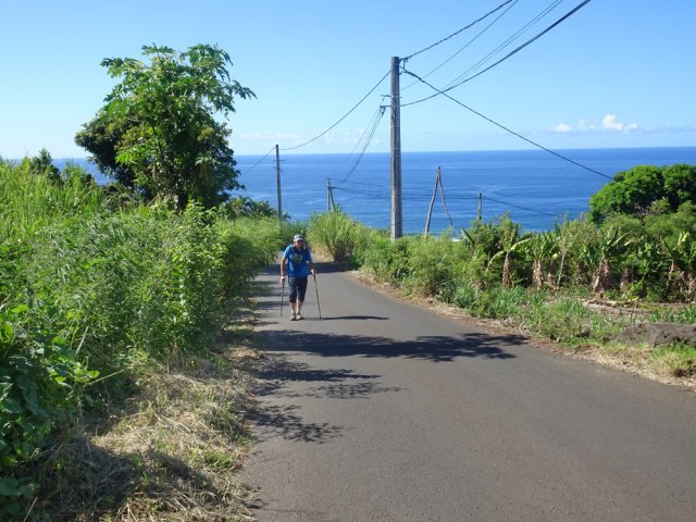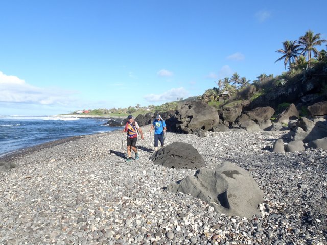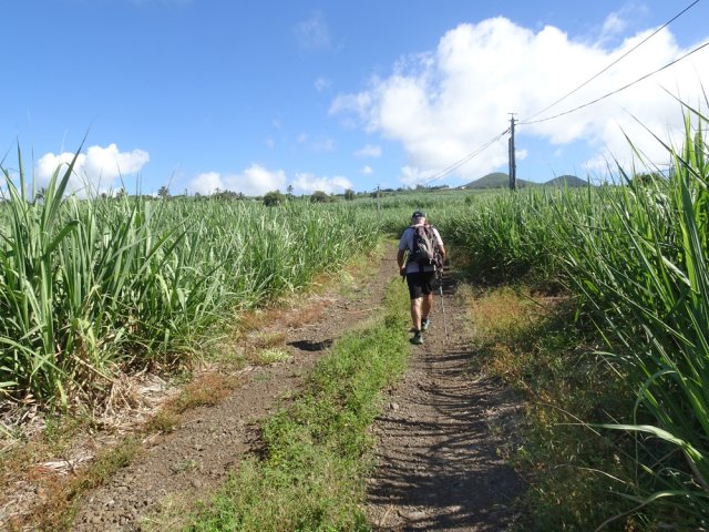 La randonnée débute aux Calbanons de la Cafrine où un parking peut accueillir quelques véhicules. Les bâtiments réhabilités sont le plus souvent fermés, sauf la maison musée (Photo 1). Si le départ a lieu aux aurores, garder la visite du lieu pour la fin de la boucle. Prendre à droite le Chemin Maxime Rivière et marcher jusqu'au grand rond-point et à l'échangeur de la RN2 (Photo 2). Poursuivre jusqu'au prochain rond-point et atteindre le littoral par la rue Bertin Lauret. La côte très rocheuse et les vagues qui s'y écrasent constituent un agréable spectacle, plus vivant que les cannes à sucre traversées plus tard (Photo 3). Des aires de repos ombragées ont été installées. La marche peut s'effectuer au plus près de la falaise (Photo 4). Au lieu d'emprunter le Chemin Irénée Courtois de la course, poursuivre sur le sentier littoral entre chocas et propriétés (Photo 5). Il se termine au parking de l'hôtel. Partir à gauche pour marcher cette fois sur la route principale. Après la boucherie et le marchand de légumes, partir sur la droite sur l'allée de la Source. Elle se finit à un lieu prisé des baigneurs. Lors de la baignade, on sent l'eau fraîche surgir avant de se mélanger à l'eau salée du bassin (Photo 6). Il est possible, un peu plus loin, de revenir vers les vagues par la Ruelle de l’École mais il faut sortir assez rapidement par une allée entre les habitations. Elle est privée d'après une habitante mais pas interdite (Photo 7). Après cet écart facultatif, poursuivre vers la plage. On parvient très vite au bassin de baignade, minuscule et ensablé au milieu des rochers (Photo 8). Ne pas manquer les extraordinaires banians du terrain Paddock avec leurs interminables racines dans lesquelles jouent les enfants durant les pique-niques (Photo 9). L'endroit tient son nom des écuries de l'usine au 19ème siècle. Longer la plage surchauffée sur un trottoir envahi par endroits de patates à Durand (Photo 10). Les randonneurs intéressés par la visite du puits poursuivront vers le Cap Guillaume en marchant sur la plage en hors sentier (Photo 11). Après une zone agréable sur galets et corail, passer une série de gros rochers et guetter sur la gauche le bâtiment bétonné recouvert de cactus pitayas (Photo 12). Une fois le "blockhaus" repéré, emprunter le sentier remontant vers les maisons. Sur la droite, un petit passage envahi permet de rejoindre le puits couvert par un ouvrage à l'architecture élaborée. Des escaliers, goulottes, caniveaux amenaient l'eau au puits central, à sec depuis longtemps (Photo 13). La visite terminée, remonter vers l'Impasse Sallembert par un sentier de pêcheur étroit entre les clôtures (Photo 14). Une portion urbaine débute par la traversée d'Anse les Bas, un quartier calme de Grands Bois (Photo 15). Suivre quelques rues jusqu'au temple tamoul puis emprunter sur la droite un chemin qui remonte la colline en direction de la RN2. Il s'élève par des pentes faibles entre les friches en offrant de plus en plus de panoramas sur le village (Photo 16). On domine plus loin l'ancienne usine réhabilitée et la balance (Photo 17). Le chemin finit à la Rue Émile Hugo qui passe plus loin sous la déviation (Photo 18). Le Chemin Bassin Chevrette traverse un petit quartier avant de filer plein nord par des pentes un peu plus appuyées entre champs et vergers (Photo 19). Quitter la route pour emprunter une piste dans les cannes filant en direction du Piton de Mont Vert qu'on aperçoit à l'horizon (Photo 20). Partir sur la gauche aux prochaines habitations puis rapidement à droite pour retrouver les cannes à sucre (Photo 21). Aux maisons suivantes, repartir à gauche sur une petite route en direction du Chemin Grand Père sur la dernière pente de la boucle (Photo 22). Poursuivre entre de nouvelles habitations fleuries (Photo 23). La montée se termine. Suivre ce Chemin Grand Père, large et fréquenté par les véhicules. On longe des plantations de cocotiers, des champs de canne et des prairies (Photo 24). Peu de place sur les accotements pour éviter les véhicules roulant parfois rapidement (Photo 25). Après 15 minutes de descente, on se rapproche de la Ravine des Cafres les Hauts qu'on voit très bien après avoir passé les grandes serres maraîchères sur la droite (Photo 26). A la fin de la route, traverser le rond-point de la route de Montvert et récupérer, 50 m plus loin la Rue Jules Verne qui évite d'affronter l'importante circulation (Photo 27). Il faut parfois retrouver la RD29 sur quelques dizaines de mètres pour reprendre des ruelles et surtout des raccourcis sous forme d'allées ou d'escaliers pour marcher à l'ombre et dans le calme (Photo 28). A la fin de l'Allée des Pois de Senteur, traverser la RD29 puis rejoindre les calbanons par les rues des Terrasses et du Coteau. Continuer jusqu'au temple avant de prendre quelques minutes à la visite des Calbanons de la Cafrine.