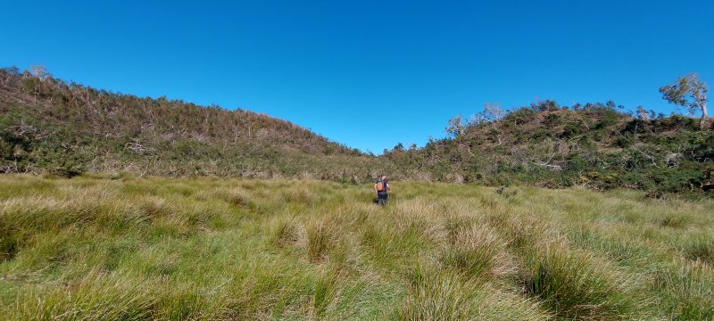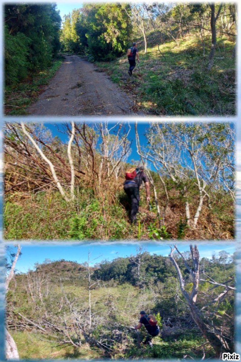 - début d’une grimpée un peu pénible mais courte à travers une broussaille de végétaux vivants et secs.