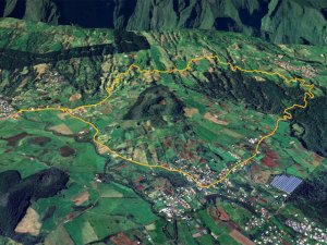 Depuis la route des Plaines, rouler jusqu'à Bourg Murat puis prendre la direction du volcan - Au premier croisement, délaisser la RF du Volcan et poursuivre vers le stade de la Grande Ferme - Débuter la boucle en partant plein sud jusqu'à la petite église du village - Emprunter à gauche le Chemin Mathias et traverser des dizaines de prairies jusqu'à la route de Notre Dame de la Paix - Tourner à droite sur la RD36 en direction du Tampon - A la Petite Ferme, reprendre le Chemin Mathias qui finit à l'église - Terminer les derniers 100 m vers le stade du village.