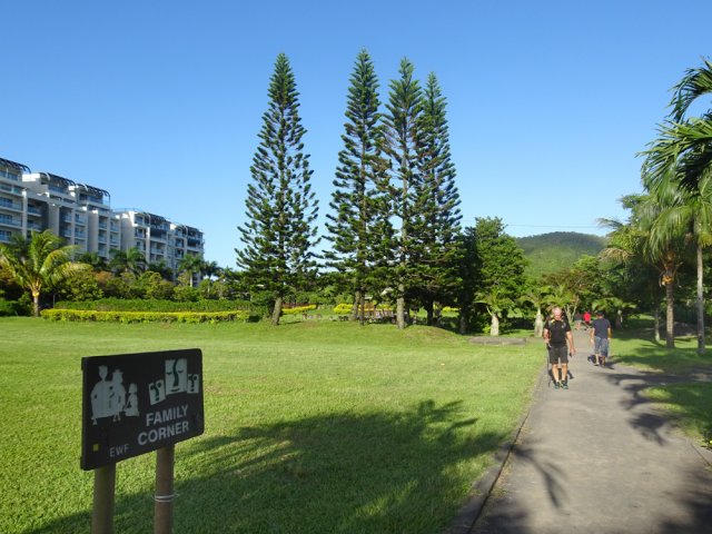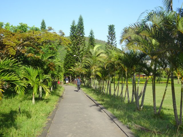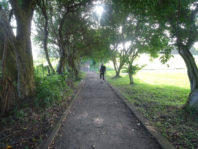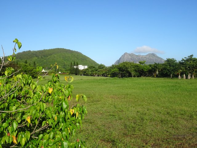 La randonnée débute ici au centre anti-cancer tout neuf de Quatre Bornes. Les gardiens, prompts à entamer la conversation, invitent même à stationner sur le parking du centre. Emprunter la petite route en quittant le centre par la droite et trouver très vite le sentier débutant sur la gauche qui évite de pousser plus loin vers le début de la piste (Photo 1). Le passage, moins utilisé que d'autres entrées, est tout de même très facile à suivre dans les friches (Photo 2). On récupère très vite la piste qui part à l'assaut de la colline. Elle est constituée de terre rouge volcanique (Photo 3). Repérer, en montant, de nombreux sentiers partant de tous côtés. Ils seront utiles au retour pour changer de la piste. Moins de 15 minutes après le départ, on parvient au sommet marqué par un grand kiosque et une porte symbolique en bois (Photo 5). Du kiosque, on bénéficie de quelques vues sur la région mais en partie masquées par les arbres (Photo 7). Reprendre le chemin inverse puis bifurquer à gauche au premier sentier qui s'enfonce dans la forêt (Photo 8). Tout aussi connu que la piste puisqu'il mène à un point de vue, le large sentier est agréable (Photo 9). On parvient à une barrière qu'il est aisé de contourner pour regagner le rocher que l'on peut repérer depuis Quatre Bornes. Toute la ville s'étale au pied de la colline et le Corps de Garde paraît solitaire au milieu de cette urbanisation forcée (Photo 10). Reprendre à nouveau le chemin inverse et retrouver la piste. Entamer la descente mais ne pas hésiter à emprunter les sentiers qui évitent la terre rouge de la piste (Photo 11). L'un d'entre eux, sur la gauche en descendant, sillonne les fourrés et bosquets. On devine de loin le parc Sodnac et même les arbres qui longent la piste (Photo 12). Cet itinéraire renforce l'idée de randonner puisque l'on est sur des sentiers. Une fois la piste retrouvée, repartir à gauche à nouveau sur un chemin empierré et ombragé où l'on rencontre de nombreux marcheurs et coureurs (Photo 13). Une porte du même acabit que celle du sommet est le point de départ pour les sportifs venant du grand parc (Photo 14). Franchir la barrière et pénétrer dans le Sodnac Wellness Park afin de poursuivre agréablement cette sortie urbaine. Partir à gauche et longer le grillage afin de tenter un tour complet. De l'autre côté, une halte permet de voir un canon pointant sur les terrains (Photo 15). Des travaux ont été entrepris pour fortifier les pentes et installer des équipements sportifs au pied de la colline (Photo 16). Poursuivre vers l'est sur des allées ombragées (Photo 17). Le contraste est souvent important entre les immeubles, la verdure et même une grande plantation d'arbres endémiques (Photo 18). Le parc est divisé en zones bien délimitées et indiquées par des panneaux (Photo 19). Il finit au milieu des immeubles à un grand parking dédié aux visiteurs. L'allée se poursuit donc pour repartir vers l'ouest (Photo 20). La colline, à cette distance, paraît bien petite même si elle domine de 100 m (Photo 21). Il doit faire bon habiter près de cette verdure bien entretenue (Photo 22). L'allée accueille autant de marcheurs et coureurs que de l'autre côté (Photo 24). Les équipes de foot se régalent sur cette pelouse digne des grands stades (Photo 26). Une fois le tour complet terminé, repartir derrière la clôture en reprenant à gauche après la porte. Tourner à droite au premier croisement puis suivre le sentier longeant des parcelles qui pourront par la suite être enfermées derrière des grillages (Photo 27). Rejoindre la Rue Sayed Hossen puis partir à droite en direction du centre anti-cancer. La route est un peu bruyante mais la jonction est courte. Marcher sur le trottoir (Photo 28). On peut rejoindre le véhicule par la petite rue ou traverser les installations du centre médical.