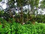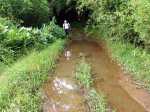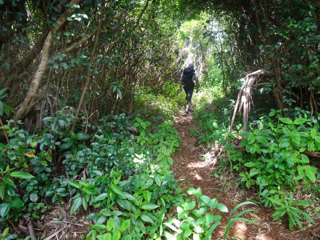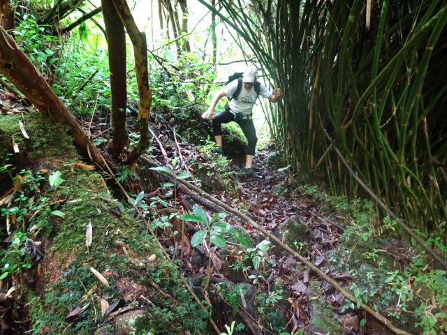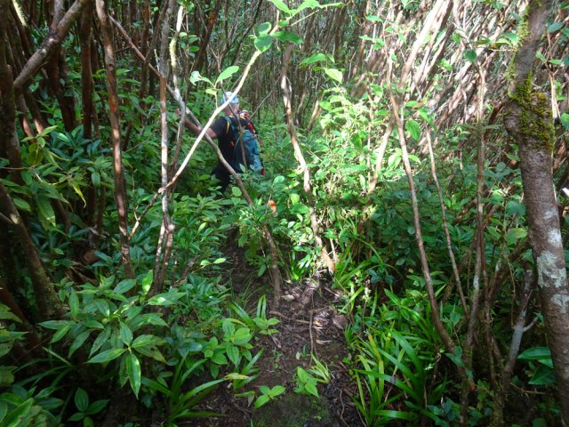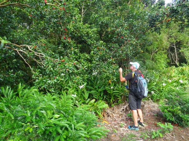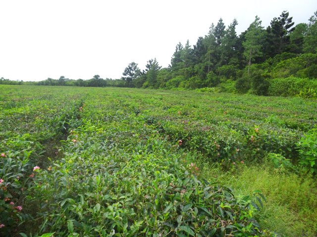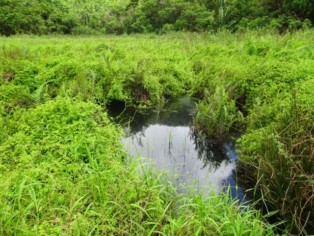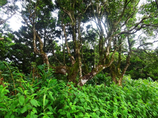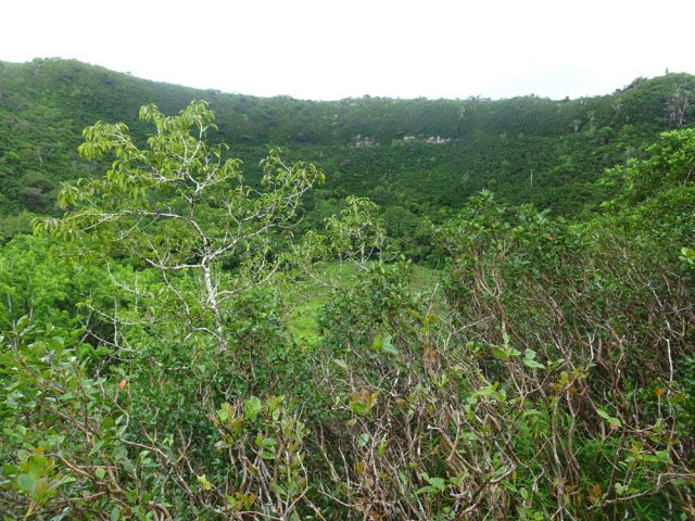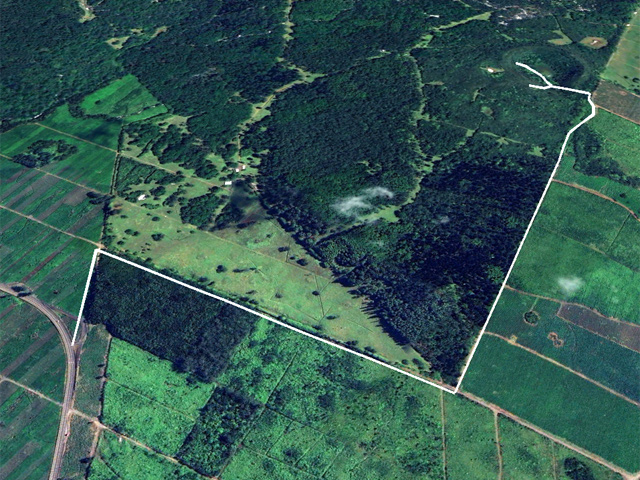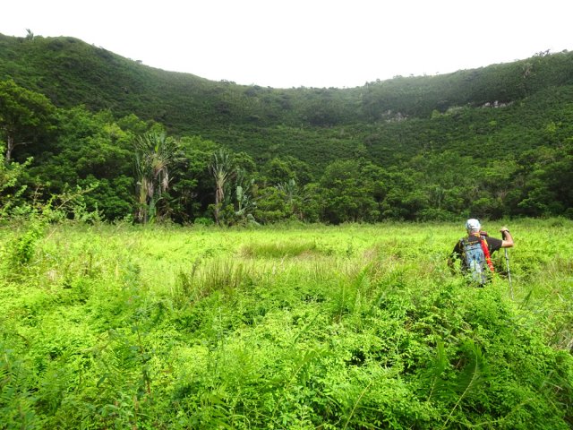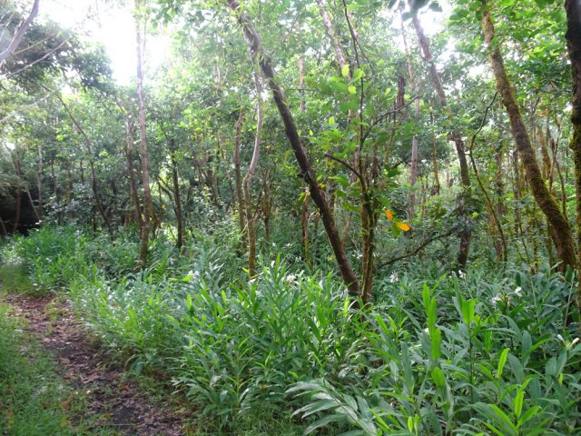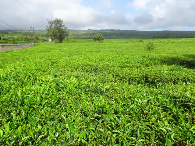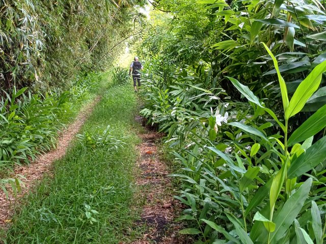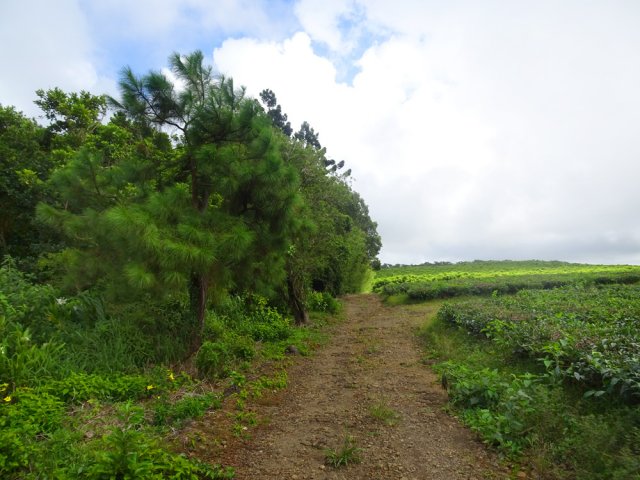La randonnée débute sur la B88, entre Bois Chéri et Grand Bassin. Dans un virage vers la gauche, repérer le panneau "Kanaka Crater" à l'emplacement d'un ancien virage de la B88 (Photo 1). Quelques places de stationnement se trouvent aisément avant d’entamer la randonnée. Aucune indication pour trouver le départ, mais il n'y a qu'une piste qui s'enfonce vers l'ouest entre une forêt et d'immenses champs de thé (Photo 2). Il pousse ici à perte de vue sous un climat qui lui est favorable (Photo 3). A la première intersection, obliquer à droite puis emprunter un large chemin entre bambous et quelques arbres (Photo 4). La marche y est facile et rapide sur terre ou herbe verte (Photo 5). Sur la droite, le sous-bois clairsemé est humide (Photo 6). De l'autre côté, une épaisse haie de bambous cache la vue d'une grande prairie entourée de grillage (Photo 7). Les parties humides se contournent facilement (Photo 8). Après une longue traversée verdoyante, on parvient à la fin d'une petite route de desserte des champs de thé. Prendre à gauche et profiter des goyaviers de Chine qui remplacent momentanément les bambous (Photo 10). Le paysage change. On retrouve les grandes étendues de plantations de thé, quelques conifères et autres grands arbres (Photo 11). On a ainsi tout le loisir d'étudier la disposition des pieds de thé pour en faciliter la récolte (Photo 12). Quelques gros camphriers dépassent des sous-bois (Photo 13). On retrouve cependant les haies de bambous le long d'un chemin toujours aussi rectiligne et plat (Photo 14). Elles vont jusqu'à créer de véritables tunnels végétaux (Photo 15). On ne quitte guère les champs de thé. L'un d'entre eux sert de repère pour se rapprocher du cratère. Il est tout en longueur entre de hautes haies (Photo 16). Juste en face, côté lisière, on trouve très facilement le sentier qui pénètre dans la végétation (Photo 17). Il monte doucement entre goyaviers et tabac bœuf en direction du bord du cratère (Photo 18). On l'atteint très rapidement. Il se reconnaît à quelques ravenelles, un poteau avec de la peinture bleue indique le début de la descente (Photo 19). Auparavant, obliquer un peu sur la gauche et rejoindre un endroit dégagé servant de point de vue. On distingue assez bien l'ensemble de la grosse dépression malgré les arbres (Photo 20). Retrouver le sentier puis entamer la descente sur une trace très étroite et pentue. Les goyaviers aident à éviter les glissades (Photo 21). Le passage est discret mais ne se perd pas des yeux (Photo 22). Comme lors de la descente vers le fond du Trou aux Cerfs, on devine des vestiges de travaux. Le sol humide est glissant. Les pierriers sont instables mais sans danger (Photo 23). La descente est courte et l'on parvient en quelques minutes au niveau du fond de cratère également recouvert de végétation (Photo 24). Très vite, ce sont les joncs et de hautes herbes qui dominent (Photo 25). La sortie peut prendre fin ici puisqu'on distingue très nettement l'ensemble du cratère (Photo 26). Si on décide d'aller plus avant, il faut savoir qu'on sera obligé de mouiller les chaussures car le terrain devient de plus en plus marécageux (Photo 27). On est d'ailleurs très vite bloqué par des mares peu profondes mais aux eaux noires peu engageantes (Photo 28). Il est donc préférable de remonter vers les champs de thé ou vers les goyaviers avant de revenir par les pistes jusqu'à la route.