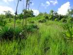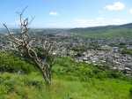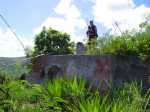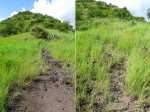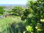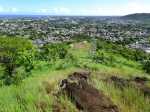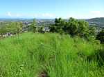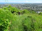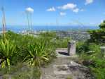 La randonnée débute le long de la Military Road et rejoint très vite un jardin paysager après avoir traversé un canal souvent à sec. Un panneau confirme la bonne direction après le canal (Photo 1). Lire, avant de partir, l'histoire de la fin de la Batterie Dumas lors de la guerre entre anglais et français en 1810 (Photo 2). Passer le jardin paysager et entamer la première partie de la montée sur une agréable petite route. On s'élève tranquillement au-dessus de Port Louis (Photo 3). Quelques arbres et des barrières en bois marquent la fin de la partie goudronnée (Photo 4). Le terrain devient très plat sur le plateau qui domine la ville. On a de belles vues sur le Pouce et les principaux sommets des environs. Repérer le belvédère construit au-dessus du plateau qui se rejoint par un escalier pour profiter du paysage (Photo 5). On devine le Priest's Peak qui semble tout proche (Photo 6). N'emprunter ni la piste partant à droite ni celle de gauche. Viser le premier pylône situé au bas de la pente (Photo 7). Le sentier n'est pas très évident à trouver mais on remarque la trace dans les herbes près de ce pylône. La montée débute rectiligne, comme toujours sur l'île. On domine maintenant les quartiers Nord de Port Louis (Photo 8). Les traces du sentier sont par endroits très faciles à suivre (Photo 9). D'autres fois, il est plus étroit et envahi d'herbes mais le passage historique demeure (Photo 10). Sur la gauche, le quartier de Sainte-Croix et la Cité la Cure donnent une idée de l'habitat de la banlieue (Photo 11). La montée n'est jamais très forte à travers les hautes herbes et quelques arbustes vivant chichement sur un sol pauvre (Photo 12). Les chocas bleus et bois noirs des bas se multiplient (Photo 13). A 200 m d'altitude, les panoramas se multiplient sur la capitale (Photo 14 et 15). La pente cesse sur une centaine de mètres pour reposer un peu les jambes mais avec la chaleur et le manque d'ombre, il vaut mieux poursuivre vers le sommet (Photo 16). La trace, plus ou moins facile à suivre, est toujours située sur la ligne de crête (Photo 17). Aucune végétation ne vient gêner les vues sur les pitons et Port Louis (Photos 18 et 19). La montée est rapide malgré la chaleur sur un sentier très facile à suivre par endroits ou caché par les herbes à d'autres (Photo 20). Après 45 minutes de montée, on s'approche du sommet abritant de plus en plus de chocas (Photo 22). Les galaberts se multiplient sur la dernière centaine de mètres (Photo 23). Le sommet est surmonté des ruines d'anciennes constructions (Photo 24). Très peu d'ombre pour se protéger après cette montée qui fait perdre beaucoup d'eau (Photo 25). Tout autour d'autres vestiges subsistent, mais plus aucun n'a de mur. Il est donc possible de faire demi-tour après avoir admiré le paysage à près de 360°. Après avoir traversé un bosquet, le sentier se poursuit vers le sud. On profite de nouveaux paysages en direction du Pouce et de la barre rocheuse de la Fenêtre (Photo 26). On voit très peu la Fenêtre, cette grande cassure qui se remarque très bien depuis la capitale. On doit la repérer au rocher isolé qui la domine (Photo 27). Le sentier qui y mène est du même acabit que celui qui vient de se terminer. Il ne faut donc pas s'y rendre seul, prévoir beaucoup d'eau et de temps. Le retour s'effectue par le même itinéraire que celui emprunté dans la montée avec, cette fois, la capitale toujours devant soi (Photo 28).