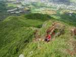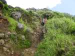 La randonnée débute au quartier Bangladesh. Stationner aux alentours de Pouce Street puis rejoindre à pied le début du parcours en frôlant quelques modestes cases (Photo 1). Une fois cette première centaine de mètres peu incitatifs, on se retrouve sur un chemin grimpant en pente douce en direction du Pouce sous quelques grands arbres (Photo 2). Les roches sont peintes en blanc pour confirmer le bon itinéraire. Le manque d'entretien par endroits a facilité l'implantation de grandes herbes et autres plantes. On longe la chaîne du Snail Rock sur la droite. Jamais la montée n'est difficile (Photo 3). Après une vingtaine de minutes, on parvient à une bifurcation marquée par quelques panneaux qui indiquent distances et temps de marche (Photo 4). Prendre à droite du panneau et délaisser le sentier de gauche. La montée au Pouce débute dans des sous-bois très touffus envahis de lianes papillon assombrissant fortement le parcours (Photo 5). Ces lianes sont si touffues qu'il est impossible d'y repérer un sentier qui les traverserait. La marche s'effectue sur des lits de feuilles mortes en évitant les pierres et roches encombrant le sentier (Photo 6). Il n'y a pas à réfléchir pour trouver son chemin. La montée est régulière entre de hautes haies de lianes et des bosquets de goyaviers (Photo 7). Une demi-heure après la bifurcation, le chemin s'éclaire en arrivant aux premières clairières. On aperçoit enfin l'horizon et les pitons entourant Port Louis (Photo 8). Le sentier oblique sur la droite. Le sol est désormais recouvert de longoses à perte de vue. On ne les quittera guère jusqu'au sommet (Photo 9). La suite de la montée est facile dans une végétation qui a changé. Les palmiers se multiplient et les califons bordent le sentier parfois humide (Photo 10). On a gagné en altitude donc en panoramas sur les montagnes et villes du centre (Photo 11). On s'est élevé de 500 m depuis le départ et la ville de Port Louis a rapetissé (Photo 12). On s'approche très vite du sentier le plus utilisé depuis Moka. Le Pouce est désormais bien visible au-dessus des longoses (Photo 13). Fini l'étroit sentier, humide ou caillouteux. On entame cette dernière montée sur un large parcours usé par les dizaines de marcheurs quotidiens (Photo 14). Quelques promontoires rocheux du côté de Moka permettent d'apercevoir le parking et de mieux comprendre pourquoi les randonneurs sont plus nombreux à venir de là, la distance est plus courte (Photo 15). Par beau temps, profiter des vues dégagées sur une bonne partie de l'île (Photo 16). Tout en repérant le prochain promontoire, repartir à l'assaut du Pouce en longeant la falaise (Photo 17). La montée s'intensifie légèrement. De nouveaux sentiers parallèles ont été créés lorsque l'affluence est forte (Photo 18). La profondeur de la terre creusée témoigne de l'intérêt que portent les randonneurs à ce sommet (Photo 19). On voit de mieux en mieux les grimpeurs sur l'arête (Photo 20). Ne pas manquer la longue chaine montagneuse qui abrite le très caractéristique Pieter Both (Photo 21). Après un dernier petit plateau donnant sur le nord, entamer la montée dans les longoses et goyaviers (Photo 22). Très vite, on parvient à de véritables murs, parfois glissants. Il faut s'aider des mains pour les franchir (Photo 23 et 24). Sur la droite, une grande forêt abrite des singes. Ne pas hésiter à observer la cime des arbres pour tenter de découvrir les macaques crabiers qui se délectent des fruits (Photo 25). La fin de l'ascension est tout aussi éprouvante, surtout pour les randonneurs occasionnels (Photo 26). Une fois au sommet, les difficultés prennent fin, du moins pour un temps. On peut à loisir observer les points caractéristiques de l'Île Maurice, même si aucune table d'orientation n'y est installée (Photo 27). Le sommet est encombré de roches mais assez plat pour ne courir aucun risque (Photo 28). Entreprendre la descente par le même sentier en prenant garde aux parties verticales et humides. Si un véhicule a été prévu à Moka, il est possible d'y redescendre une fois atteint le croisement. Sinon, reprendre l'itinéraire emprunté à l'aller et regagner le quartier de Bangladesh.