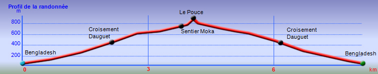 Le Pouce est une montagne caractéristique de l'Île Maurice. On voit de très loin cette pointe ressemblant à un pouce levé. La montée, ludique pour certains semble plus difficile pour d'autres. Nombreux sont les Mauriciens qui se lancent à l'assaut de cette pointe à la pente abrupte sur les 100 derniers mètres. Ils viennent principalement de Moka pour une courte ascension assez facile. Il est également possible de venir de Port Louis depuis le quartier de Tranquebar ou celui de Bangladesh. Le circuit n'est pas très difficile mais beaucoup plus long. Là également, deux possibilités : en passant par Dauguet, le plus utilisé par les randonneurs, ou par le quartier Bangladesh. Cette fiche détaille justement cette dernière possibilité. Les quartiers périphériques de Port Louis ne sont pas toujours très attrayants et abritent quelques meutes de chiens errants. Le bâton de marche est donc conseillé pour les premiers hectomètres. La première partie emprunte une piste lentement transformée en sentier. La seconde s'effectue sur un sentier classique de l'île par des montées souvent rectilignes, sur des pierres au milieu des lianes papillon. On rejoint plus haut le sentier venant de Moka pour une ascension commune.