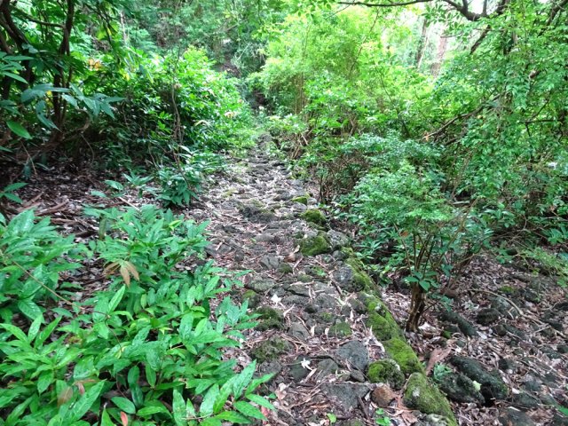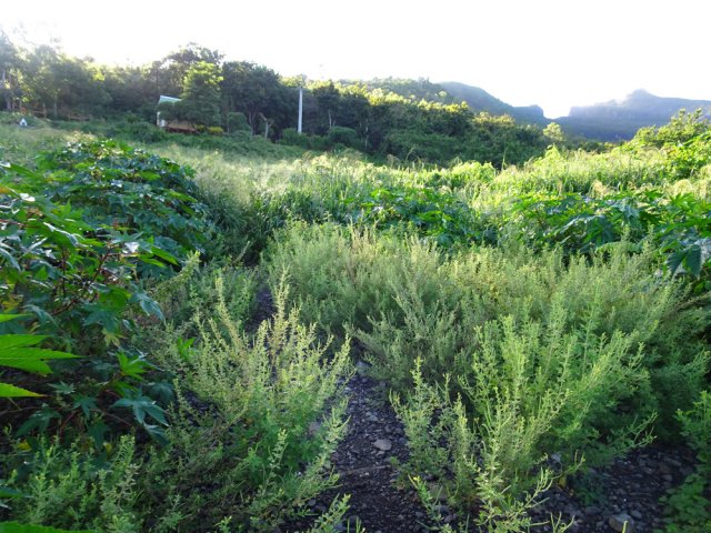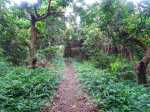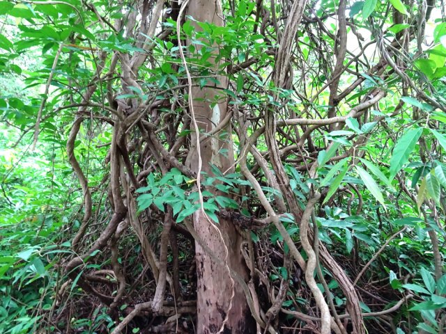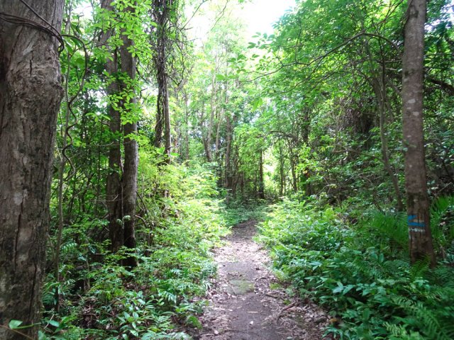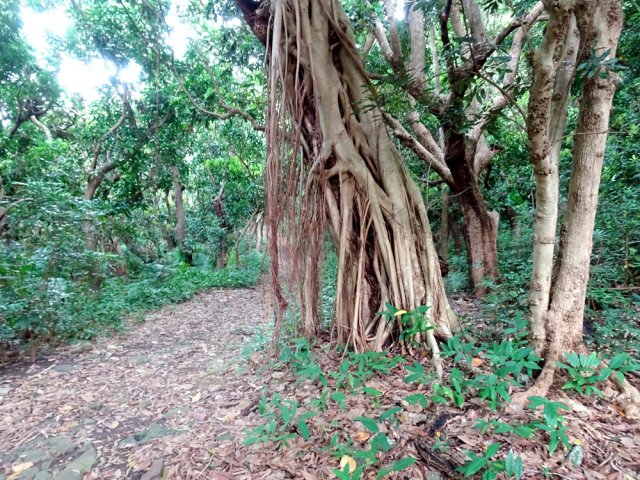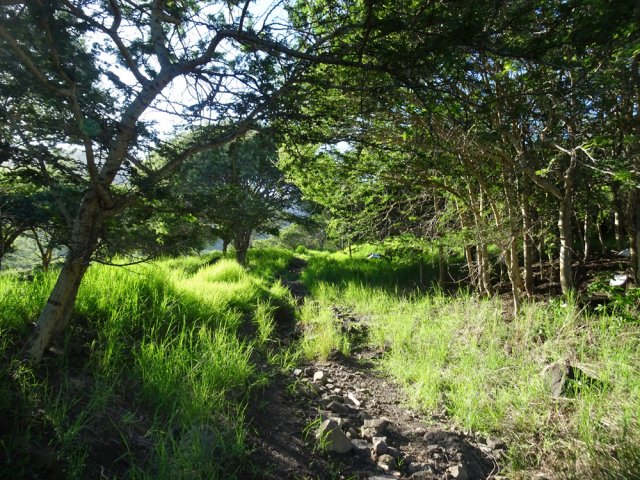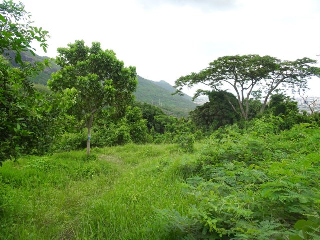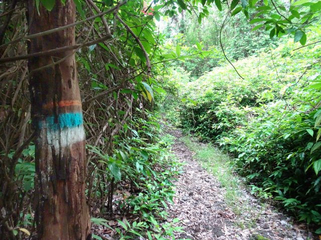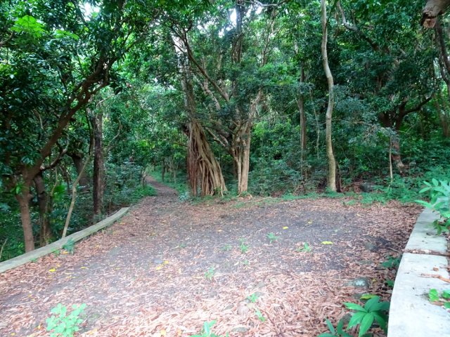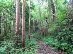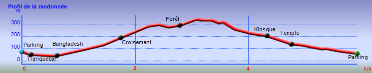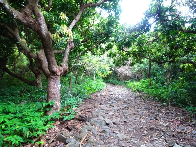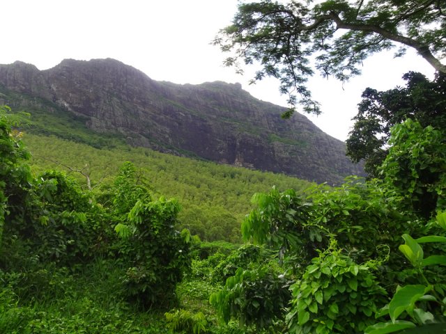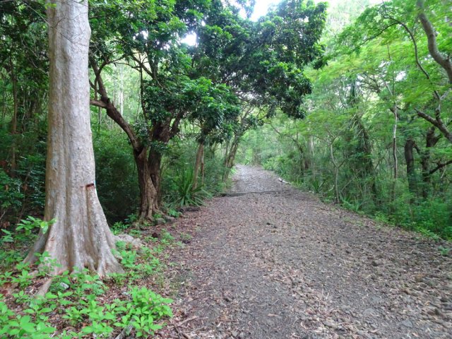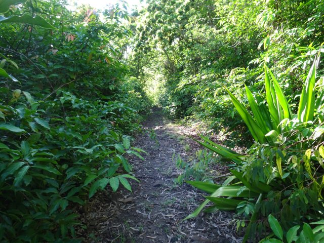 La randonnée débute à un parking d'une dizaine d'emplacements avant la chaîne barrant le passage vers la route. Un panneau schématise les circuits possibles avec quelques explications. Sur le côté quelques modules sont utilisés par les sportifs en début ou fin d'entraînement. Trouver le sentier qui commence près des toilettes en direction de la ville (Photo 1). Il est un peu encombré de plantes mais encore utilisé par les habitants pour éviter de marcher longuement dans les rues. La carte en main, partir à gauche sur Cremation Groung Street puis rejoindre le départ du circuit en direction du Pouce en traversant des quartiers populaires. Les vues sur la montagne permettent de reconnaître le Snail Rock ou, plus à gauche, Le Pouce souvent dans les nuages au petit matin (Photo 2). Quelques cases très modestes ou abandonnées, bordées de détritus, longent le début de la montée confirmée par quelques taches de peinture blanche sur les rochers. La pente est faible sur ce qui fut une piste désormais inutilisée et envahie par quelques herbes (Photo 3). Les arbres ne cachent pas totalement les sommets dont Le Pouce dont on prend la direction (Photo 4). La piste droite est facile à suivre malgré les herbes (Photo 5). La marche se rapproche du pied de la haute falaise du Snail Rock qu'on devine dans les trouées (Photo 6). La piste est petit à petit remplacée par un sentier envahi de lianes papillon qui poussent en très grandes quantités durant la montée au Pouce (Photo 7). 30 minutes après les cases du départ, on parvient à un croisement avec des panneaux indiquant les distances et temps vers diverses destinations. Délaisser le sentier de droite et emprunter celui de gauche (Photo 8). Le sentier est d'abord assez plat dans les lianes, heureusement taillées régulièrement (Photo 9). On retrouve des traces de l'ancienne piste qui servait pour les cultures au siècle précédent (Photo 10). Impossible de s'égarer tant les lianes poussent dru et envahissent les arbres qui meurent en quelques années (Photo 11). On ne quitte plus cette piste pavée souvent de bonne qualité. Il subsiste même des travaux de soutènement ou d'évitement de ravines (Photo 12). Le parcours traverse de plus en plus de belles forêts. Les lianes diminuent par endroits. Les eucalyptus deviennent plus nombreux que les autres arbres (Photo 13). Ils sont remplacés plus loin par les poiriers marrons (Tabebuia heterophylla) qui atteignent par endroit des tailles imposantes. Profiter des dernières portions plates sur cette trace mi-sentier, mi-piste (Photo 14). Une descente débute. De grandes ornières creusées par les crues et fortes pluies ont abîmé la piste qu'on arrive cependant à suivre en prenant garde à la glissade. Certaines ornières approchent les deux mètres de profondeur. La remise en état de la piste est difficilement envisageable sans d'énormes investissements. La descente est bordée cette fois de nombreux palmiers dont les fruits doivent attirer les singes (Photo 15). On retrouve également les manguiers en bordure de sentiers qui confirment que la zone était cultivée (Photo 16). On parvient un peu plus loin à une grande clairière d'où l'on peut apercevoir des quartiers de Port Louis (Photo 17). On retrouve les flancs du Snail Rock que l'on suivait de plus près dans la montée (Photo 18). Partir sur la droite. Escalader quelques branches tombées sur le sol et parvenir à un nouveau verger de manguiers (Photo 19). On arrive ainsi au croisement de la petite boucle de Dauguet. Un panneau sur la gauche indique plusieurs directions (Le Dauguet, Le Pouce et Moka Range Chalenge). Très près, le kiosque attend les rares pique-niqueurs obligés de porter longuement leur nourriture sur le dos (Photo 20). Près du kiosque une esplanade permet de faire demi-tour aux véhicules autorisés (Photo 21). Un grand figuier étrangleur en marque le début (Photo 22). On devine un peu plus loin un temple sous de grands arbres. Les offrandes, sous forme de nourriture et surtout de fruits, attirent une trentaine de macaques crabiers peu farouches (Photo 23). On reste sous des manguiers tortueux mais on ne pourra pas cueillir de fruit depuis longtemps consommés par les primates (Photo 24). La piste s'élargit de nouveau et il faut éviter les pierres qui dépassent (Photo 25). Par moments, des cactées ont envahi la cime des arbres allant jusqu'à faire craquer les branches sous leur poids (Photo 26). La fin de la piste devient une promenade reposante dans la belle forêt, sur un sol plus sableux, totalement plat (Photo 27). Elle reste plate jusqu'à l'eucalyptus planté au croisement des sentiers de la petite boucle de Dauguet (Photo 28). Encore quelques mètres de piste et on arrive sur la route goudronnée bordée de nombreuses barrières en bois menant au parking du départ de cette grande boucle de Dauguet.