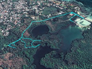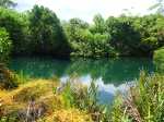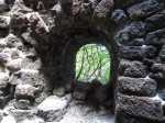 La randonnée débute près de l'église. Avant de stationner, repérer sur la carte la grotte Madame à l'entrée du village. On descend à la grotte remplie d'eau par des escaliers, pour une visite rafraichissante si des courageux osent s'y baigner (Photo 1). Après la visite et le stationnement près de l'église, marcher un peu sur la B15 pour profiter des jolies vues sur la baie (Photo 2). La visite de l'église est possible lorsque le portail est ouvert aux heures fixées. Le petit bâtiment récent est sous quelques filaos (Photo 3). Côté lagune, on remarque une route qui traverse l'étendue d'eau (Photo 4). Elle mène à une propriété bordée de cocotiers (Photo 5). En empruntant la piste entre lagune et église, on peut se rapprocher de cette route traversante à l'ombre de quelques arbres (Photo 7). Aucun panneau d'interdiction n'empêche de se rapprocher des cocotiers mais il est plus respectueux d'en rester éloigné et de faire demi-tour une fois sur le pont (Photo 8). Revenir à l'église et emprunter la piste qui la longe. C'est une des rares parties de la randonnée qui se trouve à l'ombre (Photo 9). Après le mur d'enceinte d'une propriété, on se retrouve dans une savane peuplée de quelques faux poivriers (Photo 10). Aucune difficulté pour suivre le sentier, plus fréquenté par les jeunes du quartier que par les randonneurs (Photo 11). La marche s'effectue totalement à plat, sans effort hormis la chaleur. On parvient à quelques eucalyptus (Photo 12). Prendre à gauche à la première bifurcation et marcher sous le couvert des arbres. On parvient très vite au premier bassin d'eau sombre (Photo 13). La baignade n'y est pas très tentante même si le bassin est fréquenté. Il n'y a pas de plage et l'accès est assez difficile dans la végétation (Photo 14). En poursuivant par le sentier et en se baissant un peu pour éviter les branches, on parvient de l'autre côté de la grande lagune aperçue depuis la route (Photo 15). Faire demi-tour et reprendre la progression. On remarque très vite des murs en ruine derrière les lianes et arbustes épineux (Photo 16). En cherchant un peu, on repère très vite les sentiers créés par les curieux, amateurs de ruines. On repère cette fois la fenêtre d'une grande tour (Photo 17). Il s'agit d'un four à chaux dont on peut également s'approcher en passant par cette fenêtre. L'intérieur dévoile une architecture de pierres de laves taillées, remarquablement conservées (Photo 18). On peut pénétrer dans ce four, en sortir par la porte et remarquer l'incroyable épaisseur destinée à conserver la chaleur élevée dans le four (Photo 19). Une deuxième tour se dresse tout près. On peut cette fois y pénétrer par la porte, tout aussi épaisse que la précédente (Photo 20). Les milliers de degrés accumulés durant les années d'exploitation ont un peu plus abîmé la structure mais l'ensemble est assez solide pour envisager une remise en état (Photo 21). La fenêtre est ici plus difficile d'accès et impose de ressortir par le bas (Photo 22). Continuer l'exploration et repérer les tours en s'en éloignant (Photo 23). Le bruit que font les jeunes ou les engins garés sur le côté évitent de trop chercher son chemin. On tombe sur un nouveau trou d'eau mais également trop encombré de taros pour envisager une trempette (Photo 24). Tout près, le plus connu et le plus fréquenté est rempli d'une eau plus claire qui incite à la baignade (Photo 25). En cherchant un peu dans les parages on a vite fait de découvrir de nouveaux trous d'eau, souvent très envahis de toutes sortes de plantes aquatiques (Photo 26). L'endroit abrite soit-disant une grotte. En demandant aux jeunes, ils indiquent aussitôt un chemin empierré et conseillent de marcher jusqu'au bout (Photo 27). La grotte s'avère n'être qu'un oratoire dédié à la Vierge au fond de sa niche bleue. Cette allusion à Lourdes a certainement donné le nom de grotte au petit édifice (Photo 28). Le chemin se poursuit en direction du village mais les trous d'eaux caractéristiques ont tous été aperçus. On peut donc faire demi-tour par le chemin le plus direct pour revenir au véhicule avant de se rendre, ou non, aux 6 entrées de Princess Margaret Cave, à condition d'être équipé de lumière.