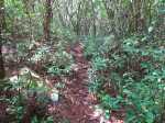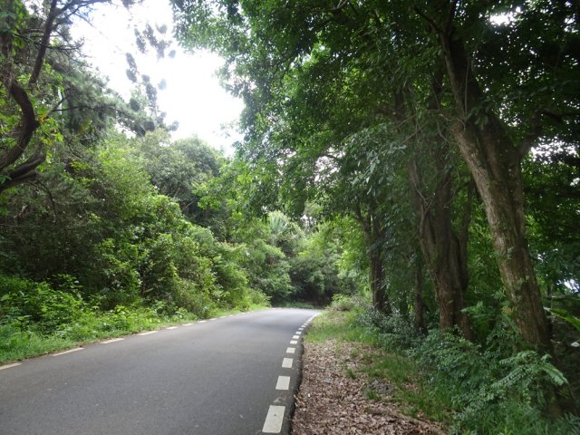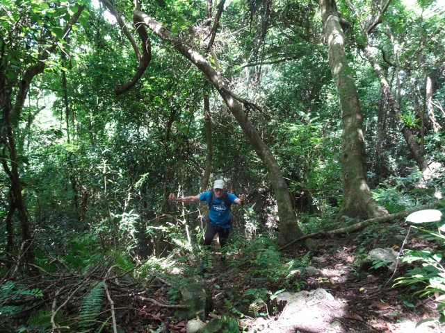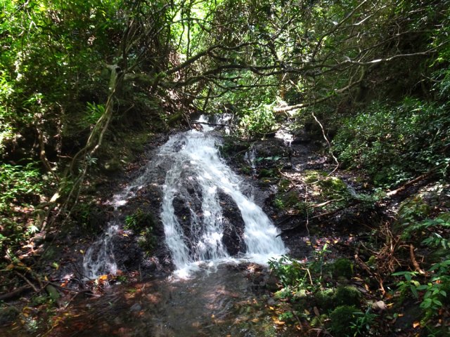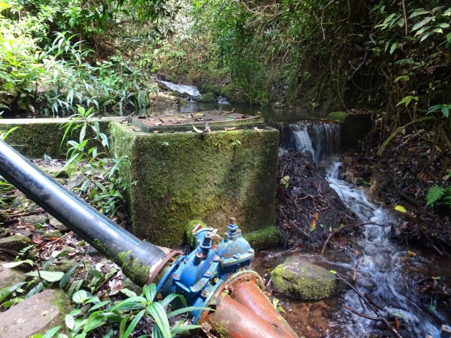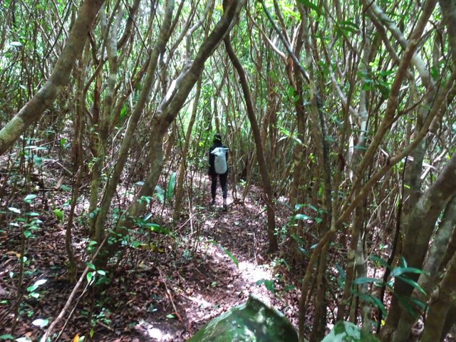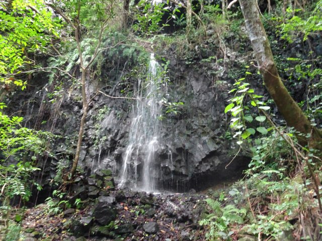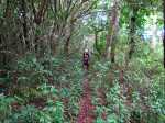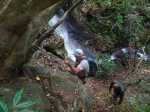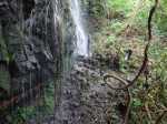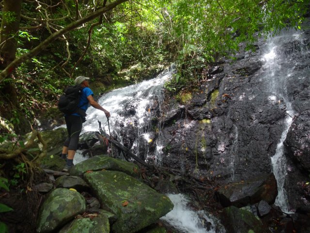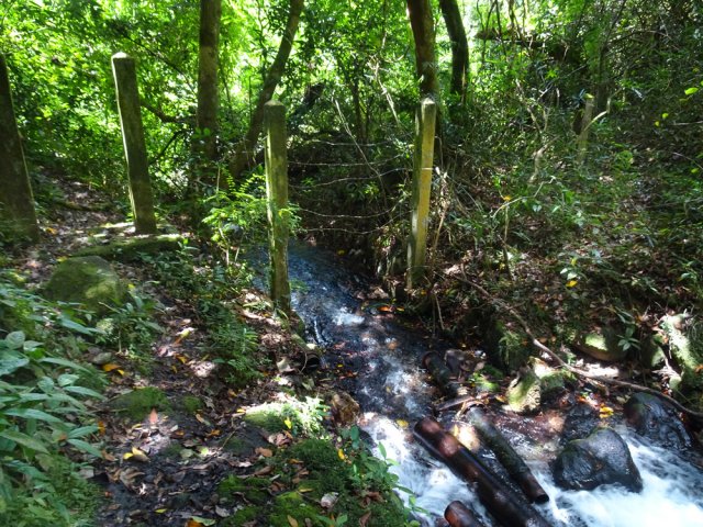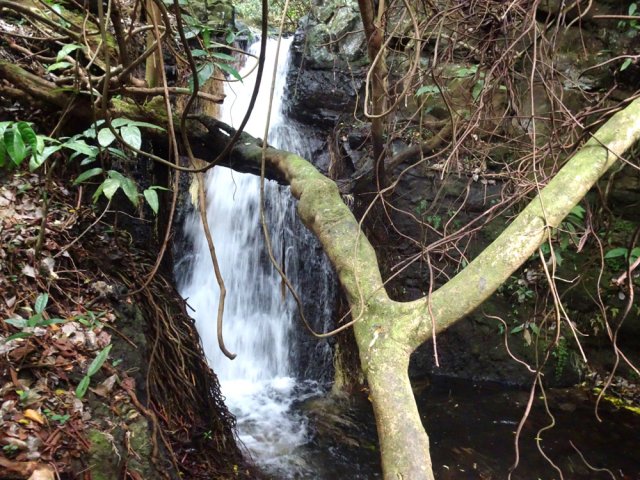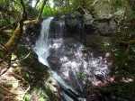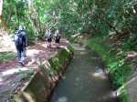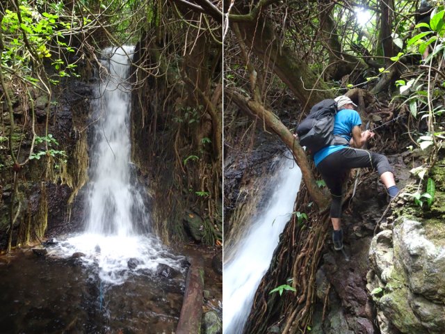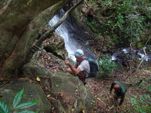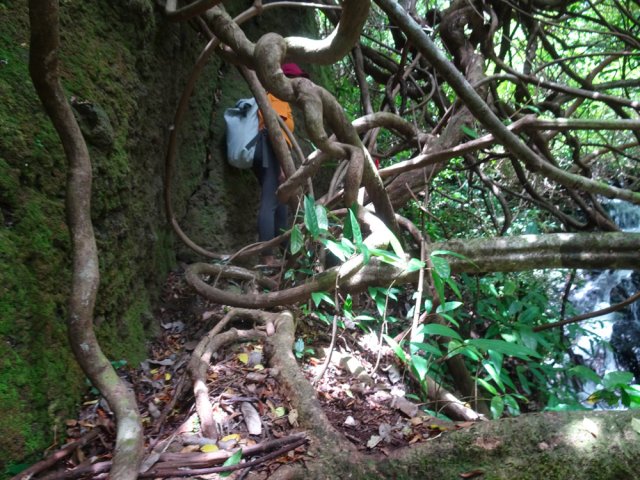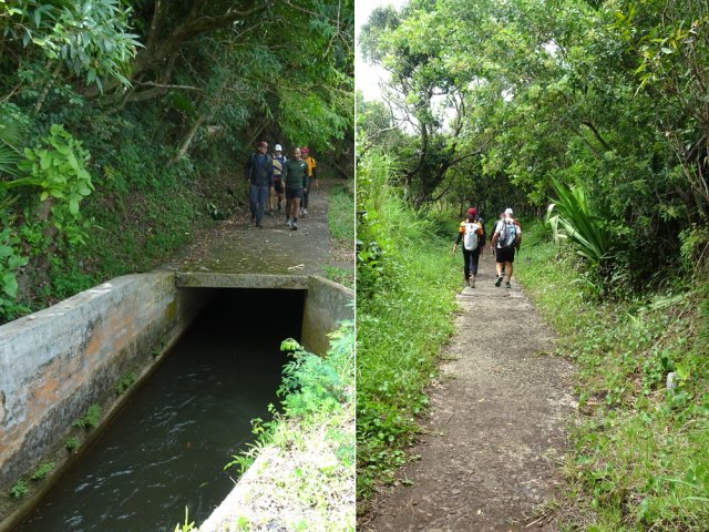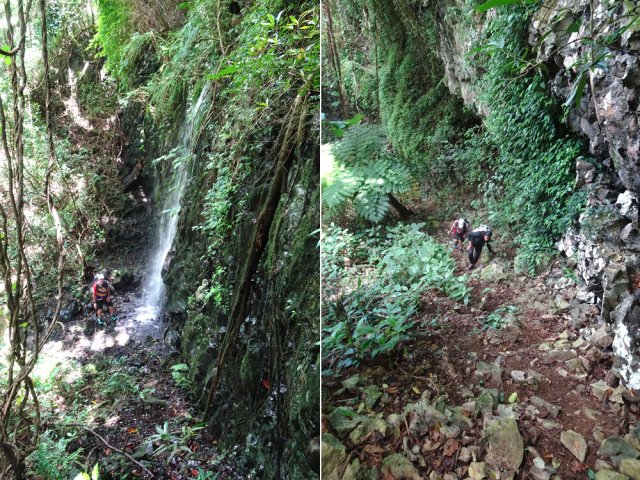 La randonnée débute au réservoir de la Nicolière. Visiter les installations et les abords avant de se lancer dans cette courte aventure. Voir si nécessaire la fiche sur la première partie de cette boucle. La marche s'effectue totalement à plat le long du canal alimentant le réservoir. On le longe parfois lorsqu'il n'est pas couvert de béton (Photo 1). Cette promenade n'est pas assez difficile pour préparer la remontée sportive du torrent et de ses cascades (Photo 2). Après 2 kilomètres de promenade, on parvient à une passerelle canal enjambant une ravine, affluent de la Rivière des Remparts. Le Jamblon Bridge débute sous les jamrosats bordant la ravine (Photo 3). Son franchissement comporte quelques risques si les jambes flageolent. Prendre garde là où il n'y a plus de rambarde et éviter même de s'appuyer sur celle en place (Photo 4). De l'autre côté, poursuivre un peu le long du canal jusqu'à ce que celui-ci oblique à gauche. Trouver dans le sous-bois un petit sentier discret partant sur la droite. Peu fréquenté, il est cependant facile à deviner. On parvient en quelques minutes au ruisseau où l'on rencontre les premiers captages (Photo 5). Rester au plus près de l'eau et rejoindre la première chute de la montée. Elle fait moins de 10 m et ne possède pas de bassin. Pas de sentier pour la contourner. Il faut repérer la corde en rive gauche et se hisser à la force des bras (Photo 6). On tombe immédiatement sur une autre chute se contournant en rive droite (Photo 7). La trace sur la berge est discrète mais on peut toujours la suivre à l'instinct. Elle mène à une troisième petite cascade protégée par un arbre qui empêche de s'en approcher facilement (Photo 8). Le contournement, toujours en rive droite, passe entre d'énormes lianes papillon qui obligent à se contorsionner en prenant garde à ne pas glisser vers la cascade (Photo 9). Plus haut, la prochaine est un haut toboggan tombant sur des roches basaltiques (Photo 10). Là également, la poursuite vers l'amont est une aventure au milieu des lianes grosses comme des cuisses, sur un sentier glissant et très étroit (Photo 11). La cinquième cascade est assez esthétique, mi-chute, mi-toboggan dont une partie file dans un tuyau de prise d'eau (Photo 12). L’échappatoire est aussi sportive que pour la première. Heureusement une corde permet de passer l'obstacle abrupt (Photo 13). Après un très court cheminement, on arrive à la cascade n°6, aussi discrète que les autres (Photo 14). La prochaine n'est pas comptabilisée puisque c'est l'écoulement d'un petit barrage de recueil (Photo 15). D'anciens barbelés et une porte symbolique, départ d'un sentier d'entretien, indiquent que le lieu fut sans doute protégé à une certaine époque (Photo 16). A partir du barrage, le sentier est difficile à suivre ou disparaît. Poursuivre donc par le torrent, marcher le plus souvent dans l'eau en prenant garde aux roches glissantes (Photo 17). On arrive plus haut sur le seul véritable bassin de la journée où l'eau très fraîche ne rebute pas tous les randonneurs (Photo 18). Après le bassin, on poursuit la montée en direction de la septième chute. Il s'agit en réalité de la source du ruisseau surgissant d'un petit tunnel caché dans la végétation (Photo 19). L'eau est encore plus fraîche que dans le bassin (Photo 20). La montée au petit tunnel est assez acrobatique. Poursuivre vers l'amont en partant sur la droite pour affronter une rude montée sur d'anciens éboulis instables où le pied a vite fait de glisser (Photo 21). Au passage, remarquer la grotte qui doit abriter les singes lors des forts épisodes pluvieux (Photo 22). Après l'éboulis, on retrouve un sentier classique sur les racines et l'on arrive dans une partie boisée (Photo 23). Le sentier, plus fréquenté, permet aux habitants de se rendre à la source et peut-être au bassin (Photo 24). La traversée de la forêt, presque plate, se fait facilement après l’effort de la montée (Photo 25). On entend passer les véhicules sur la B49 et on quitte bientôt le couvert des arbres (Photo 26). La circulation est variable en fonction des jours de la semaine. Prendre à droite et entamer la longue descente des deux lacets sur une large route, agréable dans la belle forêt (Photo 27). Il n'y a pas de raccourcis pour rejoindre la route en coupant les lacets. La descente se termine dans un véritable tunnel végétal créé par les jamrosats penchés (Photo 28). On rejoint le parking où des vendeurs proposent rafraîchissements et fruits afin de terminer cette boucle sereinement et oublier les efforts de la montée de ravine.