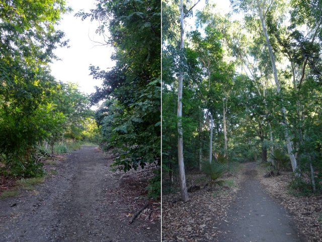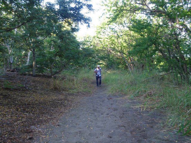 La randonnée débute à l’Étang-Salé les Bains où un grand parking est situé près du premier rond-point à l'entrée de la ville. Partir vers la ville et bifurquer presque aussitôt le long du canal qui coule en direction de l'étang. Un sentier le longe. Les lotus envahissent tout d'abord le fond du canal qui s'élargit plus loin près d'une passerelle (Photo 1). Franchir la passerelle puis rejoindre l'Avenue Bourbon. Marcher vers les terrains de sport et longer le premier terrain en direction de la forêt entre habitations et grillage (Photo 2). Poursuivre vers la RN1 en empruntant le sentier de gauche, plus calme que celui de droite où coureurs et cyclistes se bousculent presque par moments (Photo 3). On arrive au premier tunnel passant sous la Route des Tamarins. Il y en aura encore 4 ainsi que 2 ponts avant de revenir au point de départ (Photo 4). On se retrouve très vite à un embranchement de 5 directions. Emprunter la piste la plus à gauche vers le Jardin d'Oiseaux (Photo 5). C'est une balade à plat sur une piste sableuse qui s'enfonce au cœur de la Forêt de l’Étang-Salé (Photo 6). Hormis le bruit de la route toute proche, la progression se fait sereinement entre margousiers et acajous du Sénégal (Photo 7). Certaines portions sont bétonnées, d'autres envahies de sable. On franchit de minuscules ravines qui ont drainé du sable sans gêner la marche. Plus haut, prendre garde à la traversée de la RD17 qui peut comporter un peu de circulation. Plusieurs destinations sont possibles après la traversée. Filer plein ouest, toujours sur le sable, à l'ombre des arbres clairsemés (Photo 8). Se rapprocher de la RN1 puis repartir cette fois plein nord. On rencontre un panneau du centre de formation des chasseurs avant de parvenir à la piste DFCI des Tamarins. Partir à gauche sur une nouvelle piste en prenant garde cette fois aux nombreux vélos (Photo 9). La large piste est bien entretenue (Photo 10). Elle descend en direction d'un bois d'eucalyptus. On rejoint à nouveau la RN1 avant d'obliquer à gauche pour revenir au sud emprunter le tunnel n°2 qu'on rejoint après une dizaine de mètres en hors sentier dans les herbes. La partie aventure débute à la fin du tunnel. Le sentier, bien représenté sur la carte IGN, est devenu très aléatoire par manque de fréquentation. On aperçoit bien quelques traces de pas mais rares. Les chocas, herbes, bois noirs des bas et galaberts ont colonisé la zone et il faut chercher à tout moment l'ancienne trace (Photo 11). En prenant son temps et en regardant la carte, on est sûr de traverser l'endroit sans encombre (Photo 12). Au plus près de la RN1, on se retrouve près de la plage et l'on rencontre un sentier qui en vient. A partir de là, le passage longe des dunes couvertes de touffes de graminées (Photo 13). Depuis le sommet, on peut voir jusqu'à l’Étang-Salé (Photo 14). Les traces de pneus sur le sable indiquent que les vététistes aident à l'entretien naturel de la trace (Photo 15). Après 300 m, ne pas manquer l'embranchement discret près d'un tamarin. Partir à droite vers la RN1 (Photo 16). On reviendra à ce croisement par le sentier de gauche. Le sentier est bien marqué jusqu'au troisième franchissement de tunnel. Après le tunnel, on retrouve une zone où le sentier est difficile à deviner par endroits. Heureusement le sous-bois est dégagé pour rejoindre la piste plus au nord. Marcher en direction de la Ravine Mila sur des pistes et sentiers très ensablés (Photo 17). En parvenant aux abords de la vallée, obliquer à gauche sur une allée bordée d'eucalyptus (Photo 18). On ne peut apercevoir le village des Avirons caché derrière la forêt recouvrant la rive droite de la ravine (Photo 19). Guetter la saignée dans la haute dune de sable qui permet de rejoindre la ravine en remplissant à nouveau les chaussures (Photo 20). Descendre, traverser le lit ensablé et rejoindre le nouveau tunnel qu'on délaisse pour partir à droite. Après une montée, le sentier, marqué de traces de pneus de motos longe un peu la RN1 avant d'obliquer vers la droite (Photo 21). Les traces, parfois profondes circulent entre de beaux arbres (Photo 22). On s'élève encore pour bénéficier de belles vues sur Bois Blanc et la Pointe des Avirons (Photo 23). Le sentier redescend en direction de la Ravine du Ruisseau puis remonte, longe le Chemin Pavé et finit à la route des Avirons. Partir à gauche et redescendre jusqu'au Chemin de la Pointe. Juste en face de la petite rue menant au gîte Fleur de Sel, descendre dans la ravine et la suivre vers l'aval jusqu'à un bassin plus profond (Photo 24). Une nouvelle courte aventure débute. Remonter la rive très sableuse en suivant les traces des biquettes, plus nombreuses que celles des randonneurs, et parvenir à une ravine au fond très rocheux qu'il faut suivre jusqu'à la réserve d'eau de la RN1 (Photo 25). Traverser un fourré jusqu'au tunnel 4 où l'on retrouve un sentier pris à l'aller. Rejoindre la Ravine Mila puis bifurquer à droite pour passer le 4ème tunnel. La marche s'effectue dans le lit de cette ravine caractéristique qui a creusé son passage dans les dunes noires de l’Étang-Salé (Photo 26). Au pont suivant, repartir immédiatement à gauche et suivre le sentier également emprunté dans la première partie. A la route des plages, descendre, traverser et atteindre le rond-point situé à la fin de l'Avenue Octave Bénard. 50 m plus loin, sur la gauche, débute un sentier agréable qui serpente dans les savanes et sous-bois (Photo 27). Pas de difficultés pour atteindre le camping sur cette trace ensablée (Photo 28). Longer le grillage du camping, poursuivre par la Rue Hoareau et partir à gauche en direction du parking.
