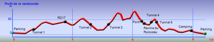PHOTOS 1 et 2 : cette première partie, du point de départ (parking) au deuxième tunnel est facile et serait même familiai à mon avis (avec quelques règles de prudence, notamment lors du passage de la RD17) .