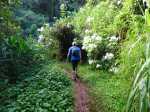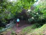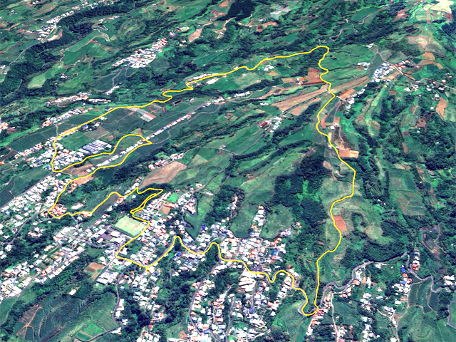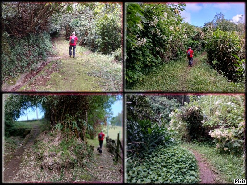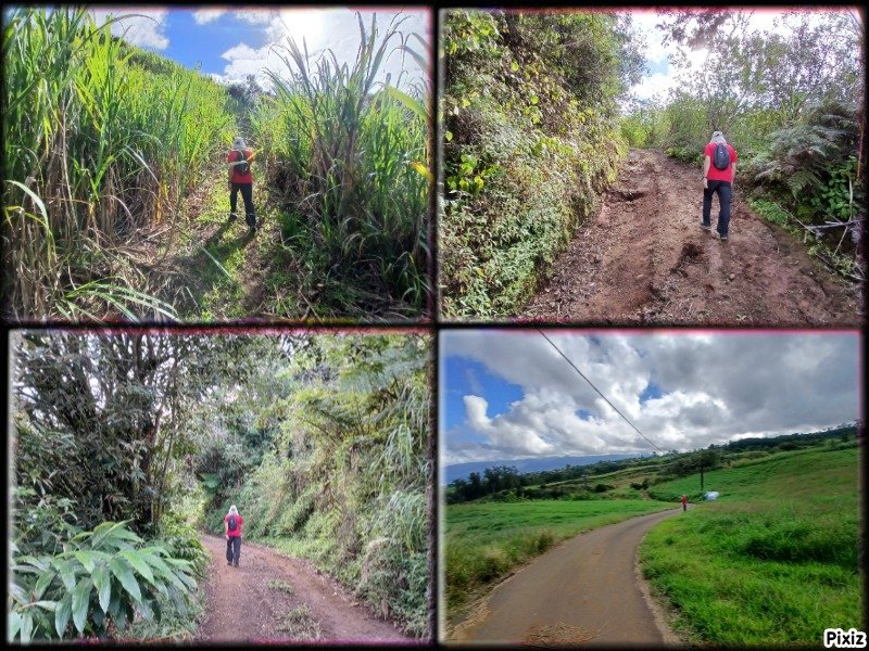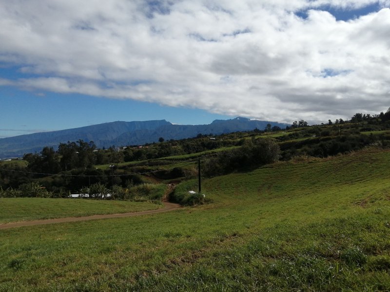 La randonnée débute ici à la poste de Piton des Goyaves proposant un lieu de stationnement. Partir à droite sur la rue des Platanes en direction de Petite Ile et passer quelques virages en changeant fréquemment de côté pour toujours être sur un trottoir (Photo 1). En fonction des horaires la circulation est plus ou moins importante. Lors de cette traversée urbaine, profiter de plusieurs points de vue en direction de la mer et du Piton de Mont Vert (Photo 2). Après 1000 m à plat, repérer l'arrêt de bus "Rue des Platanes" et emprunter la piste qui débute 20 mètres plus loin. Entamer une longue montée sur une piste parfois défoncée par les roues de tracteurs avec, par endroits, des portions glissantes (Photo 3). La montée de moins de 200 m est presque rectiligne sur une pente constante. La végétation comporte beaucoup de faux poivriers quand ce ne sont pas les cannes qui bouchent un peu la vue. Le Piton de Many, sur la gauche, presque plat, n'est guère impressionnant avec ses 790 m (Photo 4). Après 20 minutes de cette piste terreuse on parvient à des champs et des vergers sans arbres pour cacher les paysages (Photo 5). La piste se termine à l'Allée des Artichauts. Poursuivre à gauche à travers les premières prairies sur la petite route ouvrant de larges horizons. Les premiers troupeaux de vaches limousines font leur apparition. Peu habituées aux randonneurs, elles les regardent passer avec curiosité (Photo 6). A 850 m, les habitations sont très rares hormis quelques fermes. Les prairies et petits bois représentent l'essentiel de la verdure. Les panoramas sur le Dimitile, le Cirque de Cilaos et les grands sommets sont très agréables (Photo 7). On retrouve quelques champs et donc moins d'élevages par endroits (Photo 8). Après le Chemin du Piton des Goyaves, délaisser la route puis partir à droite sur une piste presque plane entre poivriers et longoses (Photo 9). Franchir le discret Bras de Mont Vert que l'on retrouvera, beaucoup plus joli, quelques hectomètres plus bas. La piste repart vers l'ouest, traverse de grands vergers d'agrumes avant de rencontrer plus bas la Route du Site (Photo 10). On conserve de superbes panoramas sur les sommets tout en cheminant sur une petite route étroite entre prairies et champs (Photo 11). Très près sur la droite coule le Bras Sec également bordé d'élevages bovins (Photo 12). La route, en légère descente, délimite de grandes prairies (Photo 13). Après le dernier grand virage, on arrive à nouveau au Bras de Mont Vert. Les très hauts talus sont couverts de splendides jamrosats qui tiennent malgré d'imposantes racines à l'air libre (Photo 14). La ravine a grossi depuis le dernier gué et l'eau coule une partie de l'année (Photo 15). On entend couler de l'eau vers l'aval. Quitter la route pour se rapprocher des trois petites chutes qui terminent au bas d'un cassé difficile à franchir (Photo 16). Poursuivre sur la Route du Site en longeant le bras qui semble très difficile à atteindre au fond d'un véritable canyon très verdoyant (Photo 17). La route se finit au village des Chênes. Poursuivre à gauche. Très vite, le Chemin Terre des Chênes ramène à la RD3 et la boucle pourrait prendre fin. Pour éviter ce retour trop urbain, reprendre à gauche le Chemin Acquier puis redescendre par le Chemin Elly Fontaine au milieu de quelques habitations et beaucoup de champs de canne (Photo 19). Cette dernière rue finit également sur la RD3 que l'on s'empresse de quitter pour remonter par l'allée des fougères, toujours dans les mêmes paysages. Ne pas manquer, sur la droite, le discret panneau vieillissant annonçant le Site Vivier (Photo 20). Marcher vers de grosses touffes de bambous sur une piste gazonnée. L'endroit servant de décharge a été reprise par l'association Pays d'Accueil du Sud Sauvage. Remis en état, il propose de belles balades ombragées et un parcours sportif. Une large piste descend en direction de la Ravine Vivier (Photo 21). Dans le premier virage, il est possible de poursuivre sur cette piste ou de partir en direction de la source (Photo 22). Près de la source, plusieurs panneaux accueillent les marcheurs et les sportifs (Photo 23). Poursuivre vers le stade du village qu'on aperçoit à la fin du large chemin ombragé (Photo 24). Afin de rallonger un peu la boucle, emprunter le sentier qui descend vers la Ravine Vivier. Remonter le petit cours d'eau par un des sentiers aménagés par l'association (Photo 25). Poursuivre dans la verdure en direction des touffes de bambous et de la source (Photo 26). Retrouver le chemin du stade et continuer vers la droite. Au stade, partir à gauche sur le sentier qui longe le grillage en profitant des dernières vues sur la côte vers Saint-Pierre (Photo 28). Rejoindre la RD3 puis la poste en obliquant à gauche.