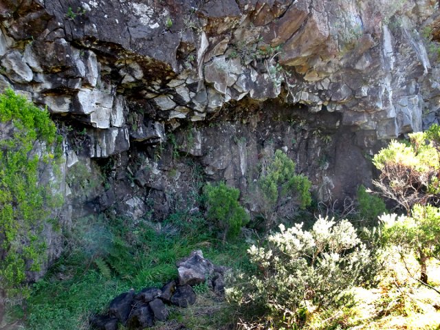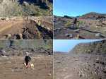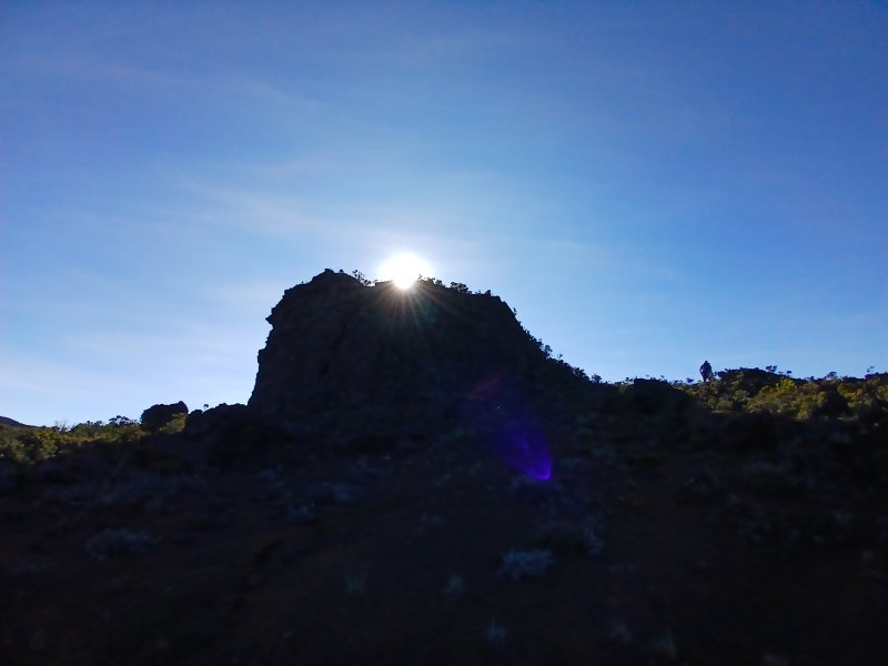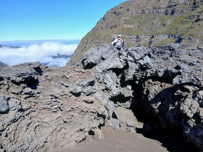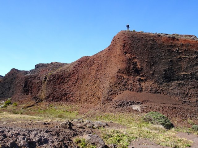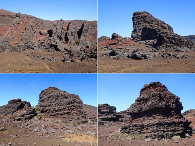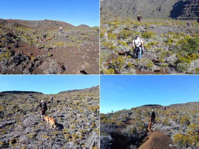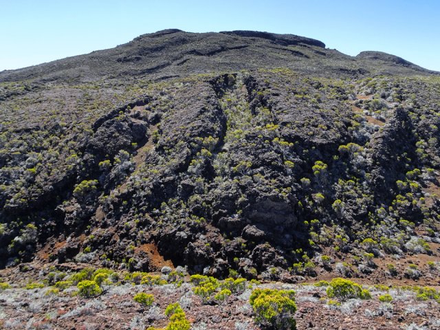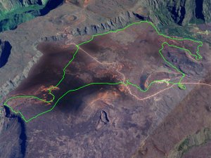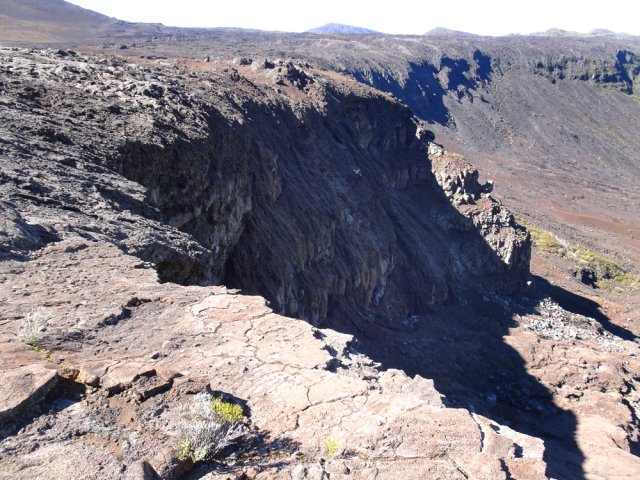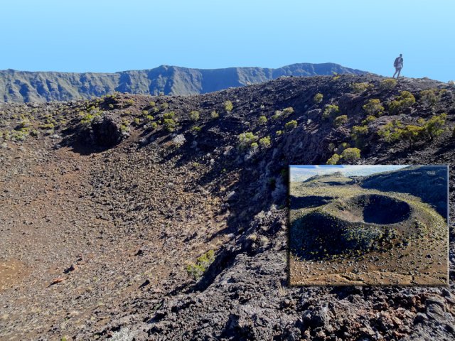 La randonnée débute à la naissance de la Plaine des Sables, à la fin des lacets de la route. Partir plein nord en se rapprochant du Rempart des Sables. Durant l'hiver austral, il est fréquent de commencer à marcher sur le givre qui craque sous le pied avant de fondre très vite aux premiers rayons du soleil (Photo 1). C'est différent avec la glace sur les flaques des ravines ou les cristaux qui soulèvent parfois très haut le sable et les lapilli. Par temps de brouillard, il est également possible d'observer un arc blanc si l'on est situé entre le soleil levant et la brume (Photo 2). La végétation est soit totalement inexistante sur 80% de la plaine, soit se partage entre fétuques, jeunes branles verts ou squelettes d'arbustes morts (Photo 3). En passant au plus près du pied du Rempart des Sables, on traverse à plusieurs reprises des champs de blocs de basalte tombés du haut des falaises encore instables (Photo 4). La plus grande partie de la boucle s'effectue sur un sol très souvent plat sans végétation ou presque (Photo 5). Au passage, repérer le dyke discret dépassant du rempart (Photo 6). Il est loin d'être le plus remarquable de l'île. On rencontre de plus en plus le lit de la Ravine du Piton Rond au fond sableux ou basaltique avant qu'elle se précipite vers le Fond de la Rivière de l'Est. Les laves rencontrées sont très variées. On aura l'occasion, tout au long de la boucle de les voir toutes (Photo 7). Tout près, on distingue quelques orgues basaltiques organisées par couches successives, séparées par des épaisseurs variées de gratons (Photo 8). La ravine devient de plus en plus nette en s'approchant du vide. Sur la rive gauche, un rocher caractéristique esseulé indique l'emplacement de la grotte sous la falaise. Il faut traverser une dizaine de mètres de branles et fleurs jaunes pour rejoindre ce coin de bivouac. Le foyer en pierres est toujours là mais l'endroit semble désormais délaissé (Photo 9). Rejoindre la ravine et atteindre le cassé de la Rivière de l'Est pour de magnifiques vues en direction de la Savane Cimetière et le Fond de la Rivière de l'Est. Attention car la bordure est friable comme le montrent les roches tombées dans le vide (Photo 10). Longer le cassé afin de mieux profiter du Rempart des Basaltes où l'on distingue très bien les couches alternées de basalte et de gratons. Les couches sont apparues après l'effondrement créant la Plaine des Sables il y a 65 000 ans (Photo 11). La partie "aventure" débute au cassé en partant vers l'est. Marcher en direction d'un haut monticule d'une dizaine de mètres très facile à escalader (Photo 12). 15 minutes plus tard, on arrive à de nouveaux blocs qui, comme les gendarmes, ont été poussés par les laves descendant du Piton du Cirque (Photo 13). Du cassé jusqu'au cratère central, la marche se fait à l'instinct sans jamais piétiner une plante, quitte à effectuer des détours de quelques mètres pour les éviter (Photo 14). Après 40 minutes à grimper entre parties sableuses de ravines en formation, affleurements de lave, de gratons, de plantes, on arrive à un ancien cratère qui se remarque à son pourtour de roches empilées. Le centre, désormais ensablé, accueille quelques jeunes branles (Photo 15). En regardant plein sud, on remarque à peine le prochain cratère qui est un des plus originaux de la zone. Ce petit cratère, au centre du plus grand du Piton du Cirque (également nommé Piton Haüy), est plus beau vu du sommet alors que l'on arrive du bas. Après avoir suivi une large bande sableuse, on passe d'abord près d'une longue grotte (Photo 16). Remonter la forte pente glissante pour parvenir sur le bord circulaire du cratère. En faire le tour pour mieux l'apprécier (Photo 17). Repartir à l'ouest et viser une ravine bien nette facile à suivre. Sur le bord, des grottes ont été creusées par l'érosion qui a ôté le sable sous de larges plaques de basalte (Photo 16). On parvient à une concentration de gros blocs à l'emplacement d'une très ancienne éruption. Rejoindre le sentier Josémont Lauret puis poursuivre en direction du col entre le Piton du Cirque et le Demi-Piton. L'endroit se nomme la Griffe du Diable mais aucun monolithe ressemblant à une griffe ne peut y être décelé. Il faut remonter les 20 premiers mètres de la pente du Demi-Piton pour mieux comprendre. Les flancs du Piton du Cirque sont déchirés comme par une monstrueuse patte de dinosaure (Photo 18). Rejoindre ensuite la RF5, la traverser et se diriger vers le piton de scories impossible à manquer à sa couleur rouge. Il a servi de carrière à la fabrication de la route aux 100 000 nids de poules. Remarquer sur la droite un magnifique spot de cendres de Bellecombe dont les strates affichent bien les différentes éruptions explosives (Photo 19). Ce qui reste du piton de scories abandonné par les bulldozers est bien tentant tout près. Son ascension est très facile en repartant sur la gauche et en redescendant par la droite (Photo 20). Quitter le tas de scories puis prendre la direction du Demi-Piton en foulant à nouveau les 4 ha de cendres de Bellecombe pas toujours visibles si recouvertes de lapilli. Contourner le Demi-Piton et obliquer vers les Gendarmes qui sont faciles à repérer car ils dépassent de la plaine vers l'ouest. Les blocs, démantelés du Piton Chisny au XVIe siècle et entraînés vers le bas par les coulées des Cratères Gueules Rouges (Aubert de la Rüe) trônent désormais près de la RF (Photo 21). Traverser la route et contourner cette fois le Piton Chisny par la droite. Entre les flancs du piton et le sentier de Cap Blanc, le sol est jonché de roches de toutes formes et toutes tailles. C'est une majorité de bombes volcaniques entières ou brisées que l'on traverse (Photo 22). Certaines avoisinent la tonne. Le sol, comme depuis 10 km est constitué de lapilli. En y regardant de plus près on distingue de plus en plus de dunites au sol, do