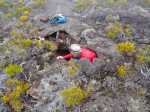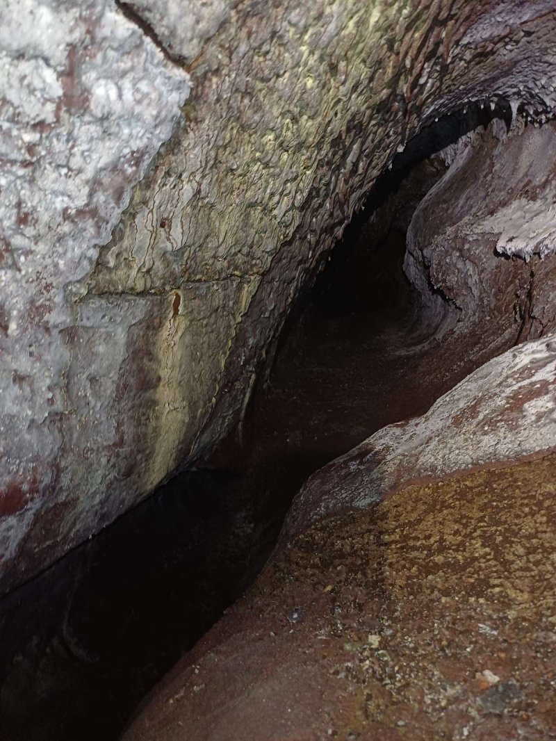 En suivant la trace et en arrivant au bord de la rampe 14, l’entrée du tunnel de lave est assez facile à trouver : on peut y pénétrer sans difficulté et se retrouver rapidement dans un boyau prometteur qui semble se poursuivre. Nous n’insisterons pas sur l’exploration, n’ayant pas le matériel adéquat pour aller plus loin.