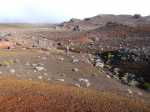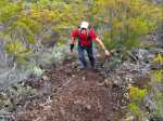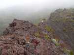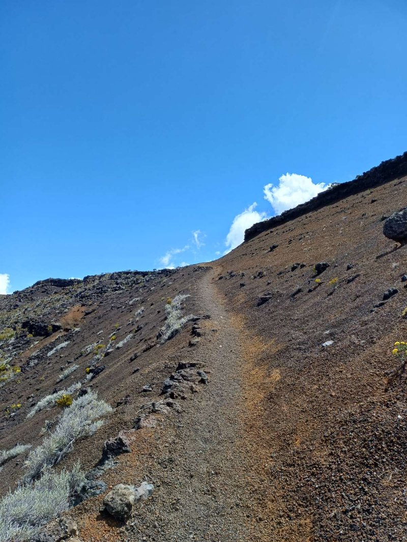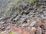 La descente de la rampe 14 doit se négocier avec prudence : la pente est assez forte et les scories glissent sous les pieds. La descente jusqu’à la ravine nous prendra environ 1 h 30.