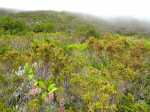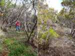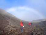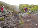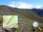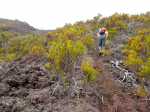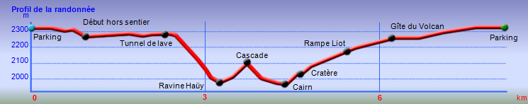 La randonnée débute au parking situé au pied du Piton des Scories, proche d'une belle couche de cendres de Bellecombe. Emprunter le sentier balisé de jaune et rouge jusqu'au Col Lacroix et à la Griffe du Diable qu'on peut apercevoir au pied du Piton Haüy. Le sentier est large, envahi de cailloux. Au croisement, délaisser le sentier de droite menant au gîte et prendre à gauche (Photo 1). Au petit matin, s'il y a de la brume, il est fréquent de rencontrer des arcs blancs au lever du soleil (Photo 2). Au bas de la descente, lorsque le terrain devient plat, obliquer à droite puis entamer le hors sentier sur la Plaine des Sables. Se diriger vers un ancien monticule qui dépasse de la plaine. On peut l'escalader sans difficulté pour profiter du paysage (Photo 3). Poursuivre vers le nord dans de magnifiques paysages en direction du rempart dominant le Fond de la Rivière de l'Est (Photo 4). Afin de marcher le plus à plat possible, obliquer vers l'est et longer ce rempart en profitant de larges panoramas sur la plaine d'élevage. Plus on marche vers l'est et plus le terrain devient accidenté. On trouve toujours des endroits sans végétation pour parcourir cette partie de la Plaine des Sables peu visitée (Photo 5). On trouve pourtant régulièrement des traces de pas, signe que des randonneurs aiment la solitude et viennent profiter du calme des lieux. On s'approche lentement de la Rampe Quatorze, bien moins pentue que le rempart que l'on vient de longer. La végétation est de plus en plus touffue mais on parvient toujours à marcher sans jamais piétiner des plantes (Photo 6). A l'approche de la rampe, on peut passer tout près de la bouche brisée d'un tunnel de lave. Avec un casque et de la lumière, il est possible d'en visiter une partie. Certains boyaux sont étroits et on y rencontre des chambres (Photo 7). La randonnée étant courte mais difficile, il est sans doute préférable de garder cette visite pour un autre jour. Ne jamais pratiquer ces explorations seul et garder toujours un ami à l'extérieur. Se rapprocher du bord et, avant de se lancer, repérer les meilleurs possibilités de marche sans végétation (Photo 8). On aperçoit parfois des zones dénudées derrière les branles. Il faut alors traverser des parties de quelques mètres plutôt que de descendre tout schuss. Ne pas se focaliser sur la direction mais surtout sur ces recherches de terrain dénudé, quitte à effectuer de courts détours de 7 ou 8 mètres (Photo 9). 95% de la descente s'effectue donc sur ces parties dénudées. Attention : si les plantes ne s'y installent pas, c'est souvent parce que le terrain est sableux, toujours très friable et glissant (Photo 10). Après 30 minutes de descente, on se rapproche d'une ravine sans nom, étroite et parfois profonde. Les traces de sabots de vaches ainsi que de nombreuses bouses indiquent que la zone, même pentue, leur fournit de la nourriture. On rencontre d'anciennes clôtures barbelées tombées au sol qui n'arrêtent plus de bovins depuis longtemps. La végétation change, remplacée par de grands branles verts qui trouvent une bien meilleure terre et dépassent les 4 m (Photo 11). Puis la pente s'assagit. Les tamarins encore debout sont de taille fort respectable et servent de parasols aux vaches (Photo 12). Ne pas manquer un bois rouge au double tronc. Hélas, de nombreux autres tamarins ont été couchés au sol par les cyclones. A 2000 m, le sol est le plus fréquemment recouvert d'herbe (Photo 13). On s'approche facilement du lit très rocheux de la Ravine Haüy en empruntant les nombreuses traces créées par le passage du troupeau. Descendre dans le lit de la ravine. Les amateurs de remontées de ravines attaqueront une nouvelle épreuve sportive en escaladant des centaines de blocs de basalte qui en encombrent le fond. On débute par un cassé se contournant aisément (Photo 14). La remontée dure moins de 30 minutes mais demande quelques efforts et un bon sens de l'équilibre (Photo 15). La pente s'accentue à l'approche du cassé avec d'énormes blocs encombrant le passage (Photo 16). On parvient à un haut cassé sans bassin au pied de la cascade à sec (Photo 17). Sur la droite, les strates donnent l'impression qu'on peut remonter mais le sol est beaucoup trop friable. Reprendre le lit en sens inverse jusqu'au point d'entrée. Le dépasser et parvenir aux troncs en travers (Photo 18). 30 m plus loin, repérer un cairn au milieu du lit. Partir en rive droite en face du cairn et traverser une clairière rocheuse. A la fin de la clairière, on retrouve de magnifiques traces très faciles à suivre (Photo 19). La pente s'intensifie dans les bois identiques à ceux de la rive gauche. Un peu plus haut, on arrive au pied du Piton 1954  Les traces y sont nombreuses . Le sol, constitué de cendres, lapillis, gratons est très instable (Photo 20). Sans bâton ou branche, on a vite fait de redescendre fréquemment (Photo 21). Se rapprocher du bord de ce cratère issu de la Fournaise actuelle sur les restes des coulées de l'avant-dernière Fournaise. Longer le bord en prenant garde car le rempart de gauche est totalement vertical sur une hauteur importante (Photo 22). Une fois au sommet trouver le sentier qui se poursuit dans une végétation assez dense en direction du Gîte du Volcan qu'on ne peut encore distinguer (Photo 23). Depuis deux heures, on a eu le temps de s'habituer aux sentiers empruntés par les vaches. On ne les quitte pas (Photo 24). Attention : s'ils facilitent la montée, ils partent aussi dans tous les sens. Préférer toujours ceux qui remontent la pente, parfois très fortement (Photo 25). A un moment il faut traverser une ravine. Quelques minutes plus tard, on se retrouve le long d'un haut grillage pour retenir le bétail. Longer la clôture et sortir du côté des barrières installées par l'éleveur. Après plus de deux heures de galère, marcher sur la Rampe Liot est une balade malgré la pente (Photo 26). Ces 150 m de