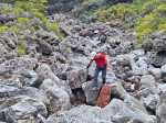 Après une pause casse-croûte bien méritée, nous décidons de varier l’itinéraire de la fiche en remontant par la ravine Saucisson, beaucoup plus ludique. Attention : trois ravines arrivent à la confluence ; prendre celle du milieu et ne pas monter dans celle de gauche, qui reste humide même par temps très sec.