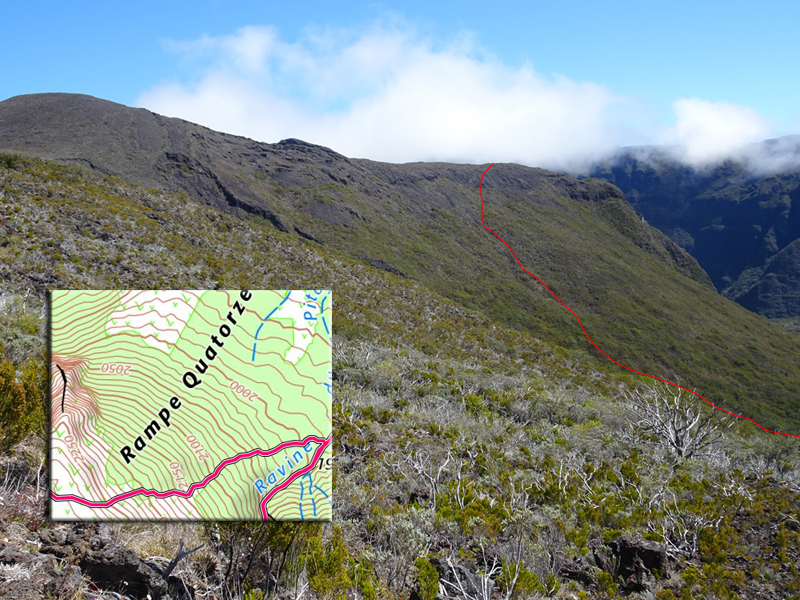 La Pente Quatorze propose une pente raisonnable pour se diriger vers le Fond de la Rivière de l'Est. On y retrouve d'anciennes clôtures en fil de fer barbelé, signe que les bovins ont longuement arpenté ses flancs. La difficulté principale est le sol glissant ou les touffes de végétation. Prendre son temps sur les pierriers, gratons et parties sableuses pour éviter de glisser. Ne jamais tenter de traverser plus de 10 m de végétation car il y a toujours une partie dénudée à quelques pas. Pas d'itinéraire précis pour descendre ce flanc de l'avant dernier Piton de la Fournaise éteint depuis 4700 ans. Conseils aux randonneurs voulant rester très fidèles à la trace : Sur l'écran, la trace fait jusqu'à 3 mm d'épaisseur en fonction du zoom, soit près de 10 m sur le terrain. Si donc cette trace arrive devant un bosquet, ne pas hésiter à le contourner plutôt que de le traverser.