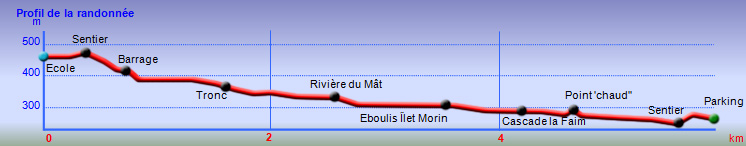 La randonnée débute à Bois de Pomme, ici en face de l'école du village. Si le voyage s'effectue en bus, il faudra marcher depuis Salazie sur moins de 2 km à moins de trouver ces petits bus desservant Bois de Pomme. Rejoindre le sentier de l'Îlet Fleurs Jaunes en empruntant quelques courts tronçons de rues. Le sentier débute à plat avant de plonger au niveau d'un élevage de biquettes. Après les lacets, très difficile de retrouver le sentier qui rejoint le barrage entre les énormes bambous, les bringeliers et longoses. Il faut descendre à l'azimut ou alors oser la petite route se terminant à la rivière (Photo 1). On atteint rapidement le dernier lacet de cette route (Photo 2). Aucune difficulté pour descendre jusqu'à la rivière 10 m plus bas. La descente de rivière peut débuter pour 3 heures. Ne pas chercher à éviter l'eau et effectuer les premières traversées en mouillant les pieds (Photo 3). On parvient en moins de 10 minutes à une petite chute entourée de grosses roches pour les premières acrobaties (Photo 4). Les falaises humides et colorées de l'étroit canyon sont infranchissables en cas de retour forcé (Photo 5). 10 minutes plus tard, nouvel écueil qui oblige de descendre un rocher deux fois plus important que le précédent avant de continuer en passant sous un énorme rocher (Photo 6). Poursuivre dans des paysages de plus en plus beaux de canyons étroits sans forcément avoir besoin de marcher dans l'eau (Photo 7). Après 45 minutes de descente depuis le barrage, le passage le plus sportif des Fleurs Jaunes se présente. Un tronc coincé par les crues peut tenter les plus hardis. Les autres prendront garde à ne pas chuter dans la cascade très glissante mais heureusement très courte (Photo 8). En résumé, les points de passages délicats ne comportent pas de gros dangers tant que le niveau de l'eau est faible (Photo 9). Voilà pourquoi il est impératif de connaître ce niveau avant de se lancer dans l'aventure. Continuer facilement entre les parois en cherchant toujours le meilleur passage sur les galets ou plaques basaltiques (Photo 10). Un passage étroit a permis à l'eau de s'accumuler à la sortie en créant un grand bassin. En rasant la paroi on a toujours pied, mais la chaleur aidant peut encourager à passer plus vite en nageant (Photo 11). Il faut compter une bonne heure de descente pour atteindre le confluent de la Rivière du Mât. Ce coin sauvage et très rocheux a déjà été pratiqué pour une randonnée à la recherche de l'Îlet Micot. On y retrouve la corde qui pend près de son gros rocher en équilibre instable (Photo 12). Un abri sous un de ces rochers permet de se reposer à l'ombre. Il est également possible de remonter un peu la Rivière du Mât avant d'être bloqué par une petite cascade. Après cette halte débute la descente de la Rivière du Mât (Photo 13). La rivière, la plus importante du cirque, a besoin d'un canyon plus large pour couler (Photo 14). Les endroits traversés n'ont rien à envier à ceux de la rivière précédente. On retrouve les falaises infranchissables et les bassins qu'il faut constamment traverser (Photo 15). Un peu plus en aval, elle devient plus tumultueuse et il est préférable de marcher en rive gauche sur les basaltes. On peut rencontrer ainsi une vierge sous une avancée en rive gauche et une belle source surgissant de la falaise en rive droite (Photo 16). Les amateurs apprécieront particulièrement un superbe canyon dans un virage de la rivière (Photo 17). Plus bas, dans un grand coude de la rivière, on frôle l'Îlet Morin qu'on devine sur le plateau en rive droite mais surtout aux falaises laissées à nu par le grand éboulis de septembre 2010 (Photo 18). Les parois sont recouvertes de bambous nains (Pogonatherum paniceum) et de quelques cascades en période de pluie. A partir de cet îlet, le lit s'élargit et la marche s'effectue sur des hectares de galets de toutes tailles (Photo 19). La Ravine la Faim est facile à repérer à la longue cascade terminant sa chute dans la rivière (Photo 20). Ce magnifique endroit donne une nouvelle occasion d'une halte reposante (Photo 21). Plus bas, en se retournant, on peut distinguer la cascade la Faim, laissée aux professionnels (Photo 22). Le courant redevient plus fort en arrivant dans une zone de plus en plus étroite et chaotique (Photo 23). Les plus intrépides tenteront une descente de la rivière mais l'endroit s'avère dangereux en raison du courant. Il est préférable d'escalader les roches en rive droite et d'emprunter les voies les plus instinctives pour revenir dans l'eau en prenant garde aux glissades (Photo 24). Le fougueux torrent se calme immédiatement après le goulet et l'eau peu profonde ne gêne pas la marche (Photo 25). La suite est une formalité entre des rives qui s'espacent à nouveau, recouvertes de forêts à la hauteur de l'îlet de l'Escalier (Photo 26). La rivière peu profonde et les berges lisses permettent de trouver son itinéraire selon ses goûts (Photo 27). La remontée au parking étant impossible ou très difficile au niveau du pont, ne pas manquer le sentier débutant après une grande case sur la droite dotée d'un petit kiosque sur la rive. Au moment où il est possible d'apercevoir le pont (Photo 28), trouver le petit cairn qui marque le début de la montée en rive droite. Ce sentier de pêcheur, étroit et glissant, se termine à la route de Salazie après quelques très hautes marches en béton. A moins de poursuivre vers le village de la Rivière du Mât, partir à gauche sur la route pour terminer à la petite chapelle de l'Escalier.