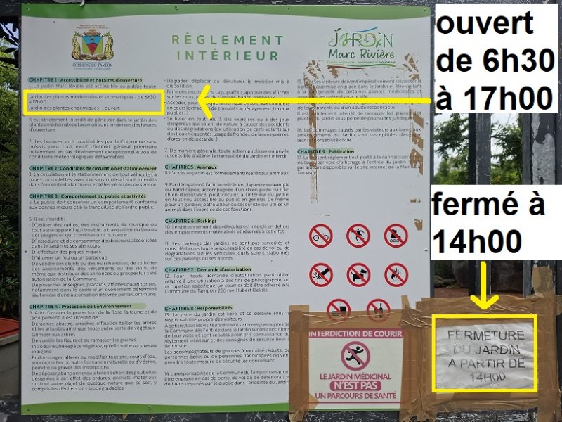 La randonnée débute au parking situé juste entre les deux parcs. Traverser la route et entamer le premier tour en passant devant le panneau d'accueil qui précise que les animaux sont interdits (Photo 1). Bien d'autres panneaux sont installés à l'entrée dont un qui recense quelques variétés d'arbres plantés autour des allées (Photo 2). Débuter par l'allée la plus proche de la Rivière d'Abord. On y rencontre déjà de nombreuses essences de bonne taille (Photo 3). En ouvrant l'œil, on en croisera d'autres qui étaient plantées bien avant l'installation du parcours de santé (Photo 4). On devine souvent la petite vallée de la Rivière d'Abord sur la droite. Parfois on a même des vues sur les bassins envahis de végétation, sans apercevoir un seul mètre du vieux sentier (Photo 5). La piste est toujours aussi agréable à l'ombre des palmiers (Photo 6). Tous les 100 m, un panneau donne la distance parcourue depuis l'entrée (Photo 7). Régulièrement, on se retrouve près d'obstacles du parcours mais rares sont les sportifs qui s'y éreintent (Photo 9 et 10). Après quelques lacets, le chemin traverse la petite ravine, affluent de la Rivière d'Abord (Photo 11). Le circuit repart naturellement vers la droite en longeant le talweg également envahi de hautes plantes (Photo 12). La piste monte un peu et frôle plus loin les 3 stades de la Pointe. Depuis les clôtures, on domine le parc boisé dans son ensemble (Photo 13). Il est possible de raccourcir le trajet en empruntant un des escaliers descendant vers la ravine (Photo 14). Un dernier virage emprunte une deuxième passerelle (Photo 15). Les pistes sont tellement rapprochées qu'on repasse à quelques mètres de celles empruntées à l'aller. Le circuit se termine par une pente bétonnée menant vers l'entrée du parc (Photo 16). C'est la seule difficulté de la boucle qui oblige à se pencher un peu vers l'avant. A la saison, les arbres à orchidées fleuris font oublier l'effort (Photo 17). On arrive sous de grands arbres proches d'une pelouse abritant de nombreux appareils de musculation (Photo 18). Plus loin, on s'approche de la route. Emprunter un petit sentier qui permet de rejoindre le Chemin de l’Établissement et le rond-point. Le Parc Marc Rivière débute aussitôt franchi le rond-point. Passer la chicane empêchant le passage des engins et entamer cette deuxième visite de jardin naturel. Une première courte boucle sur caillebotis commence immédiatement sur la droite pour traverser le Jardin des Sens, mais ramène très vite à la piste principale (Photo 19). Comme plus bas, le chemin de terre battue en pente faible longe de belles plantations qui mériteraient un panneau comportant leur nom (Photo 20). Elles existaient il y a quelques années mais ont certainement été vandalisées. On passe près de grosses touffes de bambous plantées bien avant la création du petit parc (Photo 21). On arrive bientôt à un portail fermé le week-end. On peut poursuivre dans le parc sur les pistes toujours aussi sinueuses (Photo 22). Pour éviter de passer deux fois au même endroit, il est possible, au portail, d'emprunter le sentier qui remonte vers le parking. On se retrouve ainsi devant la porte principale comportant un plan des lieux (Photo 24). Partir sur la droite pour passer devant les plantations d'endémiques puis les aromatiques (Photo 25). Plus loin, un alambic et quelques pieds de géranium symbolisent la culture de cette plante odorante. Revenir vers l'entrée et poursuivre sur la piste en traversant les plantes médicinales et quelques autres plantations (Photo 26). Une fois la première grille franchie, afin d'éviter de repasser au même endroit, remonter l'escalier sur la droite et longer la limite du parc. On retrouve des bambous et un sentier qui passe sur des enrochements (Photo 27). On traverse de nouvelles plantations d'endémiques puis le chemin redescend vers l'entrée Sud par un dernier virage (Photo 28). Le parking est à quelques mètres.