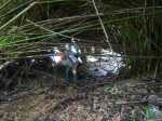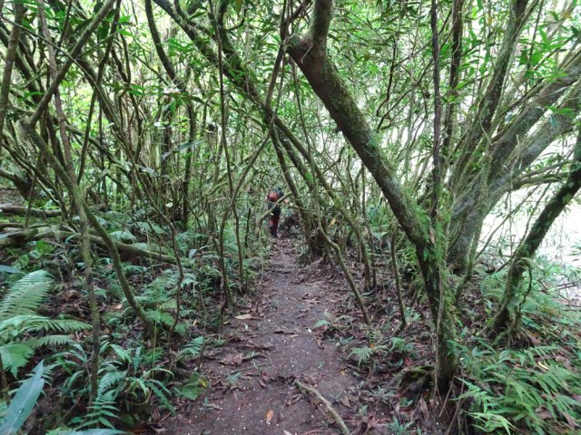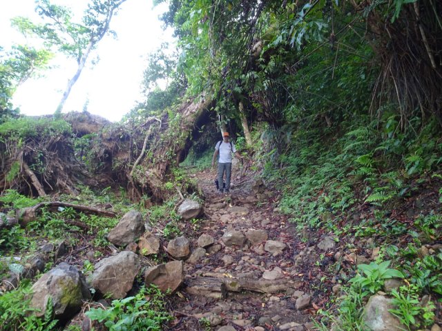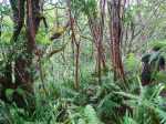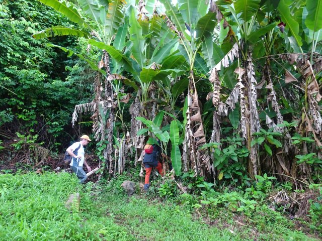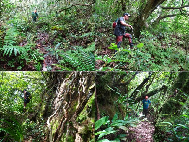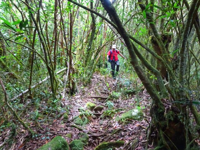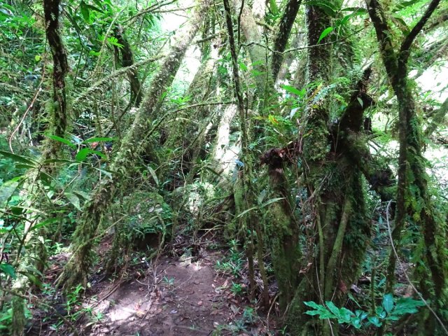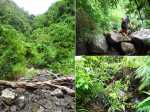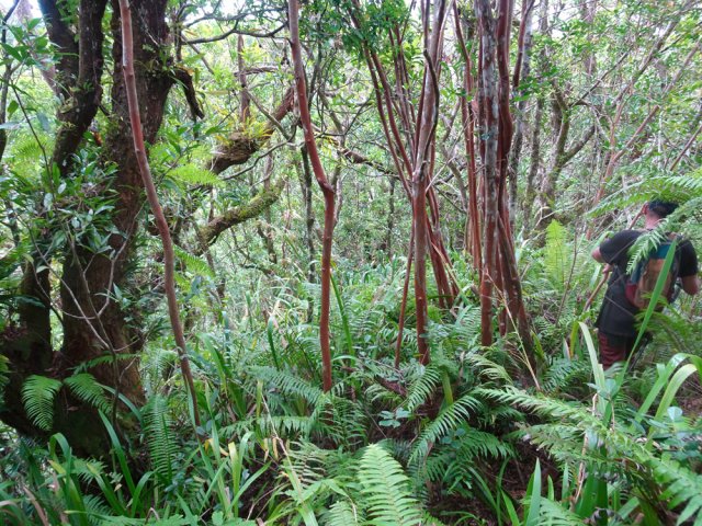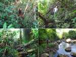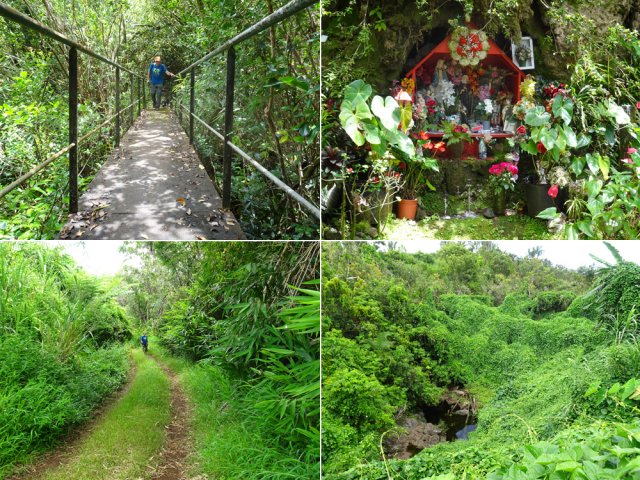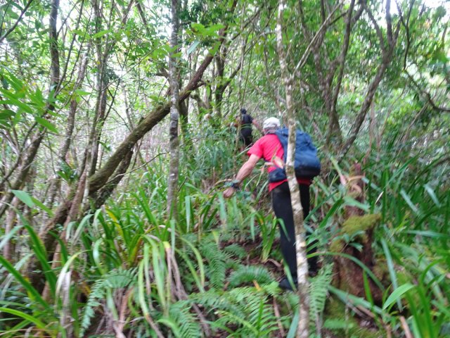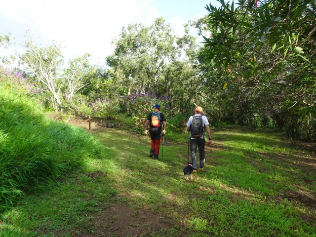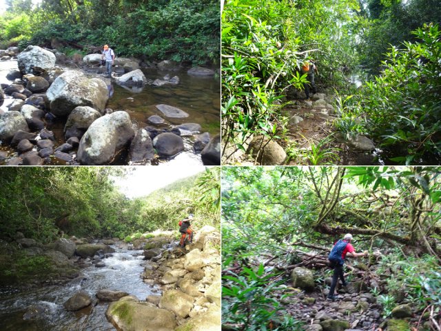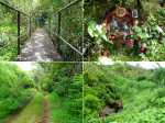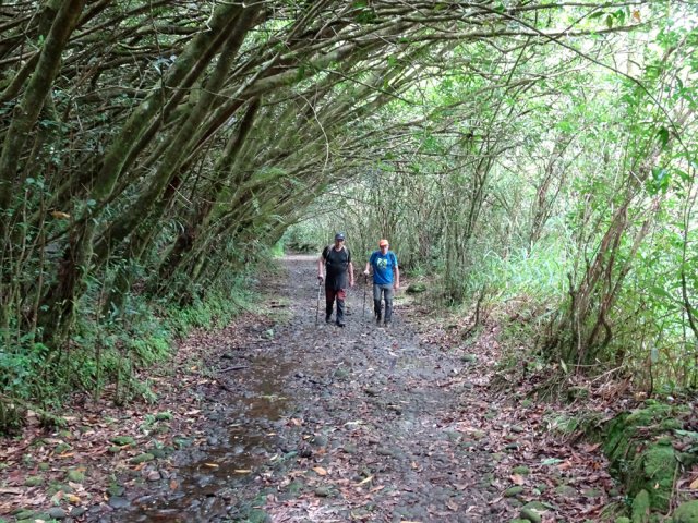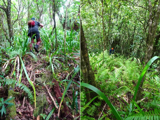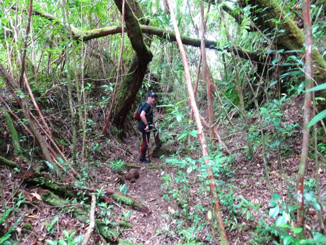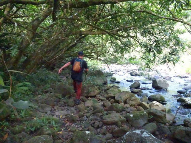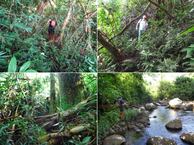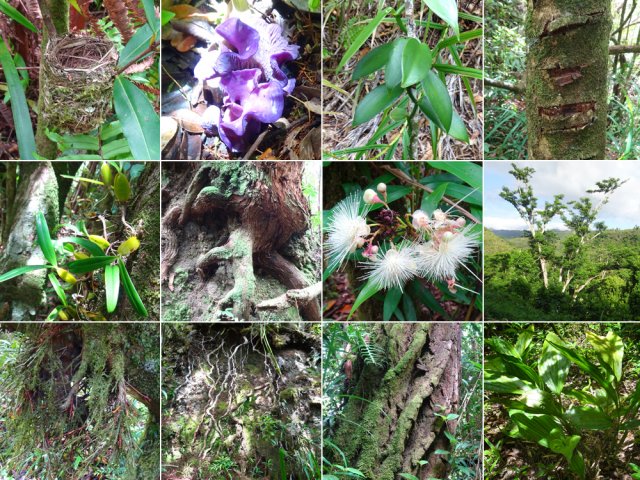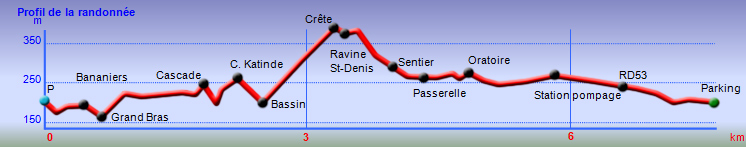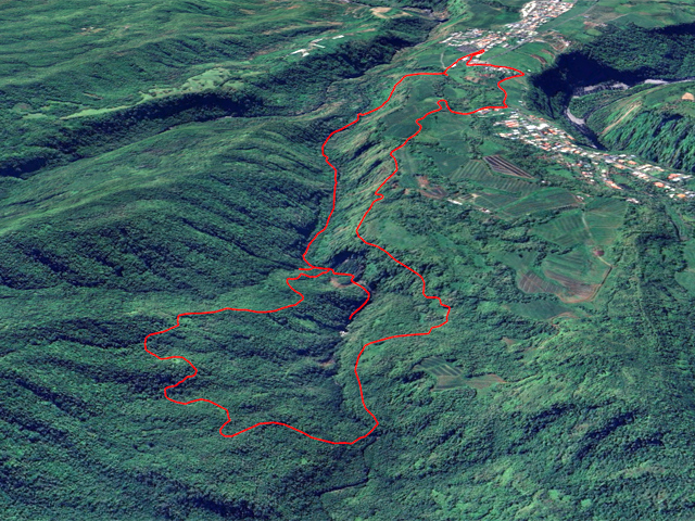 Randonnée pour aventuriers aguerris. Revenir au bassin et son barrage de bois enchevêtrés qui est le point de départ de la montée vers la crête dominant la Ravine St-Denis. Trouver en rive gauche les traces anciennes de passage, souvent effacées par la végétation. Il faut monter immédiatement après la rive. La trace est, soit visible, soit instinctive entre les arbres ou goyaviers (Photo 18). On peut apercevoir dans les futaies la haute cascade dont a rejoint le bassin au cours de la montée. Les repères sont très rares ou inexistants. Ce sont surtout des branches cassées ou coupées, parfois un coup de sabre sur une écorce, des traces au sol ou les inévitables bouteilles qui permettent d'imaginer être sur la bonne voie. Ne jamais quitter le GPS qu'on consulte toutes les 5 minutes. La pente s'accentue dans les sabres et fougères, heureusement les goyaviers aident à ne pas glisser (Photo 19). Quand on parvient sur la crête, il est plus difficile de s'égarer puisqu'il faudrait descendre à gauche ou à droite pour se perdre (Photo 20). Plus haut, on se retrouve sur un plateau et la trace épouse presque la courbe de niveau pour une marche à plat entre les goyaviers (Photo 21). L'effort a été intense jusqu'à maintenant mais il y a toujours quelque chose à découvrir en pleine nature (Photo 22). Outre les orchidées, belles racines ou champignons colorés, on découvre régulièrement de longues lianes de vanille, certainement cultivée au siècle dernier. Après une heure de marche souvent difficile, on parvient à l'ancien sentier venant du captage des Congres et menant à Camp Michel (Photo 23). Le sentier n'est plus employé mais il est beaucoup plus facile à suivre car on retrouve les fossés délimitant à l'époque ce qui était une piste (Photo 24). Ce large chemin reliant les cultures passait sur des ouvrages d'importance pour faire passer l'eau des ravines (Photo 25). Après de rares hésitations dues à l'invasion des ronces et goyaviers, on termine le sentier par quelques descentes en direction de la Ravine des Congres (Photo 26). Le sentier se termine à un gros arbre puis au sentier du captage. Franchir la passerelle qui domine le Grand Bras puis entamer le retour très facile par le Chemin de l'Harmonie (Photo 27). Certaines portions du chemin sont très boueuses. Le parcours est plat ; il coupe des ravines sur de nouveaux ouvrages , frôle un grand oratoire et se termine à une station de pompage (Photo 28). On se retrouve plus loin sur des tronçons de chemins empruntés par les agriculteurs avant de rejoindre la RD53. La fin de cette boucle emprunte une petite rue descendant vers le poste électrique.