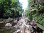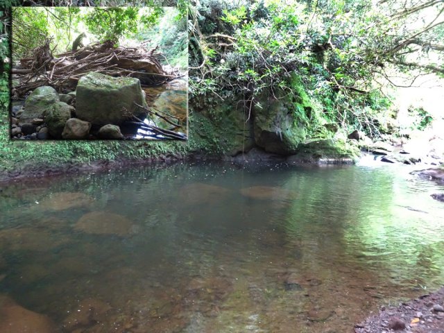 Randonnée pour aventuriers débutants. Elle débute au plus près du poste électrique de l'Abondance où quelques emplacements se trouvent près de la cascade proche du gué. Franchir la ravine et entamer la descente en suivant les panneaux indiquant le Bassin la Mer. Le large sentier file en direction du bassin qui peut se rejoindre rapidement. Il effectue un angle droit vers la gauche (Photo 1). Il descend ensuite sur un sol terreux, un peu caillouteux au milieu des troncs couchés par le cyclone Garance de 2025 (Photo 2). Il effectue plus bas un lacet repartant en direction du bassin. Trouver, juste dans l'épingle du chemin, une grosse touffe de bananiers. Impossible à deviner en passant mais un ancien sentier débutait là pour rejoindre la ravine. Traverser la touffe (Photo 3) et suivre à l'instinct cette trace qui a énormément souffert des éléments déchaînés de Garance (Photo 4). Il faut près de 10 minutes pour effectuer cette traversée en évitant ou enjambant les branches, mais on parvient enfin au Grand Bras. Il est certainement envisageable de remonter le Grand Bras depuis l'aval, au gué du sentier menant à Camp Michel, mais ces 350 m de ravine n'ont pas été reconnus. C'est parti pour 90 minutes de remontée de ravine avec toutes les étapes habituelles. On marche parfois dans l'eau mais les berges sont assez faciles à suivre pour éviter l'eau. On se s'éloigne jamais de plus de 10 m du ruisseau (Photo 5). Cette ravine pérenne est un torrent ordinaire comportant du courant et de rares parties planes (Photo 6). Aucun rapide ni petite chute ne vient troubler la remontée. La forêt alentour est très touffue. Elle est surtout constituée de jamrosats qui sont, comme toujours, penchés au-dessus du cours d'eau (Photo 7). Quand on n'est pas dans l'eau ou sur les berges au plus près, on traverse ces jamrosats qui sont le plus souvent très moussus (Photo 8). A près d'une heure de marche, une grosse touffe de bambous crée un tunnel sombre en rive droite (Photo 9). Poursuivre, le plus souvent en rive droite dans des couloirs créés par le passage des eaux où la marche est plus rapide qu'ailleurs (Photo 10). Quelques minutes plus tard, on tombe nez à nez avec de gros amoncèlements de racines et d'arbres charriés par les crues. On entend couler de l'eau en rive gauche. Marcher vers cette vallée étroite et qui semble inextricable. Longer le lit de la petite ravine sans trop de difficultés sur une vingtaine de mètres (Photo 11). On parvient ainsi en quelques minutes à un bassin alimenté par la dernière chute d'une haute cascade que l'on aperçoit à travers les branches (Photo 12). Revenir à la rivière puis remonter jusqu'à un bassin une cinquantaine de mètres en amont. Il est lui-même entouré de ces amas de racines (Photo 13). C'est là que débute la trace empruntée pour la fin de la boucle. Mémoriser ce lieu et poursuivre vers la cascade Katindé sur un terrain de plus en plus recouvert de roches plus grosses (Photo 14). Une ravine en rive droite se termine en petite cascade (Photo 15). La fin de la montée s'effectue principalement dans le lit du Grand Bras avec la cascade en point de mire (Photo 16). C'est près de 2 heures après avoir quitté le parking qu'on peut envisager la baignade dans le grand bassin tout en admirant la cascade Katindé (Photo 17). Difficile de poursuivre quand on évalue les falaises alentour ou la hauteur de la chute. Faire demi-tour et revenir au parking en estimant le même temps de marche qu'à l'aller (§ ci-dessous).