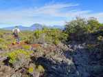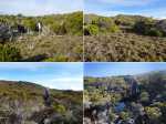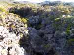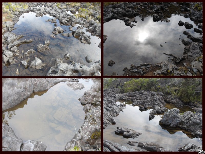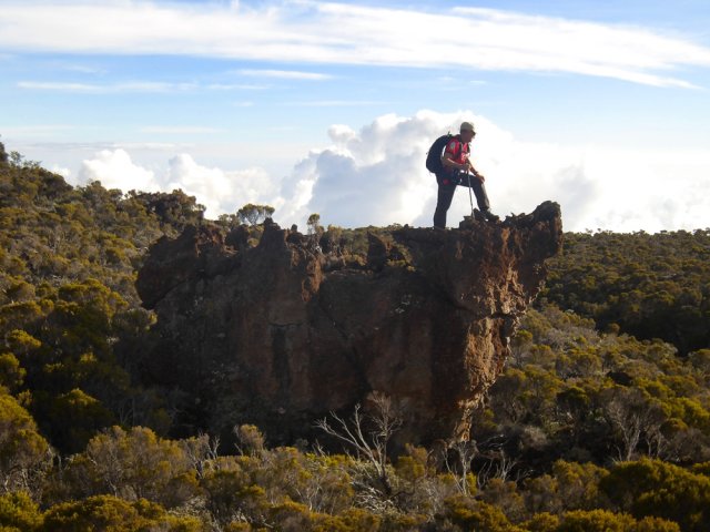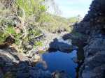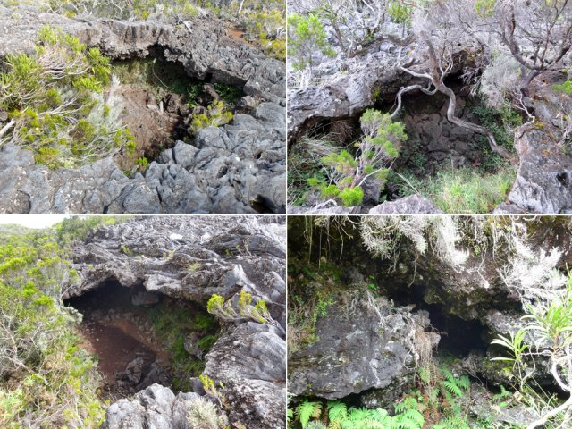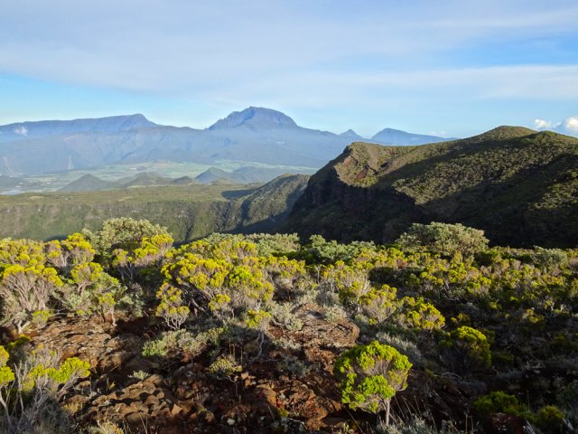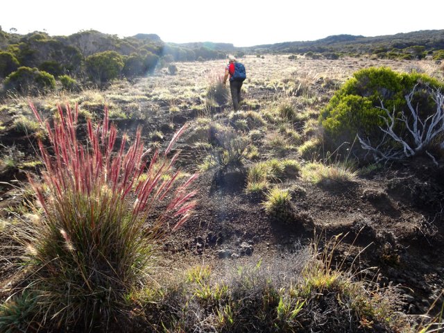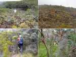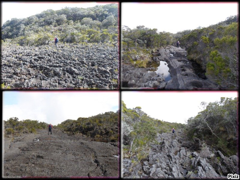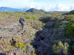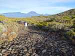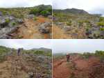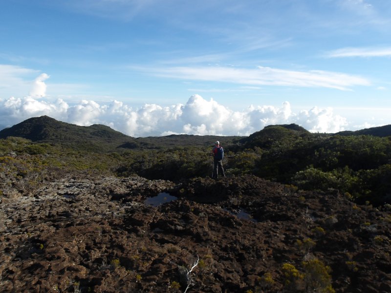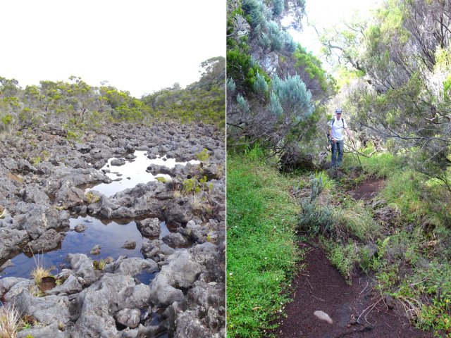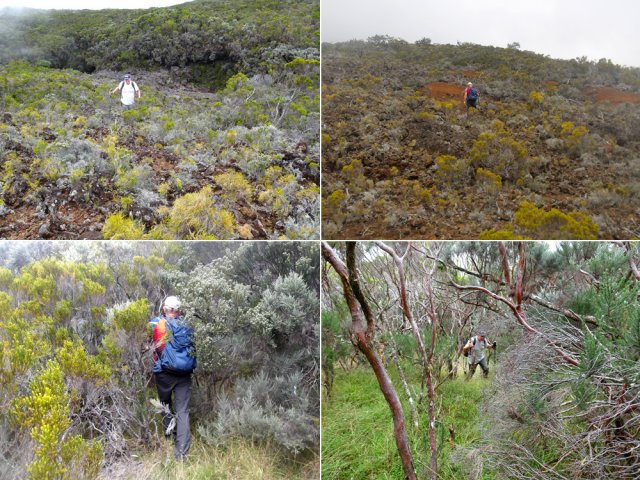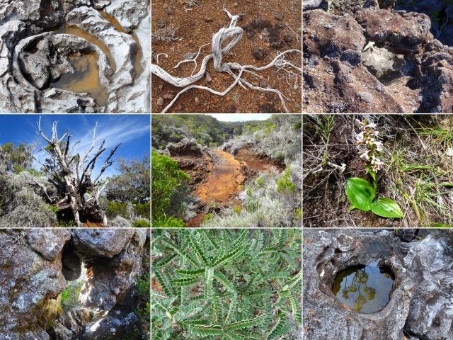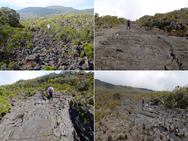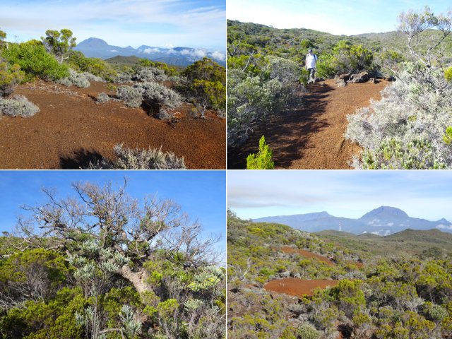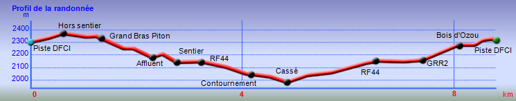 La randonnée débute entre Bois Ozoux et le cratère Commerson, au commencement de la piste DFCI de l'oratoire Ste-Thérèse. Avant de débuter la boucle, se régaler du spectacle sur la Plaine des Cafres, la vallée de la Rivière des Remparts ou le Piton des Neiges (Photo 1). Franchir la barrière et remonter la piste qui a subi des travaux la rendant très carrossable aux camions de pompiers. Le sol est souvent pavé de pierres de lave pour une marche assez agréable (Photo 2). Plus loin, on rencontre le sentier venant du Textor en direction du Piton de la Fournaise. Le suivre quelques mètres avant de se lancer pour près de 4 heures dans un agréable hors sentier. On peut filer directement vers la source officielle présentée sur la carte IGN mais les branles y poussent dru. Effectuer un court détour par de larges clairières couvertes d'herbe et de faux thym (Photo 3). Marcher ainsi et obliquer régulièrement vers le nord pour se rapprocher au plus vite du Grand Bras Piton (Photo 4). Il faut pour cela traverser quelques bosquets de branles verts ou d'ambavilles jusqu'à rencontrer les premières flaques indiquant que l'on est sur le bras (Photo 5). Un rocher solitaire au milieu de la verdure confirme qu'il s'agit bien de la bonne ravine (Photo 6). Très vite, la ravine qu'on avait encore du mal à identifier se creuse et présente même de petits canyons faciles à suivre (Photo 7). Après une vingtaine de minutes, un premier petit cassé impose de le contourner en rive gauche (Photo 8). Le passage est très facile sur les rives basaltiques avec le Piton des Treize Cantons à l'horizon (Photo 9). A partir de là, les contournements ne poseront pas de difficultés car il y a toujours des zones dégagées et sableuses pour ne pas gêner les plantes endémiques (Photo 10). Des écarts sont même possibles pour s'éloigner de la berge et se rapprocher par exemple d'un arbre caractéristique (vignette 3). La pente s'accentue et par là même les nouvelles cassures. Dans la descente, on voit très bien la rive droite très boisée et la gauche plus facile d'accès (Photo 11). Lorsque le sol basaltique est trop découpé, il peut ralentir la marche. Préférer alors les berges sableuses (Photo 12). On peut être tenté de rester sur le sable quand le fond est envahi de tamarins tortueux. Pourtant ces passages plus sportifs mais ludiques permettent de côtoyer des arbres qui ont souffert à tenter de survivre sur ce sol inculte (Photo 13). Tout aussi agréables sont les mini canyons ou les petits cassés bordés d'arbres ou de vieux branles (Photo 14). Les pluies laissent quelques petits bassins d'eau froide très aisés à longer en choisissant la bonne rive (Photo 15). D'autres portions plus chaotiques ralentissent mais se descendent en prenant garde aux roches instables (Photo 16). Mais ces zones sont assez rares. La plupart du trajet emprunte de belles parties de la ravine (Photo 17). Les amateurs de nature sauvage, où le minéral empêche le végétal de s'installer, apprécieront de nombreux points charmants (Photo 18). Pourtant, les deux coexistent pour le plus grand plaisir des yeux (Photo 19). Attention cependant à l'approche des profondes cassures de la croûte qui ont créé cavités et grottes (Photo 20). Il est possible à mi-parcours, de remonter le lit d'un affluent en rive droite, tout aussi rocheux et découpé que le bras. Après 90 minutes à flâner où à chercher le meilleur passage depuis la source, on franchit le sentier du Piton de l'Eau puis la RF44 allant dans la même direction. Après le large radier de la RF, le lit du Grand Bras Piton se diversifie. Il passe de très larges zones plates et empierrées à d'autres plus étroites envahies de végétation (Photo 21). On rencontre même de très larges coulées de lave très anciennes, extrêmement dures, que les crues n'ont même pas entamées (Photo 22). Les bassins sont toujours aussi rares et ne donnent aucune envie de se baigner (Photo 23). Le lit forme plus loin un Y. Prendre vers la gauche à partir d'un petit gouffre bordé de grosses flaques (Photo 24). Le premier cassé d'importance se présente plus bas. Descendre devient trop dangereux (Photo 25). Il vaut mieux contourner l'obstacle par un long détour empruntant tout d'abord le fond d'un affluent puis en cherchant le meilleur passage sur les parties rocheuses ou sableuses de la rive. On se rend compte plus loin qu'il en sera de même jusqu'au grand cassé. Faire demi-tour et entamer le chemin du retour qui pourra se faire en coupant difficilement les étendues touffues de branles en direction du sentier du Piton Textor. Nous avons choisi de filer plein sud en contournant le Piton de Caille par l'est. En prenant son temps et avec le souci de ne pas abîmer les plantes on effectue une trace sinueuse entre les touffes, sur les parties sableuses et en traversant parfois quelques mètres de végétation plus touffue (Photo 26). Compter une bonne heure de remontée jamais abrupte, parfois glissante et toujours aléatoire, à ne jamais pratiquer par temps de brouillard sans GPS au risque important d'égarements. A partir des flancs du Piton de Caille, il est facile de suivre des pseudos ravines ou trouver des sentiers créés par les bovins à l'époque où ils étaient nombreux à parcourir ces vastes zones (Photo 27). Terminer par un court tronçon de ravine menant à la RF 44. Prendre la piste vers la droite et marcher jusqu'à la route du volcan. Bifurquer à gauche sur le GRR2 et entamer la dernière montée vers l'Oratoire Ste Thérèse. La pente est plus forte que la remontée en hors sentier mais on a l'assurance de ne plus avoir à contourner les plantes afin de ne pas les piétiner (Photo 28). Après avoir coupé par 4 fois la route du Volcan, la rejoindre par un petit sentier de moins de 50 m et marcher vers le véhicule stationné au début de la piste DFCI.