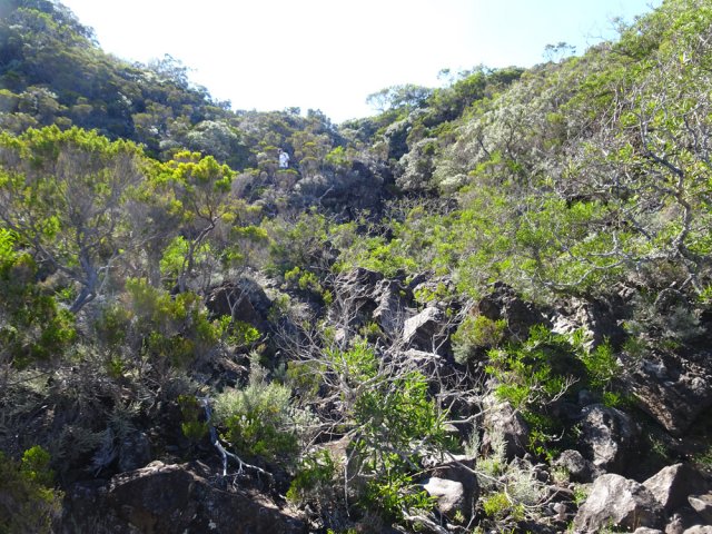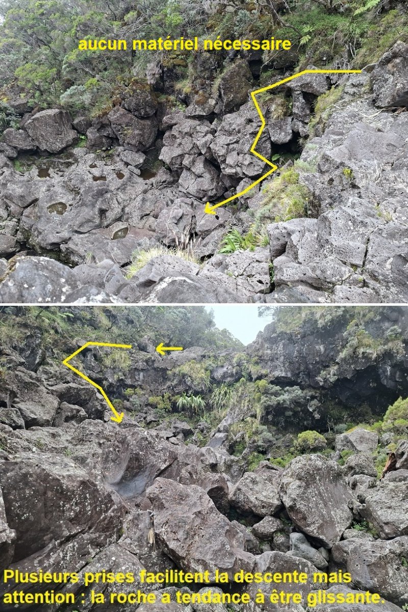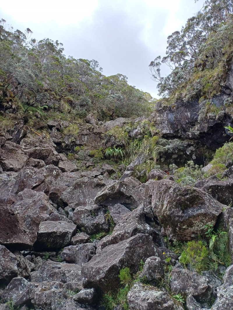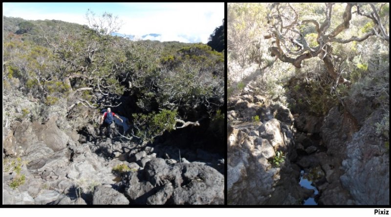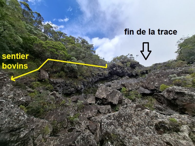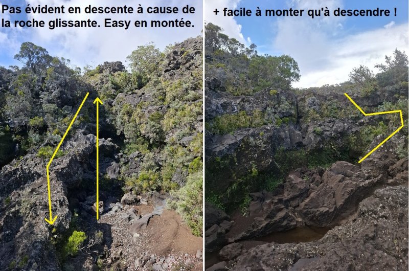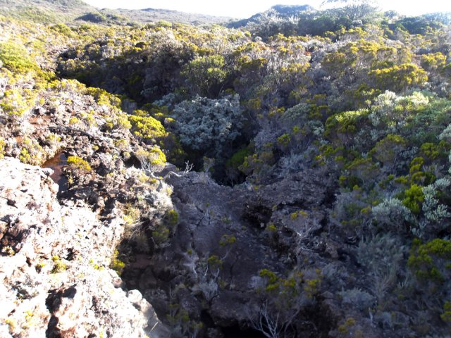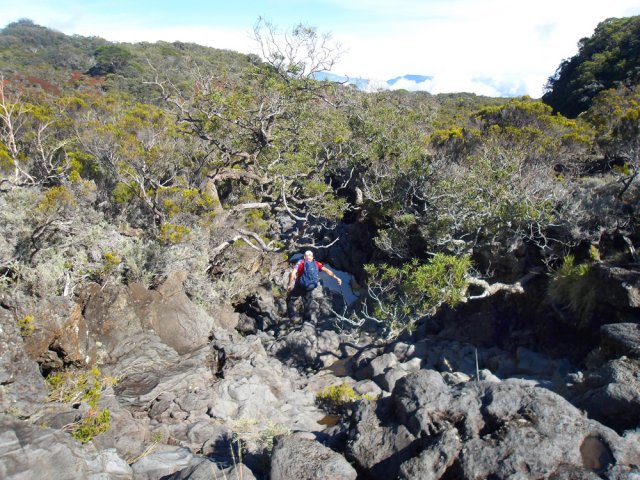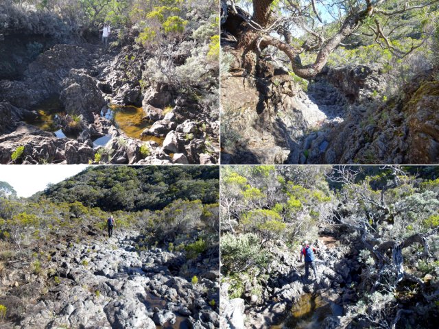 Ce n'est pas parce que l'on peut effectuer des dizaines de hors sentiers dans la région du volcan qu'on ne peut pas proposer une balade entre les branles verts pour suivre une ravine. Cette sortie s'adresse donc aux marcheurs habitués à sillonner des terrains inconnus où aucune balise ne vient rassurer sur la bonne direction. Plus on descend et plus la Grand Bras Piton se découpe dans les basaltes, mais le suivre depuis sa source est plus difficile car il est très peu marqué. Sur le terrain, souvent très plat, seuls quelques creux permettent d'imaginer le début d'une ravine. Il n'y a pas de véritable source. Ce sont les eaux d'écoulement qui se rassemblent et forment cette belle petite ravine. Le trait bleu de la carte permet de savoir que l'on est au bon endroit. Plus bas, la carte devient inutile puisque le lit s'est creusé. Il suffit de le suivre en empruntant, soit le fond, soit les rives lorsque le sol est encombré ou trop tourmenté. On rencontre plusieurs cassés se franchissant facilement. A partir de 2000 m, l'exercice est possible, mais les cassés sont infranchissables sans matériel. Le contournement passe dans des sous-bois serrés où il est désagréable de se faire griffer. Voilà pourquoi la trace ci-dessous s'arrête une centaine de mètres avant le grand cassé. De ce cassé jusqu'au confluent avec la Ravine Sèche, seuls les canyonistes peuvent s'y promener. Mais comme la ravine est rarement en eau, elle ne fait pas partie de leurs favoris.