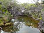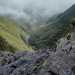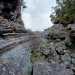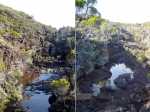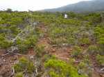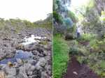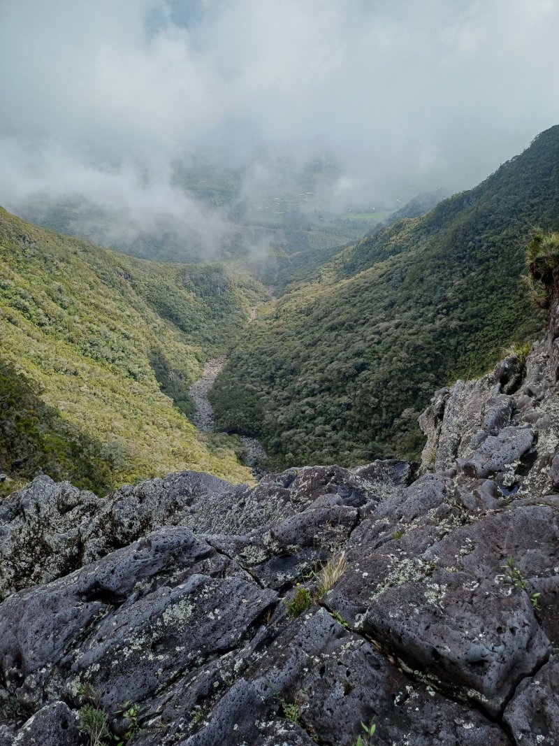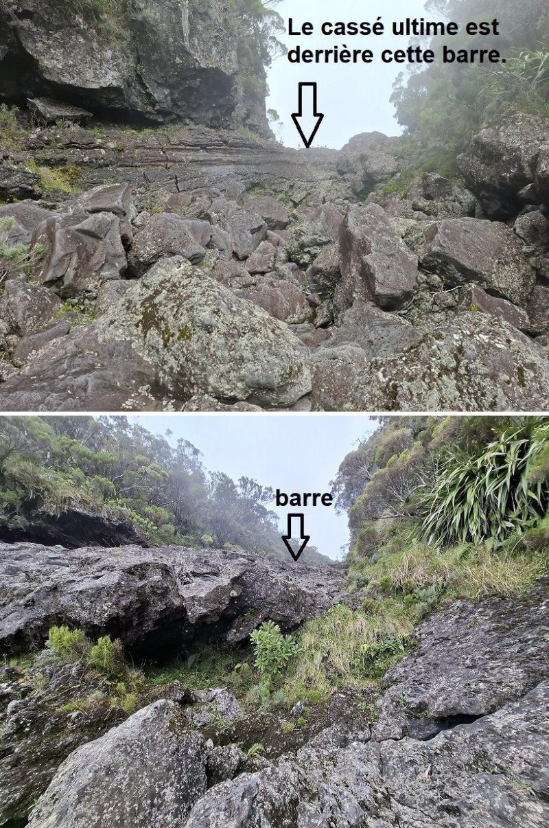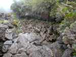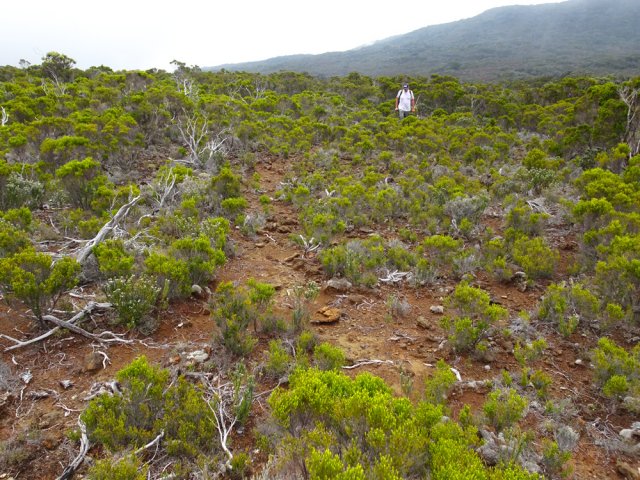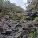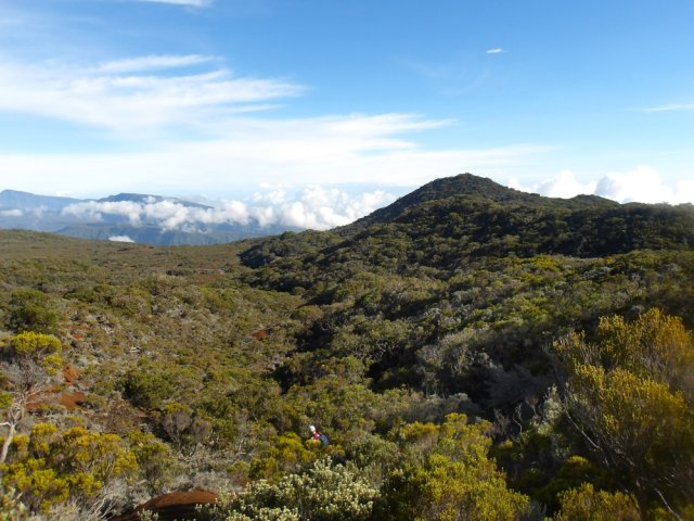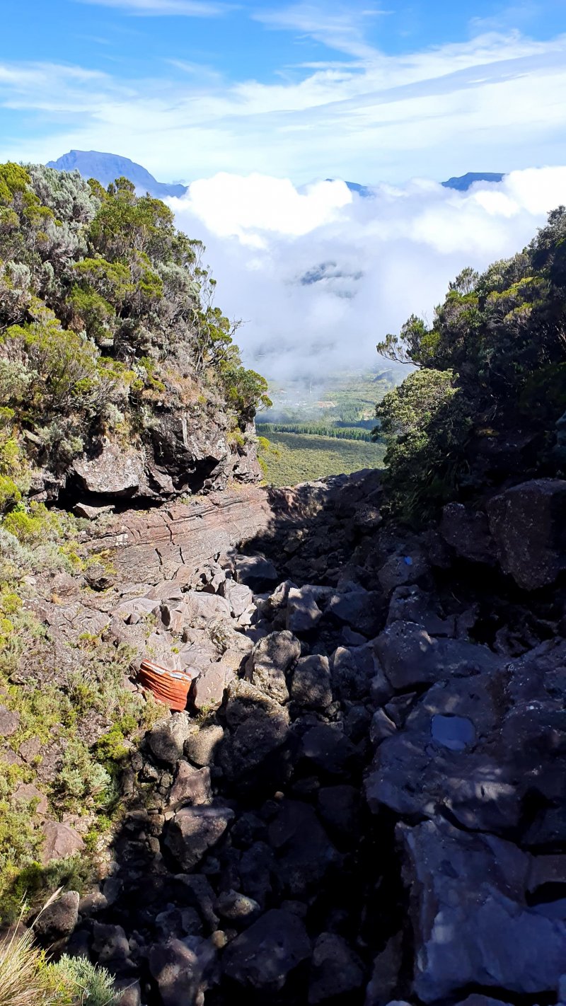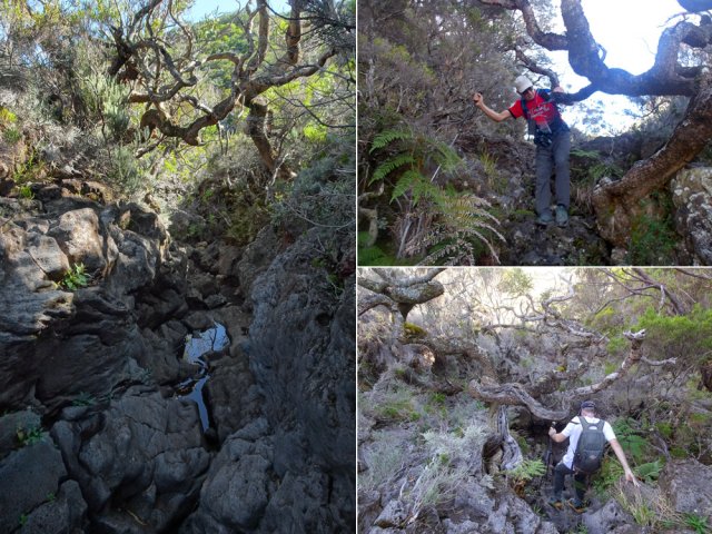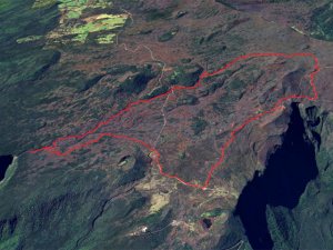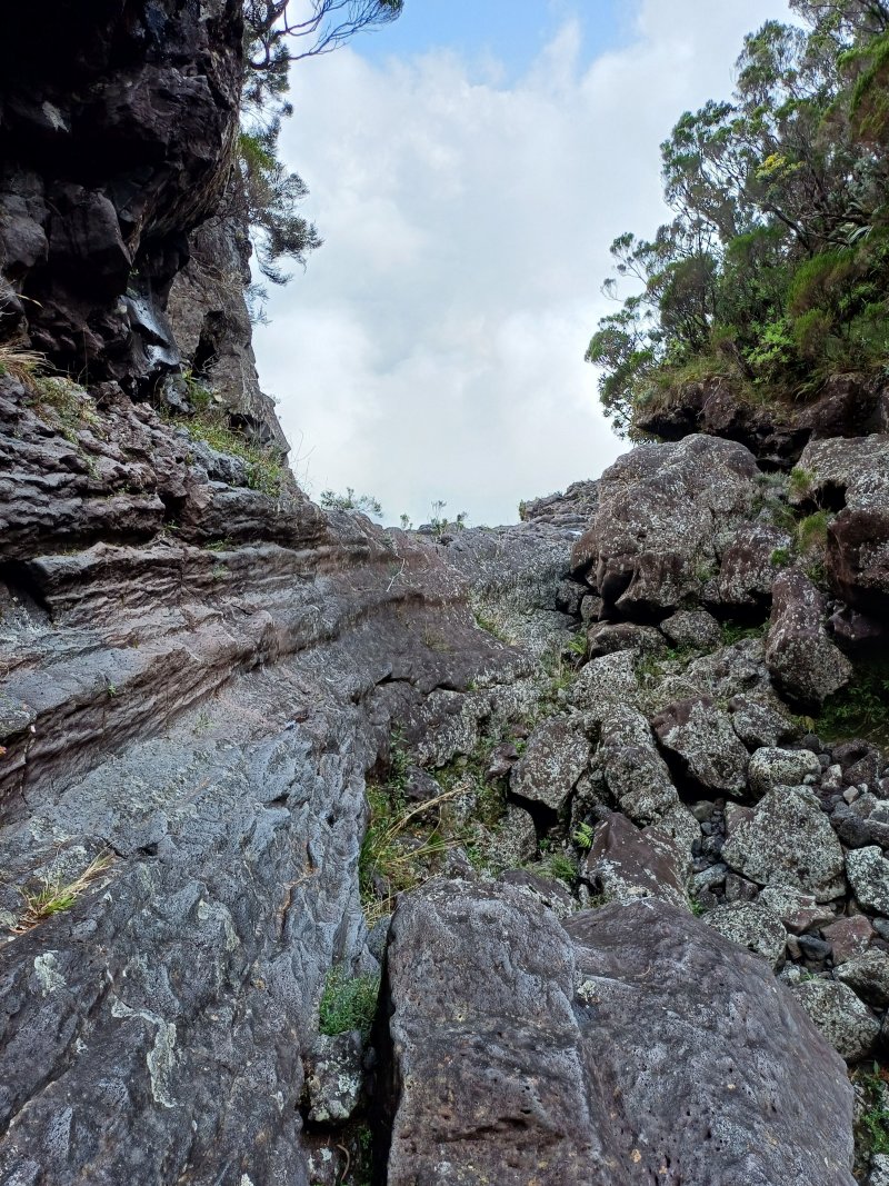 Ce n'est pas parce que l'on peut effectuer des dizaines de hors sentiers dans la région du volcan qu'on ne peut pas proposer une balade entre les branles verts pour suivre une ravine. Cette sortie s'adresse donc aux marcheurs habitués à sillonner des terrains inconnus où aucune balise ne vient rassurer sur la bonne direction. Plus on descend et plus la Grand Bras Piton se découpe dans les basaltes, mais le suivre depuis sa source est plus difficile car il est très peu marqué. Sur le terrain, souvent très plat, seuls quelques creux permettent d'imaginer le début d'une ravine. Il n'y a pas de véritable source. Ce sont les eaux d'écoulement qui se rassemblent et forment cette belle petite ravine. Le trait bleu de la carte permet de savoir que l'on est au bon endroit. Plus bas, la carte devient inutile puisque le lit s'est creusé. Il suffit de le suivre en empruntant, soit le fond, soit les rives lorsque le sol est encombré ou trop tourmenté. On rencontre plusieurs cassés se franchissant facilement. A partir de 2000 m, l'exercice est possible, mais les cassés sont infranchissables sans matériel. Le contournement passe dans des sous-bois serrés où il est désagréable de se faire griffer. Voilà pourquoi la trace ci-dessous s'arrête une centaine de mètres avant le grand cassé. De ce cassé jusqu'au confluent avec la Ravine Sèche, seuls les canyonistes peuvent s'y promener. Mais comme la ravine est rarement en eau, elle ne fait pas partie de leurs favoris.