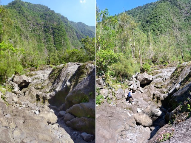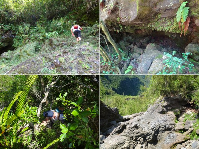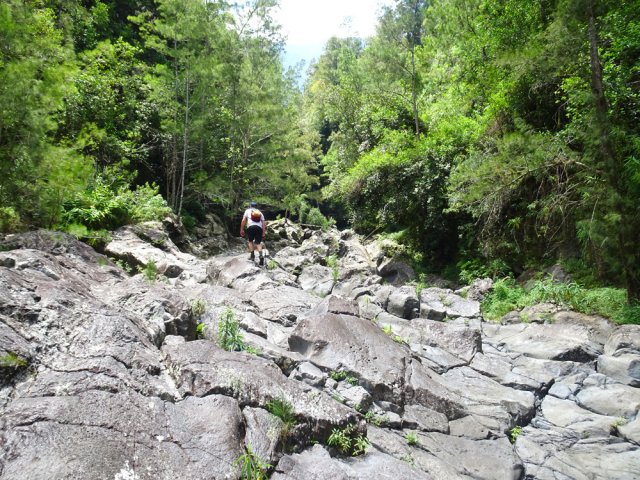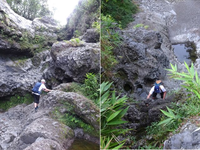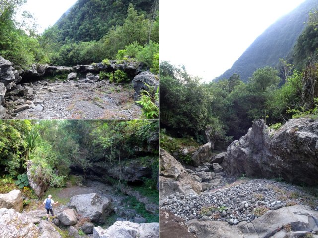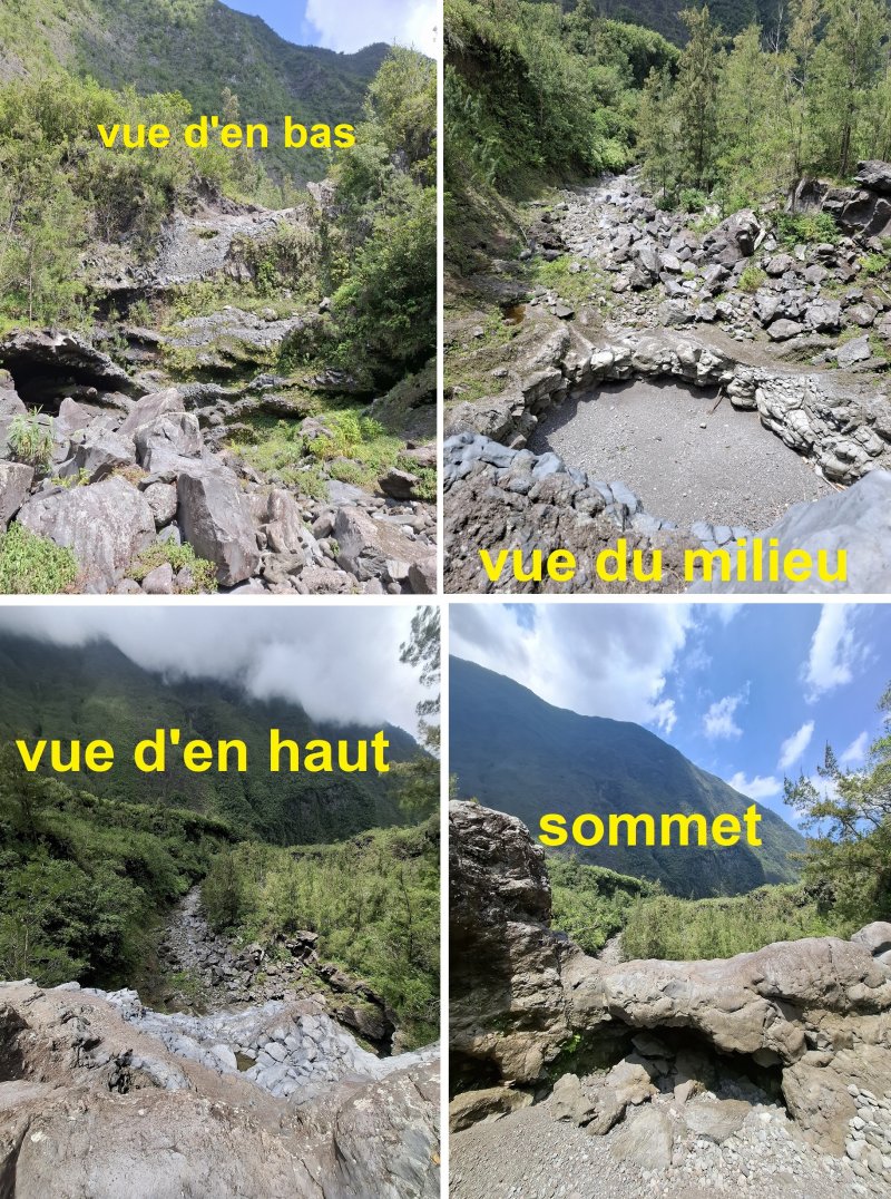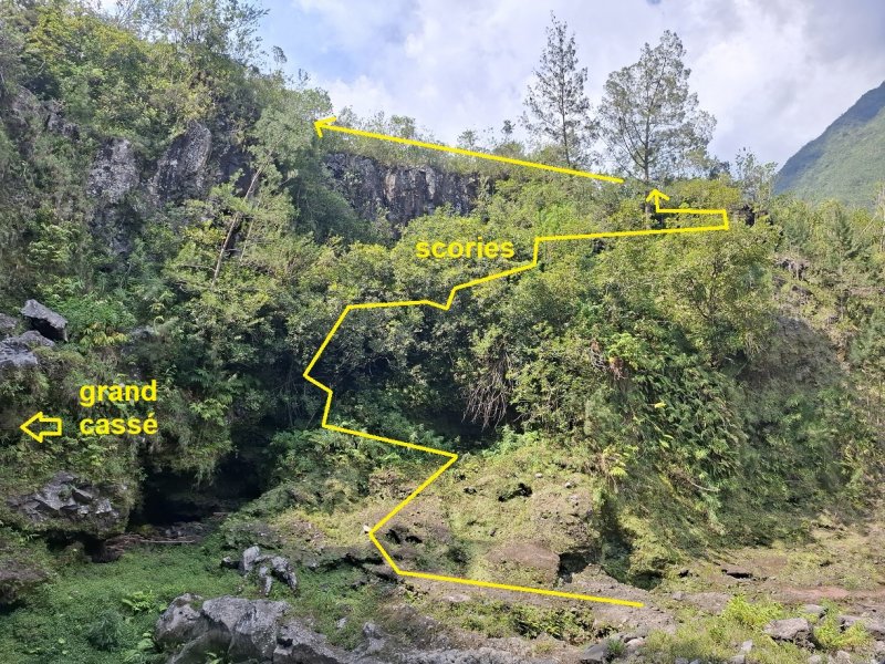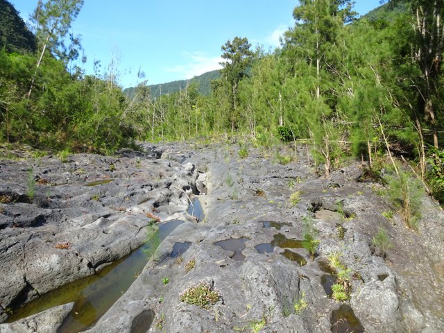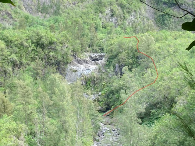 La randonnée débute en haut du village, un peu après l'école, à 550 m d'altitude. Emprunter la piste débutant entre les numéros 50 et 44, longer les propriétés en direction du rempart et de la Grande Ravine (Photo 1). On parvient rapidement à la ravine généralement à sec. Le chemin se poursuit sur un premier cassé qui n'est plus entretenu sur l'autre rive. Éviter le cassé en marchant vers l'aval en rive droite (Photo 2). Très vite, on se retrouve devant un nouveau cassé qui se contourne en pénétrant à droite dans les goyaviers où l'on suit un semblant de sentier menant au plus profond bassin de la journée. Impossible de poursuivre sans matériel comme le font les canyonistes (Photo 3). Tous les raccourcis de la fiche auront la même physionomie avec itinéraires plus ou moins visibles, traces de passages et même d'anciennes cultures (Photo 4). Faire demi-tour en remontant cette fois la ravine et le cassé, plus aisé que dans la descente, même s'il demande un peu d'habitude et d'agilité (Photo 5). L'obstacle franchi, marcher jusqu'au prochain et trouver le cairn discret en rive gauche, début du sentier traversant un ancien îlet au milieu des letchis et pieds de curcuma abandonnés. Moins de 200 m plus bas, rejoindre le haut de la Cascade Langevin. La vue sur le bassin est imprenable ainsi que sur les lacets de la route de Grand Galet (Photo 6). Si les roches sont sèches et qu'on ne souffre pas de vertige on peut se coucher pour apercevoir la chute elle-même, plus belle lorsqu'il y a beaucoup d'eau (Photo 7). Avant de reprendre le sentier de l'îlet abandonné, remonter un peu vers le bassin aperçu 15 minutes auparavant. Une corde usée permet d'en atteindre le fond pour apprécier l'immensité de la cavité remplie d'eau lors des cyclones (Photo 8). Reprendre le sentier jusqu'au cairn. C'en est fini des allers-retours ; on peut désormais remonter la Grande Ravine sans réfléchir à rien d'autre qu'à la manière de passer. La ravine est impressionnante par ses multiples cassés, ses petits canyons ou langues de lave surgies de nulle part (Photo 9). La pente est raisonnable et la marche assez rapide malgré le sol très inégal (Photo 10). Quand on parvient à un cassé plus important, repérer le moyen de l'escalader et trouver une échappatoire en cas d'impossibilité (Photo 11). La carte ci-dessous représente assez bien les contournements nécessaires lorsqu'ils s'éloignent du cours d'eau. 20 minutes après le chemin, la ravine passe dans l'étroit goulet très glissant d'un toboggan à sec. Les prises sont rares et les dérapages garantis (Photo 12). Poursuivre vers le nord sur de longs tronçons de galets, avec assez peu de paysages en direction du Morne Langevin (Photo 13). Le cassé suivant pourrait se franchir mais les marches sont trop hautes ; le contourner par la rive droite (Photo 14). Une grotte y abritait des statuettes malgaches qui ont disparu, emportées par le courant du dernier cyclone (Photo 15). Plus haut, les galets diminuent, remplacés par de très longues plaques basaltiques presque lisses où la vitesse de marche est multipliée par 4 (Photo 16). Les filaos qui tentent de coloniser seront vite emportés par les crues. Après 90 minutes depuis le chemin, c'est un profond gouffre qui apparaît au milieu de la ravine. Impossible d'en sortir en cas de chute (Photo 17). Poursuivre jusqu'à l'étroit goulet coudé et sculpté qui peut se remonter par le fond (Photo 18). L'imposante cassure qui se présente en amont est très bien indiquée sur la carte. Son escalade demande quelques efforts mais pas de compétence particulière (Photo 19). On retrouve les galets jusqu'au sentier de Cap Blanc (Photo 20). Dans les alentours se trouve un sentier remontant difficilement vers un îlet abandonné dont il ne reste que murets, cabane en tôle au milieu des touffes de bambous et un vieux puits d'eau croupie. De là, on a sous les yeux la Grande Ravine et le prochain cassé de l'aventure (Photo 21). Si, de loin, il paraît facile à franchir, il en va autrement quand on se retrouve au pied. Débute la partie la plus difficile de la boucle. Comme rien ne laisse prévoir une remontée facile, entamer le contournement par la rive gauche en escaladant la forte pente qui passe près d'une grotte, poursuivre par des passages glissants, escalader un arbre couché pour franchir une barre et suivre une douzaine de balises sur les goyaviers pour atteindre le lit (Photo 22). Du sommet, le double cassé domine la vallée. La suite de la montée est assez évidente entre longues portions de basalte ou petits cassés, même pieds nus pour les habitués (Photo 23). 10 minutes après un cassé surmonté de canalisations, on parvient à l'arche abritant son bassin trop souvent vide (Photo 24). La poursuite difficile est aléatoire. Quitter l'arche pour rejoindre le sentier de Cap Blanc, beaucoup plus fréquenté que ce qui vient d'être effectué ! 300 m plus loin, près d'un rocher en bordure de sentier, débute la trace menant aux cascades la Fouillée. Elle passe tout d'abord par un arbre tombé au sol, se poursuit par plusieurs détours parfois au bord du vide de la Grande Ravine, traverse de grandes surfaces de califons avant de se terminer à un cassé vertigineux (Photo 25). Remonter les derniers hectomètres sur le basalte bordant de grands précipices que l'on peut approcher (Photo 26). La remontée se termine à la dernière des cascades la Fouillée, la seule à couler de manière pérenne (Photo 27). La baignade est possible dans le bassin et il est bon de refaire le plein d'eau fraiche à la source coulant dans la grotte en rive droite. La pause peut durer tout le temps nécessaire à la récupération de cette courte mais sportive remontée de ravine à sec. Le retour s'effectue sur le sentier PR10 de Cap Blanc, maintes fois décrit sur la demi-douzaine de circuits proposés dans la région (Photo 28).