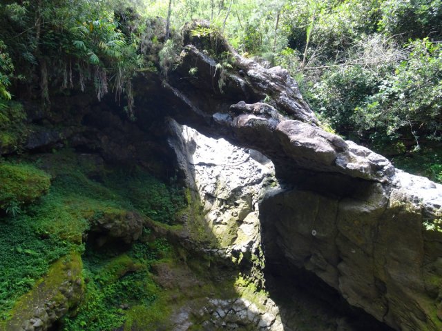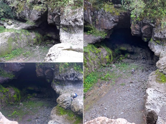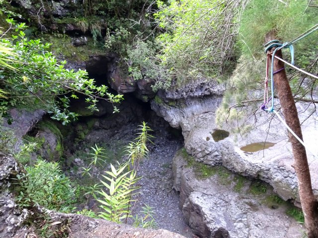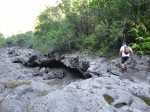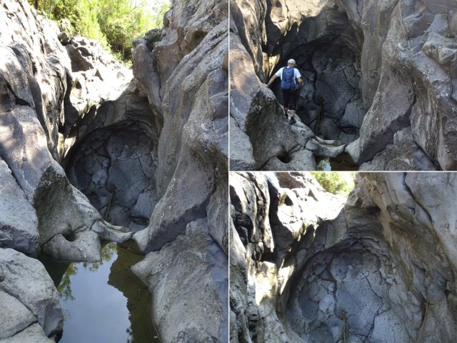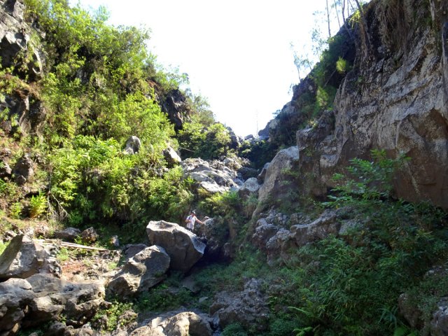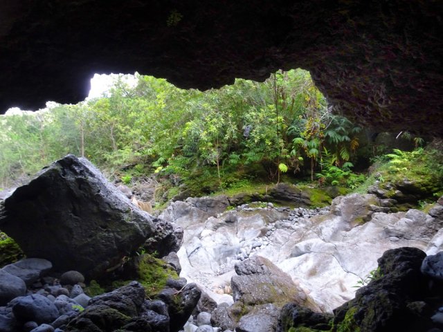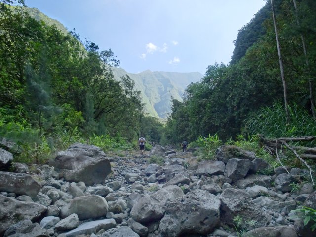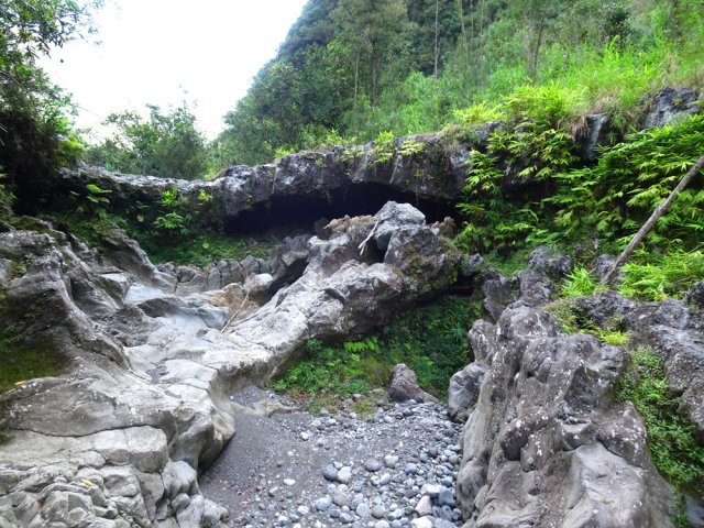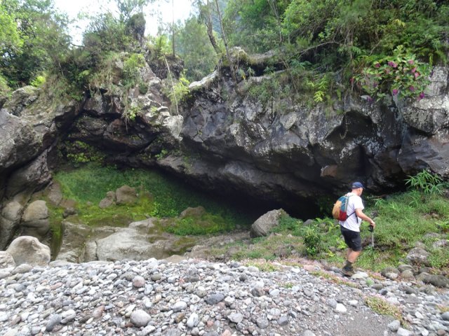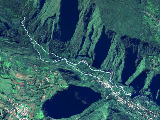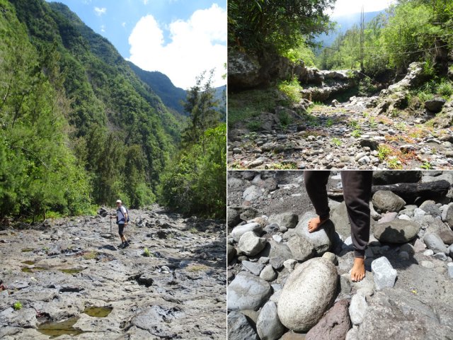 La randonnée débute en haut du village, un peu après l'école, à 550 m d'altitude. Emprunter la piste débutant entre les numéros 50 et 44, longer les propriétés en direction du rempart et de la Grande Ravine (Photo 1). On parvient rapidement à la ravine généralement à sec. Le chemin se poursuit sur un premier cassé qui n'est plus entretenu sur l'autre rive. Éviter le cassé en marchant vers l'aval en rive droite (Photo 2). Très vite, on se retrouve devant un nouveau cassé qui se contourne en pénétrant à droite dans les goyaviers où l'on suit un semblant de sentier menant au plus profond bassin de la journée. Impossible de poursuivre sans matériel comme le font les canyonistes (Photo 3). Tous les raccourcis de la fiche auront la même physionomie avec itinéraires plus ou moins visibles, traces de passages et même d'anciennes cultures (Photo 4). Faire demi-tour en remontant cette fois la ravine et le cassé, plus aisé que dans la descente, même s'il demande un peu d'habitude et d'agilité (Photo 5). L'obstacle franchi, marcher jusqu'au prochain et trouver le cairn discret en rive gauche, début du sentier traversant un ancien îlet au milieu des letchis et pieds de curcuma abandonnés. Moins de 200 m plus bas, rejoindre le haut de la Cascade Langevin. La vue sur le bassin est imprenable ainsi que sur les lacets de la route de Grand Galet (Photo 6). Si les roches sont sèches et qu'on ne souffre pas de vertige on peut se coucher pour apercevoir la chute elle-même, plus belle lorsqu'il y a beaucoup d'eau (Photo 7). Avant de reprendre le sentier de l'îlet abandonné, remonter un peu vers le bassin aperçu 15 minutes auparavant. Une corde usée permet d'en atteindre le fond pour apprécier l'immensité de la cavité remplie d'eau lors des cyclones (Photo 8). Reprendre le sentier jusqu'au cairn. C'en est fini des allers-retours ; on peut désormais remonter la Grande Ravine sans réfléchir à rien d'autre qu'à la manière de passer. La ravine est impressionnante par ses multiples cassés, ses petits canyons ou langues de lave surgies de nulle part (Photo 9). La pente est raisonnable et la marche assez rapide malgré le sol très inégal (Photo 10). Quand on parvient à un cassé plus important, repérer le moyen de l'escalader et trouver une échappatoire en cas d'impossibilité (Photo 11). La carte ci-dessous représente assez bien les contournements nécessaires lorsqu'ils s'éloignent du cours d'eau. 20 minutes après le chemin, la ravine passe dans l'étroit goulet très glissant d'un toboggan à sec. Les prises sont rares et les dérapages garantis (Photo 12). Poursuivre vers le nord sur de longs tronçons de galets, avec assez peu de paysages en direction du Morne Langevin (Photo 13). Le cassé suivant pourrait se franchir mais les marches sont trop hautes ; le contourner par la rive droite (Photo 14). Une grotte y abritait des statuettes malgaches qui ont disparu, emportées par le courant du dernier cyclone (Photo 15). Plus haut, les galets diminuent, remplacés par de très longues plaques basaltiques presque lisses où la vitesse de marche est multipliée par 4 (Photo 16). Les filaos qui tentent de coloniser seront vite emportés par les crues. Après 90 minutes depuis le chemin, c'est un profond gouffre qui apparaît au milieu de la ravine. Impossible d'en sortir en cas de chute (Photo 17). Poursuivre jusqu'à l'étroit goulet coudé et sculpté qui peut se remonter par le fond (Photo 18). L'imposante cassure qui se présente en amont est très bien indiquée sur la carte. Son escalade demande quelques efforts mais pas de compétence particulière (Photo 19). On retrouve les galets jusqu'au sentier de Cap Blanc (Photo 20). Dans les alentours se trouve un sentier remontant difficilement vers un îlet abandonné dont il ne reste que murets, cabane en tôle au milieu des touffes de bambous et un vieux puits d'eau croupie. De là, on a sous les yeux la Grande Ravine et le prochain cassé de l'aventure (Photo 21). Si, de loin, il paraît facile à franchir, il en va autrement quand on se retrouve au pied. Débute la partie la plus difficile de la boucle. Comme rien ne laisse prévoir une remontée facile, entamer le contournement par la rive gauche en escaladant la forte pente qui passe près d'une grotte, poursuivre par des passages glissants, escalader un arbre couché pour franchir une barre et suivre une douzaine de balises sur les goyaviers pour atteindre le lit (Photo 22). Du sommet, le double cassé domine la vallée. La suite de la montée est assez évidente entre longues portions de basalte ou petits cassés, même pieds nus pour les habitués (Photo 23). 10 minutes après un cassé surmonté de canalisations, on parvient à l'arche abritant son bassin trop souvent vide (Photo 24). La poursuite difficile est aléatoire. Quitter l'arche pour rejoindre le sentier de Cap Blanc, beaucoup plus fréquenté que ce qui vient d'être effectué ! 300 m plus loin, près d'un rocher en bordure de sentier, débute la trace menant aux cascades la Fouillée. Elle passe tout d'abord par un arbre tombé au sol, se poursuit par plusieurs détours parfois au bord du vide de la Grande Ravine, traverse de grandes surfaces de califons avant de se terminer à un cassé vertigineux (Photo 25). Remonter les derniers hectomètres sur le basalte bordant de grands précipices que l'on peut approcher (Photo 26). La remontée se termine à la dernière des cascades la Fouillée, la seule à couler de manière pérenne (Photo 27). La baignade est possible dans le bassin et il est bon de refaire le plein d'eau fraiche à la source coulant dans la grotte en rive droite. La pause peut durer tout le temps nécessaire à la récupération de cette courte mais sportive remontée de ravine à sec. Le retour s'effectue sur le sentier PR10 de Cap Blanc, maintes fois décrit sur la demi-douzaine de circuits proposés dans la région (Photo 28).