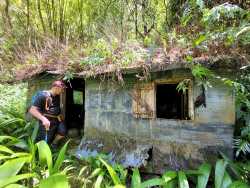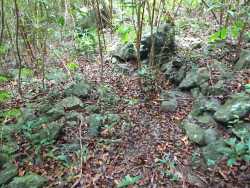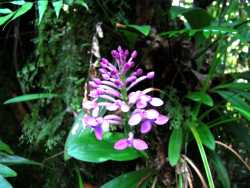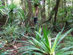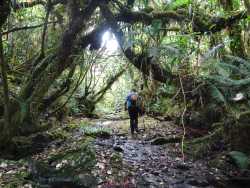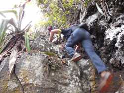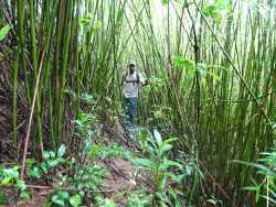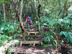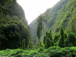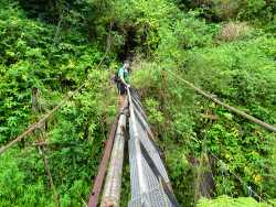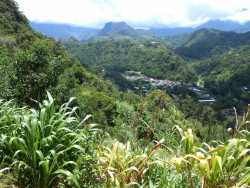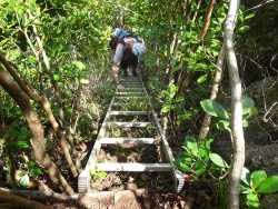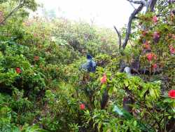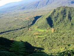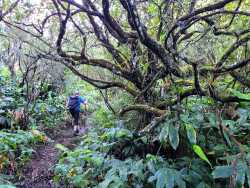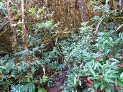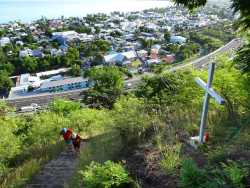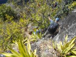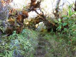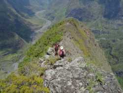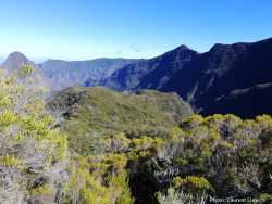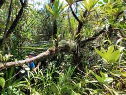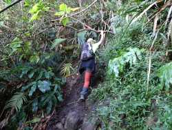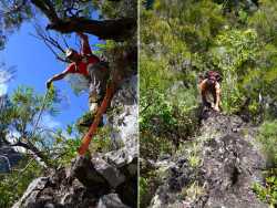 La végétation reprend si rapidement ses droits que les traces du sentier deviennent difficiles à suivre sans se griffer. L'icône n'indique pas que le coupe-coupe est obligatoire mais seulement recommandé sur certains tronçons. Rappel : ce n'est pas un crime de couper une vigne marronne, un galabert griffu, une longose gênante. En revanche, toucher à une seule branche de bois endémiques peut être puni par la loi.