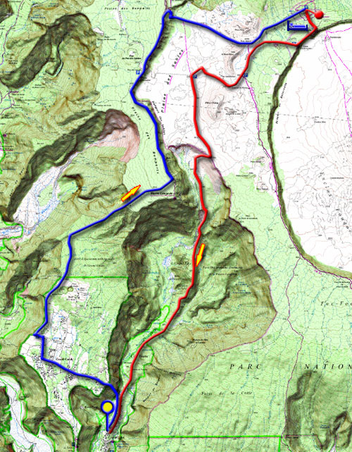 Depuis la remise en état du sentier marron de Grand Coude qui relie le village au sommet du Morne Langevin, cette boucle gagne à être connue puisque les difficultés d'orientation ont disparu en laissant cependant les parties très sportives. Le circuit de 37.5 km en quelques chiffres Première étape : 15.5 Km - D+ 1900 m - de 7 à 8 heures de marche Deuxième étape : 22 Km - D+ 100 m - de 7 à 8 heures Premier jour : Partir de Grand Galet qu'on aura rejoint en véhicule ou en bus. Traverser le village par le nord en direction de Cap Blanc. Ne pas manquer, sur la gauche, la station de chlorage qui sert de repère au départ du sentier Tarzan en direction de Grand Coude. La montée débute sous les bananiers et quelques champs avant d'entamer une très forte montée où les mains seront souvent indispensables. Le passage est étroit mais ne se perd jamais des yeux. Les racines et arbustes sont également très utiles pour s'agripper et se retenir. Quelques passages rocheux se passent dans les bambous balai mais ce sont les bois de couleurs qui sont les plus nombreux. En arrivant au bord du rempart, partir sur la droite et traverser le plateau de Grand Coude d'est en ouest en longeant la route principale jusqu'à l'église du village. Passer l'église et rejoindre le parking 200 m plus haut. Marcher vers le rempart et obliquer à droite pour remonter un large sentier bordé souvent de vigne marronne qui envahit parfois les abords et peut griffer. De belles volées de marches en rondin se succèdent dont quelques unes en forte pente. On parvient pourtant assez facilement aux cryptomerias et au kiosque de Grand Coude qui marque le début de la montée au morne. Bien aménagé en 2020, le sentier ondule dans la belle forêt sur des portions boueuses. Après la Ravine Galet Bleu, la pente débute et tout le sentier a été pourvu de centaines de hautes marches en bois. Ne pas réfléchir et monter à son rythme jusqu'à une première échelle après avoir bénéficié d'un promontoire rocheux pour de très beaux panoramas sur les vallées ou en direction du Piton des Neiges. La fin de la montée comporte autant de marches et de nouvelles échelles facilitant les franchissements rocheux. Une bonne partie de la montée s'effectue le long de l'arête. La montée se termine au bord du rempart pour de belles vues sur toute la région. Poursuivre en longeant le bord sud du Morne Langevin et atteindre sans difficulté le point de vue classique malgré les nombreuses pierres de basalte. Continuer par le sentier historique qui domine la vallée de Grand Pays et plus loin la Plaine des Sables pour de magnifiques panoramas vers le Chisny. Traverser la route du Pas des Sables et continuer à marcher le long du rempart de la Plaine des Sables en direction de l'Oratoire Ste-Thérèse. Le sentier est facile malgré quelques pentes ou glissades possibles. Il atteint l'oratoire après quelques points de vue sur le haut du Plateau des Basaltes qu'on traversera dans quelques minutes. Prendre le sentier qui atteint le plateau après une longue descente rocheuse. Après le plateau, entamer une série de lacets toujours aussi pierreux et arriver à la partie la plus facile de la journée par la traversée de la Plaine des Sables. Le sentier Josémont est totalement plat. Il passe plus loin au petit col entre le Piton Haüy et le Demi-Piton. Poursuivre par la gauche après le col et terminer cette montée au gîte du Volcan. Le lendemain, faire demi-tour par la piste jusqu'au départ du sentier de Grand Galet ou comme sur la carte ci-contre, remonter au Pas de Bellecombe en traversant la zone du sentier de découverte pour éviter de prendre deux fois le même itinéraire. Une fois sur le sentier de Grand Galet, marcher sur la Plaine des Sables en longeant le Piton Chisny ou en se promenant sur les zones colorées de la Plaine. Atteindre la grosse lèvre de basalte refroidi donnant sur Grand Pays et entamer la descente glissante jusqu'à la ravine de Grand Sable qu'on longera longtemps en marchant sur le fond à sec. Plus loin, à partir de 1750 m d'altitude, le sentier effectue une descente vertigineuse vers Grand Pays par d'interminables lacets. Le Grand Pays est une zone assez plate au fond de la vallée qui se traverse assez facilement sous les filaos ou dans les bois de couleurs. La dernière descente débute le long du rein et rejoint l'abri vieillissant avant de franchir le gué de la Grande Ravine. Effectuer une halte un peu plus bas en face de la cascade la Fouillée et poursuivre en traversant Cap Blanc et ses restes de cultures ou cases de plus en plus abandonnées. Le dernier gué caillouteux de la Grande Ravine annonce la fin proche de la descente. On rejoint la citerne d'eau puis le village en quelques minutes.