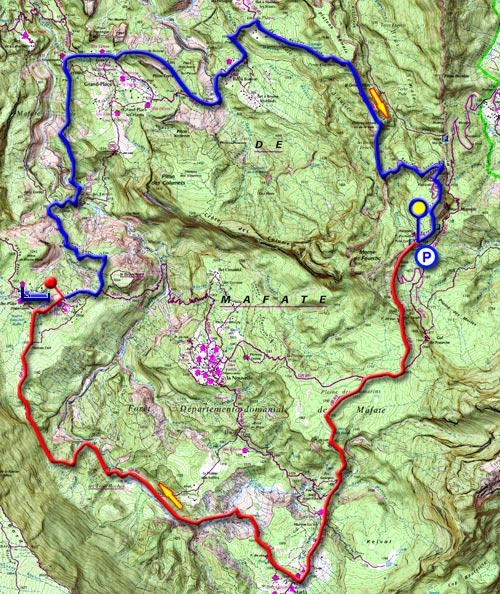 35 km en deux jours pour effectuer le tour complet de la Nouvelle sans y mettre les pieds permettra de se faire une très bonne idée du cirque de Mafate. Le circuit de 37 km en quelques chiffres Première étape : 15 Km - D+ 450 m - de 5 à 6 heures de marche Deuxième étape : 22 Km - D+ 1600 m - de 8 à 9 heures Premier jour : Partir du très classique parking payant du Piton Marmite où il est recommandé de laisser son véhicule. Remonter la RF du Haut Mafate jusqu'au Col des Bœufs en profitant des beaux points de vue sur le Gros Morne et la forêt de cryptomerias. Au col, entamer la descente sur hautes marches en pierre et quelques parties terreuses plus plates en admirant déjà la Plaine des Tamarins. Les premiers arbres endémiques font leur apparition au croisement du sentier du Col de Fourche. Plus bas, le terrain devient plus plat et le sentier est souvent constitué de buches destinées à isoler de la boue. On traverse des prairies couvertes de joncs et de tamarins où paissent tranquillement quelques bœufs. Prendre à gauche au premier croisement et partir en direction de Marla en marchant sous les tamarins. Le sentier passe près de la Mare des Serres qui est envahie de joncs. Un point de vue sur Marla donne une idée du chemin à parcourir pour l'atteindre. La plongée reprend sur des lacets d'un sentier pierreux jusqu'à la Rivière des Galets qu'on traverse à gué. Rejoindre sans difficulté Maison Laclos et Marla. Aux alentours de l'école, bifurquer à droite et entamer une nouvelle descente vers la rivière. La pente est tout d’abord aisée puis se complique à l'arrivée de pierriers instables. Le sol devient de plus en plus aride après les plantations de filaos. Quelques points de vue sur la vallée méritent de courtes haltes. La fin de la descente est marquée par un nouveau gué rocheux. Le sentier longe ensuite le cours d'eau en rive droite et s'élève pour franchir un rein. Terminer le contournement pas un escalier en bois et poursuivre le long de bassins et de larges plaques de basalte. Le sentier, rocheux et presque plat est reposant jusqu'à la cascade de Trois Roches. Une halte est possible sur les larges plaques rocheuses qui entourent l'étroit canyon. Franchir une troisième fois la Rivière des Galets et entamer une longue jonction toute en dents de scie et contournements divers pour longer le bas du rempart de Mafate. Au Plateau Cerf, filer tout droit vers l'école par une courte descente en lacets à moins de partir à droite si le gîte se trouve dans la partie est de l'îlet. Le lendemain, partir vers le Bronchard et obliquer à gauche en direction du petit cimetière qu'on rejoint après une descente sableuse. A partir du cimetière, le sentier va descendre de plus en plus sur de nombreuses marches qui, accumulées, fatiguent les jambes. Le sentier Dacerle longe plus bas la Ravine de Roche Plate puis la traverse près d'un bassin prisé des randonneurs cherchant un peu de fraîcheur. Partir à droite au prochain croisement et effectuer quelques montées et descentes sur nouveaux lacets vers la Roche Ancrée. Emprunter le prochain sentier partant vers Cayenne au lieu de traverser le gué près d'un large bassin connu pour la baignade. Le parcours suit ou traverse la Rivière des Galets avant de remonter vers Cayenne en franchissant de nombreuses ravines dont certaines sur passerelle. A Cayenne, traverser l'îlet et descendre vers la Ravine Fontaine surmontée de tous les tuyaux d'arrivée de l'eau. Entamer une forte montée sur sentier pierreux en lacets pour atteindre l'école de Grand Place. Continuer la montée vers le Plateau de Gousse sur un agréable sentier passant entre le Piton Carré et le Piton Bois Jaune. Retrouver le GRR2 et descendre pour franchir le Bras d'Oussy avant de remonter vers l'Îlet à Bourse. Poursuivre dans une forêt de filaos et entamer une belle descente sécurisée sur un sentier en lacets glissants. Franchir la Grande Ravine sur une petite passerelle et remonter assez fortement vers la Plaque, toujours sous les filaos. Bifurquer complètement à droite pour débuter la rude montée vers le Col des Bœufs par le sentier Scout. La pente est tout d’abord faible sous les filaos qui bordent les dernières habitations de l'Îlet à Malheur les Hauts. Pas de grandes difficultés jusqu'au bassin cimenté du captage Grimaud. Les choses sérieuses débutent ici par les premiers lacets, nombreux et serrés avec de très hautes marches par moments. Après 500 m de montée du sentier Scout, on suit l'arête plantée de filaos puis on pénètre dans une belle forêt sur le Plateau de la Sale. Les difficultés sont terminées mais pas la boucle. Il faut encore passer l'étroite arête de Deux Fesses et descendre l'escalier en pierre qui longe au plus près une falaise verticale. Des câbles viennent sécuriser en cas de vertige. Le parcours effectue enfin de longs détours pour franchir des petites ravines qui grossissent rapidement en cas de fortes pluies. Le sentier se termine à moins de deux kilomètres du parking laissé la veille. Il faut alors emprunter de longs lacets par la route sans trouver un quelconque raccourci.